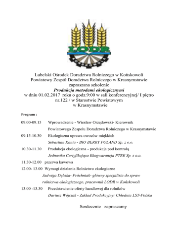 Lubelski Ośrodek Doradztwa Rolniczego w Końskowoli Powiatowy Zespół Doradztwa Rolniczego w Krasnymstawie zapraszana szkolenie Produkcja metodami ekologicznymi w dniu 01.02.2017 roku o godz.9:00 w sali konferencyjnej/ I piętro nr.122 / w Starostwie Powiatowym w Krasnymstawie Program : 09.00-09.15 Wprowadzenie - Wiesław Orzędowski- Kierownik Powiatowego Zespołu Doradztwa Rolniczego w Krasnymstawie 09.15-10.30 Ekologiczna uprawa owoców miękkich Sebastian Kania - BIO BERRY POLAND Sp. z o.o. 10.30-11.30 Produkcja ekologiczna - produkcja pod kontrolą Jednostka Certyfikująca Ekogwarancja PTRE Sp. z o.o. 11.30-12.00 przerwa kawowa 12.00- 13.00 Wymogi działania Rolnictwo ekologiczne Jadwiga Dębska- Próchniak- główny specjalista do spraw rolnictwa ekologicznego, pracownik LODR w Końskowoli 13.00 -13.30 Przedstawienie oferty handlowej dla rolników Dariusz Wójciak - Zakład Produkcyjny: Chłodnia LST-Polska Serdecznie zapraszamy