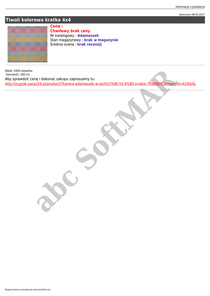 Informacje o produkcie Utworzono 08-03-2017 Tiwoli kolorowa kratka 4x4 Cena : Chwilowy brak ceny Nr katalogowy : Adamaszek Stan magazynowy : brak w magazynie Średnia ocena : brak recenzji Skład: 100% bawełna Szerokość: 160 cm ab c So ft M AR Aby sprawdzić cenę i dokonać zakupu zapraszamy tu: http://zygzak.pasaz24.pl/product/Tkanina-adamaszek-w-du%C5%BC%C4%85-kratke-709889?CategoryId=61942& Wygenerowano w programie www.oscGold.com