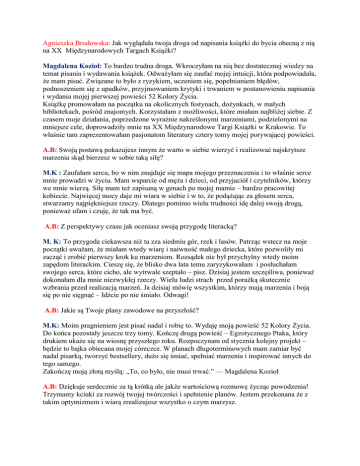 Agnieszka Brodowska: Jak wyglądała twoja droga od napisania książki do bycia obecną z nią na XX Międzynarodowych Targach Książki? Magdalena Kozioł: To bardzo trudna droga. Wkroczyłam na nią bez dostatecznej wiedzy na temat pisania i wydawania książek. Odważyłam się zaufać mojej intuicji, która podpowiadała, że mam pisać. Związane to było z ryzykiem, uczeniem się, popełnianiem błędów, podnoszeniem się z upadków, przyjmowaniem krytyki i trwaniem w postanowieniu napisania i wydania mojej pierwszej powieści 52 Kolory Życia. Książkę promowałam na początku na okolicznych festynach, dożynkach, w małych bibliotekach, pośród znajomych. Korzystałam z możliwości, które miałam najbliżej siebie. Z czasem moje działania, poprzedzone wyraźnie nakreślonymi marzeniami, podzielonymi na mniejsze cele, doprowadziły mnie na XX Międzynarodowe Targi Książki w Krakowie. To właśnie tam zaprezentowałam pasjonatom literatury cztery tomy mojej porywającej powieści. A.B: Swoją postawą pokazujesz innym że warto w siebie wierzyć i realizować najskrytsze marzenia skąd bierzesz w sobie taką siłę? M.K : Zaufałam sercu, bo w nim znajduje się mapa mojego przeznaczenia i to właśnie serce mnie prowadzi w życiu. Mam wsparcie od męża i dzieci, od przyjaciół i czytelników, którzy we mnie wierzą. Siłę mam też zapisaną w genach po mojej mamie – bardzo pracowitej kobiecie. Najwięcej mocy daje mi wiara w siebie i w to, że podążając za głosem serca, stwarzamy najpiękniejsze rzeczy. Dlatego pomimo wielu trudności idę dalej swoją drogą, ponieważ ufam i czuję, że tak ma być. A.B: Z perspektywy czasu jak oceniasz swoją przygodę literacką? M. K: To przygoda ciekawsza niż ta zza siedmiu gór, rzek i lasów. Patrząc wstecz na moje początki uważam, że miałam wtedy wiarę i naiwność małego dziecka, które pozwoliły mi zacząć i zrobić pierwszy krok ku marzeniom. Rozsądek nie był przychylny wtedy moim zapędom literackim. Cieszę się, że blisko dwa lata temu zaryzykowałam i posłuchałam swojego serca, które cicho, ale wytrwale szeptało – pisz. Dzisiaj jestem szczęśliwa, ponieważ dokonałam dla mnie niezwykłej rzeczy. Wielu ludzi strach przed porażką skutecznie wzbrania przed realizacją marzeń. Ja dzisiaj mówię wszystkim, którzy mają marzenia i boją się po nie sięgnąć – Idźcie po nie śmiało. Odwagi! A.B: Jakie są Twoje plany zawodowe na przyszłość? M.K: Moim pragnieniem jest pisać nadal i robię to. Wydaję moją powieść 52 Kolory Życia. Do końca pozostały jeszcze trzy tomy. Kończę drugą powieść – Egzotycznego Ptaka, który drukiem ukaże się na wiosnę przyszłego roku. Rozpoczynam od stycznia kolejny projekt – będzie to bajka obiecana mojej córeczce. W planach długoterminowych mam zamiar być nadal pisarką, tworzyć bestsellery, dużo się śmiać, spełniać marzenia i inspirować innych do tego samego. Zakończę moją złotą myślą: „To, co było, nie musi trwać.” — Magdalena Kozioł A.B: Dziękuje serdecznie za tą krótką ale jakże wartościową rozmowę życząc powodzenia! Trzymamy kciuki za rozwój twojej twórczości i spełnienie planów. Jestem przekonana że z takim optymizmem i wiarą zrealizujesz wszystko o czym marzysz.