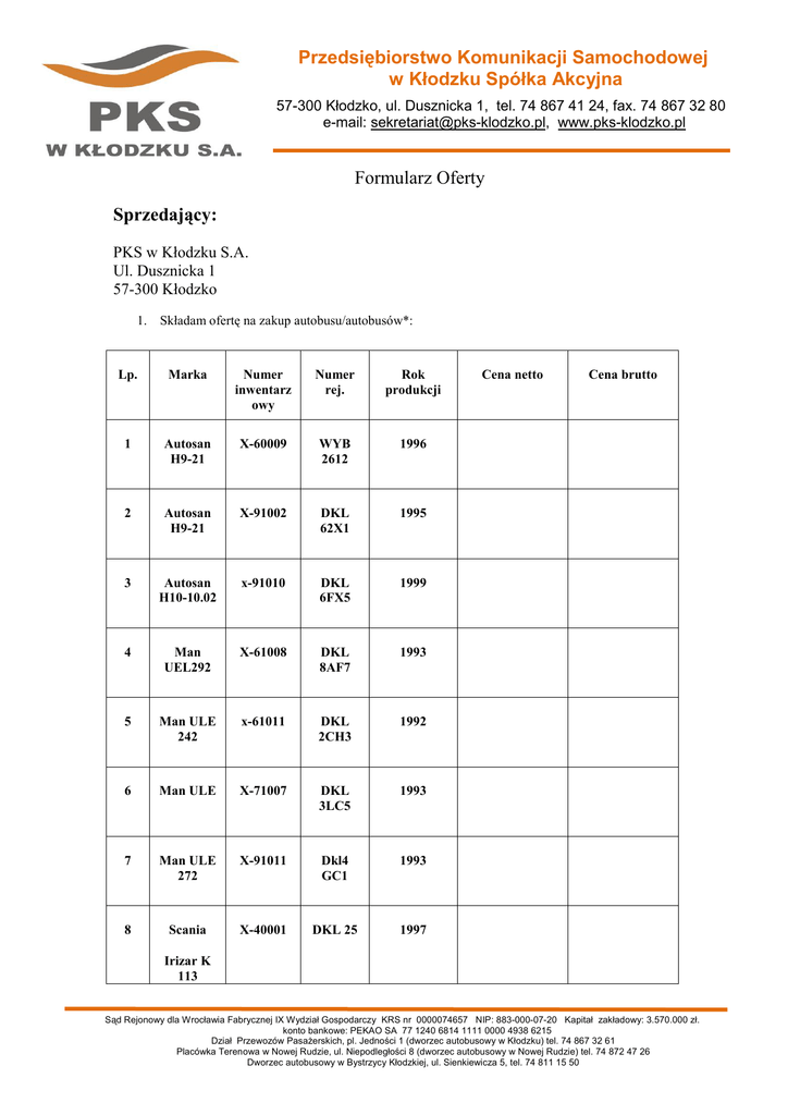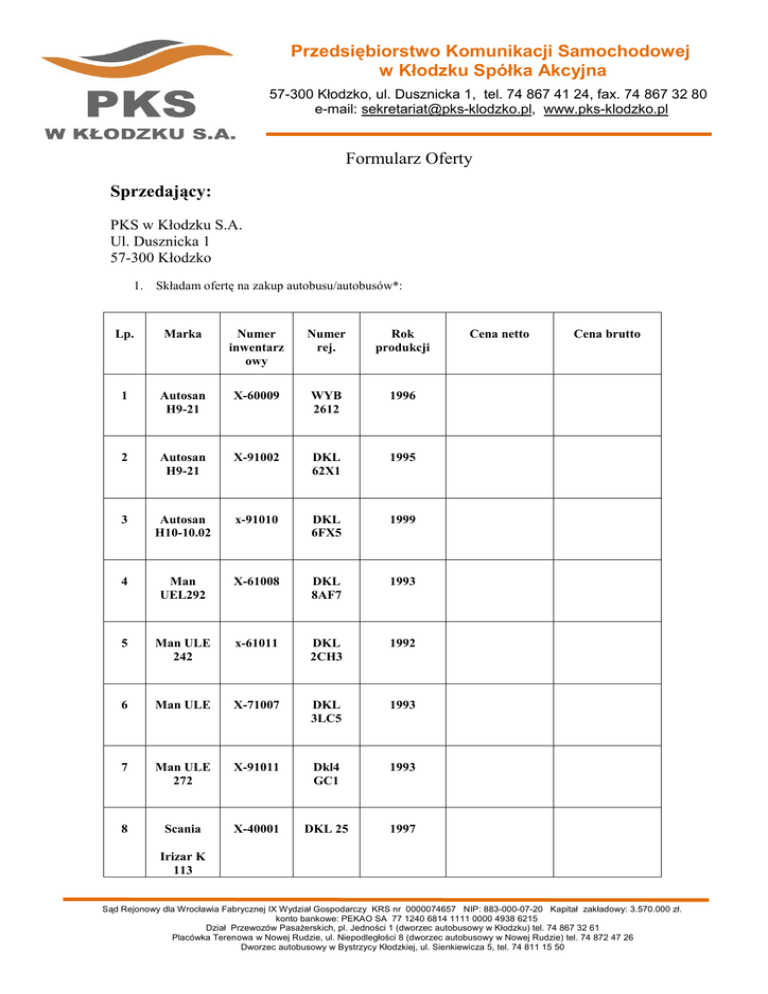 Przedsiębiorstwo Komunikacji Samochodowej w Kłodzku Spółka Akcyjna 57-300 Kłodzko, ul. Dusznicka 1, tel. 74 867 41 24, fax. 74 867 32 80 e-mail: [email protected], www.pks-klodzko.pl Formularz Oferty Sprzedający: PKS w Kłodzku S.A. Ul. Dusznicka 1 57-300 Kłodzko 1. Składam ofertę na zakup autobusu/autobusów*: Lp. Marka Numer inwentarz owy Numer rej. Rok produkcji 1 Autosan H9-21 X-60009 WYB 2612 1996 2 Autosan H9-21 X-91002 DKL 62X1 1995 3 Autosan H10-10.02 x-91010 DKL 6FX5 1999 4 Man UEL292 X-61008 DKL 8AF7 1993 5 Man ULE 242 x-61011 DKL 2CH3 1992 6 Man ULE X-71007 DKL 3LC5 1993 7 Man ULE 272 X-91011 Dkl4 GC1 1993 8 Scania X-40001 DKL 25 1997 Cena netto Cena brutto Irizar K 113 Sąd Rejonowy dla Wrocławia Fabrycznej IX Wydział Gospodarczy KRS nr 0000074657 NIP: 883-000-07-20 Kapitał zakładowy: 3.570.000 zł. konto bankowe: PEKAO SA 77 1240 6814 1111 0000 4938 6215 Dział Przewozów Pasażerskich, pl. Jedności 1 (dworzec autobusowy w Kłodzku) tel. 74 867 32 61 Placówka Terenowa w Nowej Rudzie, ul. Niepodległości 8 (dworzec autobusowy w Nowej Rudzie) tel. 74 872 47 26 Dworzec autobusowy w Bystrzycy Kłodzkiej, ul. Sienkiewicza 5, tel. 74 811 15 50 Przedsiębiorstwo Komunikacji Samochodowej w Kłodzku Spółka Akcyjna 57-300 Kłodzko, ul. Dusznicka 1, tel. 74 867 41 24, fax. 74 867 32 80 e-mail: [email protected], www.pks-klodzko.pl * - proszę podać cenę przy autobusie , którego kupnem są Państwo zainteresowani (w przypadku braku zainteresowania danym autobusem proszę wstawić poziomą kreskę). Kupujący: Imię i nazwisko / nazwa firmy Adres Nr telefonu Nr faksu Adres e-mail 2. Oświadczam, iż odbiorę pojazd do 5 dni od dnia powiadomienia o wyborze. 3. Oświadczam , iż dokonam zapłaty za autobus/ autobusy najpóźniej w dniu odbioru autobusu. Sąd Rejonowy dla Wrocławia Fabrycznej IX Wydział Gospodarczy KRS nr 0000074657 NIP: 883-000-07-20 Kapitał zakładowy: 3.570.000 zł. konto bankowe: PEKAO SA 77 1240 6814 1111 0000 4938 6215 Dział Przewozów Pasażerskich, pl. Jedności 1 (dworzec autobusowy w Kłodzku) tel. 74 867 32 61 Placówka Terenowa w Nowej Rudzie, ul. Niepodległości 8 (dworzec autobusowy w Nowej Rudzie) tel. 74 872 47 26 Dworzec autobusowy w Bystrzycy Kłodzkiej, ul. Sienkiewicza 5, tel. 74 811 15 50