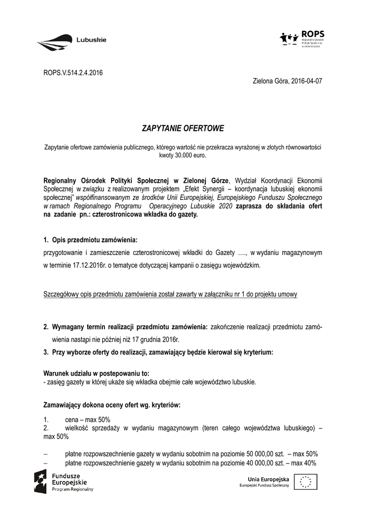 ROPS.V.514.2.4.2016 Zielona Góra, 2016-04-07 ZAPYTANIE OFERTOWE Zapytanie ofertowe zamówienia publicznego, którego wartość nie przekracza wyrażonej w złotych równowartości kwoty 30.000 euro. Regionalny Ośrodek Polityki Społecznej w Zielonej Górze, Wydział Koordynacji Ekonomii Społecznej w związku z realizowanym projektem „Efekt Synergii – koordynacja lubuskiej ekonomii społecznej” współfinansowanym ze środków Unii Europejskiej, Europejskiego Funduszu Społecznego w ramach Regionalnego Programu Operacyjnego Lubuskie 2020 zaprasza do składania ofert na zadanie pn.: czterostronicowa wkładka do gazety. 1. Opis przedmiotu zamówienia: przygotowanie i zamieszczenie czterostronicowej wkładki do Gazety …., w wydaniu magazynowym w terminie 17.12.2016r. o tematyce dotyczącej kampanii o zasięgu wojewódzkim. Szczegółowy opis przedmiotu zamówienia został zawarty w załączniku nr 1 do projektu umowy 2. Wymagany termin realizacji przedmiotu zamówienia: zakończenie realizacji przedmiotu zamówienia nastąpi nie później niż 17 grudnia 2016r. 3. Przy wyborze oferty do realizacji, zamawiający będzie kierował się kryterium: Warunek udziału w postepowaniu to: - zasięg gazety w której ukaże się wkładka obejmie całe województwo lubuskie. Zamawiający dokona oceny ofert wg. kryteriów: 1. cena – max 50% 2. wielkość sprzedaży w wydaniu magazynowym (teren całego województwa lubuskiego) – max 50% płatne rozpowszechnienie gazety w wydaniu sobotnim na poziomie 50 000,00 szt. – max 50% płatne rozpowszechnienie gazety w wydaniu sobotnim na poziomie 40 000,00 szt. – max 40% płatne rozpowszechnienie gazety w wydaniu sobotnim na poziomie 20 000,00 szt. – max 30% płatne rozpowszechnienie gazety w wydaniu sobotnim na poziomie 10 000,00 szt. – max 20% płatne rozpowszechnienie gazety w wydaniu sobotnim na poziomie 5 000,00 szt. – max 10% Płatne rozpowszechnienie zostanie potwierdzone oświadczeniem Wykonawcy, natomiast Zamawiający na etapie podpisania umowy, zażąda potwierdzenia przedstawionych danych przez Związek Kontroli Dystrybucji Prasy. 4. Wykonawca składając ofertę zobowiązany jest złożyć następujące dokumenty: 1) formularz oferty wg załączonego wzoru , 2) zaparafowany wzór/projekt umowy (jeśli dotyczy), 3) deklaracja Wykonawcy z danymi osoby, która wejdzie w skład grupy roboczej Regionalnego Komitetu Ekonomii Społecznej ds. współpracy z mediami (opis w załączniku nr 1) – deklaracja wg. własnego wzoru, 4) odpis aktualny KRS, 5) mapka zasięgu, 6) badanie czytelnictwa, 7) oświadczenie potwierdzające płatne rozpowszechnienie gazety w wydaniu sobotnim. 5. Opis sposobu obliczenia ceny w składanej ofercie: Cena powinna zawierać: 1) wartość dostawy*/usługi*/roboty budowlanej* określoną w oparciu o przedmiot zamówienia, 2) obowiązujący podatek od towarów i usług (VAT), 3) cena podana przez Wykonawcę za świadczoną usługę, dostawę, robotę budowlaną* jest obowiązująca przez okres ważności umowy * i nie będzie podlegała waloryzacji w okresie jej trwania. 6. Zamawiający wybierze ofertę z najniższą ceną oraz spełniającą wymagane warunki zamawiającego określone w pkt. 1,2. 7. Opis sposobu przygotowania oferty: 1) Należy ją złożyć w kopercie, 2) Na kopercie należy umieścić nazwę i adres wykonawcy oraz zamawiającego tj. Regionalny Ośrodek Polityki Społecznej w Zielonej Górze, Al. Niepodległości 36, 65-042 Zielona Góra, oferta na zadanie pn.: czterostronicowa wkładka do gazety. 3) Cena podana w złożonej ofercie ma być podana cyfrowo i słownie. Oferta cenowa winna być sporządzona wyłącznie w języku polskim i musi obejmować całość zamówienia. Formularz należy wypełnić czytelną i trwałą techniką. 8. Miejsce i termin złożenia oferty : 1) Ofertę należy złożyć w terminie do dnia 15.04.2016r., do godz. 15:00 w siedzibie zamawiającego, tj. w Regionalnym Ośrodku Polityki Społecznej w Zielonej Górze, Al. Niepodległości 36, 65-042 Zielona Góra. lub na adres: [email protected] w treści przesłanej wiadomości w tytule wpisać : oferta na zadanie pn.: czterostronicowa wkładka do gazety dodatkowo: wiadomości nadać status: wysoka ważność oraz zażądać potwierdzenia dostarczenia wiadomości. 2) Oferta otrzymana przez zamawiającego po terminie podanym powyżej zostanie wykonawcy zwrócona. 9. Miejsce i termin otwarcia oferty (jeśli dotyczy): 10. Osobami uprawnionymi do kontaktów z wykonawcami są: Agnieszka Krzaczkowska, główny specjalista, Wydział Koordynacji Ekonomii Społecznej, tel. 68 323 19 26. Wszelkie pytania dotyczące zapytania ofertowego proszę kierować wyłącznie e mailem na adres: [email protected] 11. Informacje dotyczące zawierania umowy. Umowa musi uwzględniać wszystkie aspekty złożonej propozycji cenowej.* 12. Zamawiający informuje, iż podpisanie umowy na realizację usługi z wybranym Wykonawcą nastąpi nie później niż 30 dni od dnia podpisania Decyzji o dofinansowaniu projektu „Efekt Synergii – koordynacja lubuskiej ekonomii społecznej”. 13. Zamawiający może unieważnić zamówienie publiczne bez podania przyczyny. Załączniki do zapytania ofertowego: 1. wzór oferty 2. projekt umowy 3. szczegółowy opis przedmiotu zamówienia * niepotrzebne skreślić/wpisywać, jeżeli dotyczy