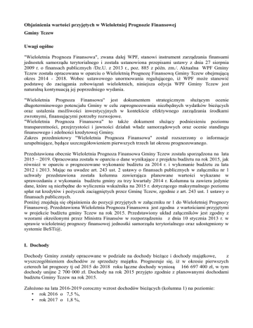 Objaśnienia wartości przyjętych w Wieloletniej Prognozie Finansowej Gminy Tczew Uwagi ogólne "Wieloletnia Prognoza Finansowa", zwana dalej WPF, stanowi instrument zarządzania finansami jednostek samorządu terytorialnego i została ustanowiona przepisami ustawy z dnia 27 sierpnia 2009 r. o finansach publicznych /Dz.U. z 2013 r., poz. 885 z późn. zm./. Aktualna WPF Gminy Tczew została opracowana w oparciu o Wieloletnią Prognozę Finansową Gminy Tczew obejmującą okres 2014 - 2018. Wobec ustawowego unormowania regulującego, iż WPF może stanowić podstawę do zaciągania zobowiązań wieloletnich, niniejsza edycja WPF Gminy Tczew jest naturalną kontynuacją jej poprzedniego wydania. "Wieloletnia Prognoza Finansowa" jest dokumentem strategicznym służącym ocenie długoterminowego potencjału Gminy w celu zaprognozowania niezbędnych wydatków bieżących oraz ustalenia możliwości inwestycyjnych w kontekście efektywnego zarządzania środkami zwrotnymi, finansującymi potrzeby rozwojowe. "Wieloletnia Prognoza Finansowa" to także dokument służący podniesieniu poziomu transparentności, przejrzystości i jawności działań władz samorządowych oraz ocenie standingu finansowego i zdolności kredytowej Gminy. Zakres przedmiotowy "Wieloletnia Prognoza Finansowa" został rozszerzony o informacje uzupełniające, będące uszczegółowieniem pierwszych trzech lat okresu prognozowanego. Przedstawiona obecnie Wieloletnia Prognoza Finansowa Gminy Tczew została sporządzona na lata 2015 – 2019. Opracowana została w oparciu o dane wynikające z projektu budżetu na rok 2015, jak również w oparciu o prognozowane wykonanie budżetu za 2014 r. i wykonanie budżetu za lata 2012 i 2013. Mając na uwadze art. 243 ust. 2 ustawy o finansach publicznych w załączniku nr 1 uchwały przedstawiona została kolumna zawierająca planowane wartości wykazane w sprawozdaniu z wykonania budżetu gminy za trzy kwartały 2014 r. Kolumna ta zawiera jedynie dane, które są niezbędne do wyliczenia wskaźnika na 2015 r. dotyczącego maksymalnego poziomu spłat rat kredytów i pożyczek zaciągniętych przez Gminę Tczew, zgodnie z art. 243 ust. 1 ustawy o finansach publicznych. Poniżej znajdują się objaśnienia do pozycji przyjętych w załączniku nr 1 do Wieloletniej Prognozy Finansowej. Przedstawiona Wieloletnia Prognoza Finansowa jest zgodna z wartościami przyjętymi w projekcie budżetu gminy Tczew na rok 2015. Przedstawiony układ załączników jest zgodny z wzorami określonymi przez Ministra Finansów w rozporządzeniu z dnia 10 stycznia 2013 r. w sprawie wieloletniej prognozy finansowej jednostki samorządu terytorialnego oraz udostępniony w systemie BeSTi@. I. Dochody Dochody Gminy zostały opracowane w podziale na dochody bieżące i dochody majątkowe, z wyszczególnieniem dochodów ze sprzedaży majątku. Prognozuje się, iż w okresie pierwszych czterech lat prognozy tj od 2015 do 2018 roku łączne dochody wyniosą 166 697 400 zł, w tym dochody unijne 2 700 000 zł. Dochody na rok 2015 przyjęto zgodnie z planowanymi dochodami budżetu Gminy Tczew na rok 2015. Założono na lata 2016-2019 coroczny wzrost dochodów bieżących (kolumna 1) na poziomie: • rok 2016 o 7,5 %, • rok 2017 o 1,8 %, • • rok 2018 o 0,1 %, rok 2019 o 1,0 %. Przy planowaniu dochodów z podatków i opłat przyjęto coroczną waloryzację stawek podatku oraz zakłada się wzrost wpływów z podatku od nieruchomości spowodowany zwiększeniem liczby podmiotów gospodarczych oraz rozpoczętą budową hal przez podmioty gospodarcze. Prognozuje się, iż dochody z tytułu udziału we wpływach z podatku dochodowego od osób fizycznych w lata 2016-2018 wyniosą 21 531 000 zł . W perspektywie najbliższych lat przewiduje się następującą dynamikę dochodów z PIT: w stosunku do poprzedniego roku w 2017 r. i 2018 r. wzrosną o 6,0 % i 2,5%.Czynnikiem decydującym w omawianej kwestii jest rozwój budownictwa mieszkaniowego i wzrost liczby ludności charakteryzującej się korzystną ze względów demograficznych strukturą wiekową. W pozycji dochody majątkowe (kolumna 1.2.2) na lata 2015 - 2017 przyjęto planowane dochody ze środków z Unii Europejskiej, które wynikają z planowanych przedsięwzięć realizowanych przy udziale środków, o których mowa w art. 5 ust. 1 pkt 2 i 3 ustawy o finansach publicznych. W ramach dochodów majątkowych mieszczą się również dochody ze sprzedaży majątku (kolumna 1.2.1). Dochody ze sprzedaży majątku zostały zaplanowane w oparciu o szacunek własny. II. Wydatki Poziom prognozowanych wydatków zdeterminowany jest zakresem realizowanych zadań oraz możliwościami finansowymi Gminy Tczew. Poziom prognozowanych wydatków wpisuje się w konsekwentnie realizowany program ograniczenia deficytu budżetu Gminy, z perspektywą generowania nadwyżek budżetowych począwszy od 2016 r. Działanie to jest niezbędne dla sukcesywnej, planowanej spłaty zadłużenia. Założony poziom wydatków zapewnia jednocześnie realizację strategicznego celu Gminy jakim jest zagwarantowanie środków na modernizację i poprawę konkurencyjności Gminy. Reasumując prognozowany poziom wydatków Gminy w WPF 2015-2019 zapewnia w prognozowanym okresie spłatę zadłużenia Gminy przy zagwarantowaniu środków na rozwój. Zgodnie z Prognozą łączne wydatki w latach 2015-2019 wyniosą 206 070 550 zł, z tego wydatki bieżące 170 297 900 zł i wydatki majątkowe 35 772 650 zł ( 17,36 % wydatków ogółem). W perspektywie najbliższych pięciu lat przewiduje się następującą dynamikę wydatków: w 2015 r. w stosunku do poprzedniego roku zmaleją o 11,53 %,w 2016 r. zmaleją o 8,75 %, w 2017 r. wzrosną o 1,96 %, w 2018 r. wzrosną o 0,59 %, w 2019 r. wzrosną o 1,12 %. Dane te ulegną zmianie z uwagi na przewidywane włączenie do prognozy środków z Unii Europejskiej z kolejnego okresu programowania rozpoczynającego się od 2015 roku. Ograniczenia formalno - prawne dla wyd