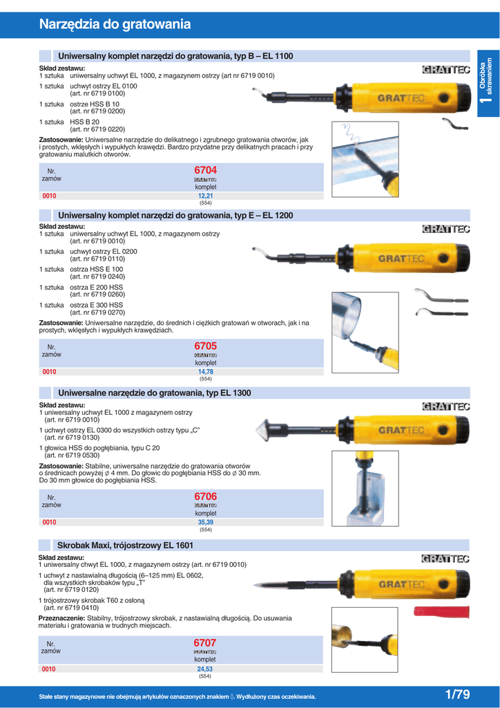 Narz´dzia do gratowania Obróbka skrawaniem Uniwersalny komplet narz´dzi do gratowania, typ B – EL 1100 Sk∏ad zestawu: 1 sztuka uniwersalny uchwyt EL 1000, z magazynem ostrzy (art nr 6719 0010) 1 1 sztuka uchwyt ostrzy EL 0100 (art. nr 6719 0100) 1 sztuka ostrze HSS B 10 (art. nr 6719 0200) 1 sztuka HSS B 20 (art. nr 6719 0220) Zastosowanie: Uniwersalne narz´dzie do delikatnego i zgrubnego gratowania otworów, jak i prostych, wkl´s∏ych i wypuk∏ych kraw´dzi. Bardzo przydatne przy delikatnych pracach i przy gratowaniu malutkich otworów. 6704 Nr. zamów komplet 12,21 0010 (554) Uniwersalny komplet narz´dzi do gratowania, typ E – EL 1200 Sk∏ad zestawu: 1 sztuka uniwersalny uchwyt EL 1000, z magazynem ostrzy (art. nr 6719 0010) 1 sztuka uchwyt ostrzy EL 0200 (art. nr 6719 0110) 1 sztuka ostrza HSS E 100 (art. nr 6719 0240) 1 sztuka ostrza E 200 HSS (art. nr 6719 0260) 1 sztuka ostrza E 300 HSS (art. nr 6719 0270) Zastosowanie: Uniwersalne narz´dzie, do Êrednich i ci´˝kich gratowaƒ w otworach, jak i na prostych, wkl´s∏ych i wypuk∏ych kraw´dziach. 6705 Nr. zamów komplet 14,78 0010 (554) Uniwersalne narz´dzie do gratowania, typ EL 1300 Sk∏ad zestawu: 1 uniwersalny uchwyt EL 1000 z magazynem ostrzy (art. nr 6719 0010) 1 uchwyt ostrzy EL 0300 do wszystkich ostrzy typu „C” (art. nr 6719 0130) 1 g∏owica HSS do pog∏´biania, typu C 20 (art. nr 6719 0530) Zastosowanie: Stabilne, uniwersalne narz´dzie do gratowania otworów o Êrednicach powy˝ej l 4 mm. Do g∏owic do pog∏´biania HSS do l 30 mm. Do 30 mm g∏owice do pog∏´biania HSS. 6706 Nr. zamów komplet 35,39 0010 (554) Skrobak Maxi, trójostrzowy EL 1601 Sk∏ad zestawu: 1 uniwersalny chwyt EL 1000, z magazynem ostrzy (art. nr 6719 0010) 1 uchwyt z nastawialnà d∏ugoÊcià (6–125 mm) EL 0602, dla wszystkich skrobaków typu „T” (art. nr 6719 0120) 1 trójostrzowy skrobak T60 z os∏onà (art. nr 6719 0410) Przeznaczenie: Stabilny, trójostrzowy skrobak, z nastawialnà d∏ugoÊcià. Do usuwania materia∏u i gratowania w trudnych miejscach. Nr. zamów 0010 6707 komplet 24,53 (554) Sta∏e stany magazynowe nie obejmujà artyku∏ów oznaczonych znakiem ◊. Wyd∏u˝ony czas oczekiwania. 1/79 1 Obróbka skrawaniem Narz´dzia do gratowania Softgrip, narz´dzie do gratowania SG 1000 Sk∏ad zestawu: 1 mocny uchwyt, ukszta∏towany ergonomicznie, dopasowany do kszta∏tu d∏oni z magazynem na ostrza (art. nr 6719 0020) 1 ostrze HSS B Plus 10 S (art. nr 6719 0210) 1 ostrze HSS-E Plus 100 S (art. nr 6719 0250) Zastosowanie: Jedyny w swoim rodzaju uchwyt, z bliêniaczymi mocowaniami, dla wszystkich ostrzy, z chwytem l 2,6 mm i l 3,2 mm. Ergonomiczne, por´czny uchwyt. Informacje dodatkowe: Ostrza Plus wykazuj´ si´ wysokà trwa∏oÊcià. Nadajà si´ do stali nierdzewnych. do l 2,6 mm fürchwy∏u Ø 2,6 mm Schaft do l 3,2 mm fürchwy∏u Ø 3,2 mm Schaft 6708 Nr. zamów komplet 15,57 0010 (554) Softgrip, narz´dzie do gratowania SG 1500 Sk∏ad zestawu: 1 mocny uchwyt Softgrip SG 3000, ukszta∏towany ergonomicznie, dopasowany do kszta∏tu d∏oni z magazynem na ostrza (art. nr 6719 0020) 1 wygi´ta g∏owica do pog∏´biania BC 1650 l 3,2 mm, l zewn´trzna 16,5 mm (art. nr 6719 0500) Zastosowanie: Jedyny w swoim rodzaju uchwyt, z bliêniaczymi mocowaniami, do wszystkich ostrzy, z chwytem l 2,6 mm i l 3,2 mm. W po∏àczeniu z g∏owicà do pog∏´biania umo˝liwia szybsze i mniej ucià˝liwe pog∏´bianie i fazowanie otworów do l 16,5 mm. 6709 Nr. zamów do l 2,6 mm für chwy∏u Ø 2,6 mm Schaft komplet 31,70 0010 do l 3,2 mm für chwy∏u Ø 3,2 mm Schaft (554) Softgrip, narz´dzie do fazowania SG 1100 Sk∏ad zestawu: 1 mocny chwyt SG 3000, ukszta∏towany ergonomicznie z uchwytem na ostrza (art. nr 6719 0020) 1 wygi´ta koƒcówka do fazowania EX 2000 l 3,2 mm, l zewn´trzna 4–18 mm (art. nr 6719 0500) Zastosowanie: Jedyny w swoim rodzaju uchwyt, z bliêniaczymi mocowaniami, dla wszystkich ostrzy, z chwytem l 2,6 mm i l 3,2 mm W po∏àczeniu z g∏owicà do fazowania umo˝liwia szybsze i mniej ucià˝liwe pog∏´bianie i gratowanie okràg∏ych materia∏ów do l 18 mm. 6710 Nr. zamów do l 2,6 mm für chwy∏u Ø 2,6 mm Schaft komplet 25,87 0010 do l 3,2 mm für chwy∏u Ø 3,2 mm Schaft (554) Gratownik i punktak SG 1200, z ergonomicznym uchwytem Sk∏ad zestawu: 1 mocny chwyt SG 3000, ukszta∏towany ergonomicznie, dopasowany do kszta∏tu d∏oni z magazynem na ostrza (nr art. 6719 0020) 1 wygi´ta koƒcówka do podcinania i gratowania BO 1000 chwyt l 3,2 mm (nr art. 6719 0300) Zastosowanie: Jedyny w swoim rodzaju uchwyt, z bliêniaczymi mocowaniami, dla wszystkich ostrzy, z chwytem l 2,6 mm i l 3,2 mm. Dzi´ki opatentowanemu ostrzu mo˝na bez problemów gratowaç wewn´trzne podci´cia, pierÊcienie zabezpieczajàce mo˝na bezproblemowo gratowaç. Nr. zamów 0010 6711 komplet 21,06 für chwy∏u Ø 2,6 mm Schaft do l 2,6 mm do l 3,2 mm für chwy∏u Ø 3,2 mm Schaft (554) 1/80 Sta∏e stany magazynowe dostepne w ciagu 48 godz. Wszystkie ceny podane w Euro (za sztuk´) bez podatku VAT (jak inaczej nieoznaczone). Narz´dzia do gratowania Obróbka skrawaniem Dwustronny gratownik do blach DB 2000 Sk∏ad zestawu: 1 stabilny uchwyt z ochronà r´ki 1 2 ostrza tnàce HSS N 80 (art. nr 6719 0600) Zastosowanie: Równoczesne, obustronne gratowanie blach i ˝eber, o gruboÊci do 12 mm. Dla blach nierdzewnych mo˝na otrzymaç odpowiednie ostrza N 80 M (art. nr 6719 0610). 6712 Nr. zamów komplet 23,07 0010 (554) Szybki gratownik RB 1000 Sk∏ad zestawu: 1 szeÊciokàtny, aluminiowy uchwyt l 12 mm, ze stalowym mocowaniem ostrza, 1 ostrze HSS-E 100, wymienne (art. nr 6719 0240) Zastosowanie: Bardzo precyzyjne, r´czne narz´dzie, do miejscowego gratowania. Z wymiennym ostrzem. 6713 Nr. zamów komplet 9,07 0010 (554) Ceramiczne narz´dzie do gratowania Idealne narz´dzie do materia∏ów sprawiajàcych problemy przy gratowaniu, takich jak tworzywa sztuczne lub metale lekkie. Zalety: 1. Supe