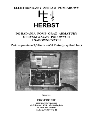 ELEKTRONICZNY ZESTAW POMIAROWY HERBST DO BADANIA POMP ORAZ ARMATURY OPRYSKIWACZY POLOWYCH I SADOWNICZYCH Zakres pomiaru 7,5 l/min – 650 l/min (przy 0-40 bar) Importer: EKOTRONIC mgr inż. Marek Janus ul. Mieszka I 4/14, 42–500 Będzin tel. / fax 032 7618484 tel. kom. 0601 70 42 15 Mikrokomputer z wyświetlaczem LCD, możliwość transferu danych do PC poprzez złącze RS232 (Windows Hyperterminal), zasilanie akumulatorowe Pomiar przepływu cieczy w zakresie 7,5 l/min – 650 l/min przy regulowanym ciśnieniu 0 – 10 bar Pomiar przepływu cieczy w zakresie 7,5 l/min – 300 l/min przy regulowanym ciśnieniu 0 – 40 bar Kontrola wskazań manometrów w zakresie 0 – 60 bar z wykorzystaniem ciśnieniomierza elektronicznego o zakresie pracy do 120 bar Kontrola wydatku pomp oraz dokładności wskazań przepływomierzy i manometrów wg przepisów BBA Dokładność pomiaru: 0 –6 bar < 0,1 bar; 6 – 16 bar < 0,25 bar; 16 – 60 bar < 1,0 bar System adapterów umożliwiający badanie manometrów bez konieczności ich demontażu (opcja) Bezkontaktowy pomiar prędkości obrotowej WOM ciągnika w zakresie 0 – 1000 obr./min. Automatyczny pomiar przepływu cieczy przy zaprogramowanym poziomie ciśnienia roboczego Wbudowany filtr ciśnieniowy oraz zawór bezpieczeństwa Posiada atest BBA oraz PTB Tylko jeden przepływomierz dla całego zakresu pomiaru Niezależne zasilanie akumulatorowe zapewniające min. 12 godz. pracy Wielofunkcyjny czterowierszowy wyświetlacz LCD zapewniający równoczesne wyświetlanie wszystkich danych pomiarowych Poręczny, wyjmowany mikrokomputer z wyświetlaczem Automatyczne przyporządkowanie wszystkich danych pomiarowych kolejnemu numerowi klienta z datą i godziną wykonania pomiaru Pamięć RAM o pojemności 100 rekordów, każdy z 10 danymi pomiarowymi Transfer danych w formie tabeli do PC poprzez złącze szeregowe RS 232 Data Godzina 12.06.1999 9:02 12.06.1999 9:02 12.06.1999 9:03 12.06.1999 9:06 12.06.1999 9:16 12.06.1999 9:17 12.06.1999 9:18 12.06.1999 9:25 12.06.1999 9:58 12.06.1999 9:59 Klient Nr 1, 2, 1, 3, 1, 4, 1, 5, 2, 1, 2, 2, 3, 1, 4, 1, 5, 1, 5, 2, Bar 6.6 9.9 15.0 21.2 30.3 34.9 39.0 39.2 11.0 21.2 l/min 233.6 227.9 227.6 204.6 225.7 224.3 121.0 196.1 304.6 299.1 U/min 541 541 541 541 539 539 531 550 600 600 Wbudowany filtr ciśnieniowy oraz zawór bezpieczeństwa Możliwa kalibracja elektronicznego czujnika, zbędna wymiana drogiego i wrażliwego manometru pomiarowego Jedyne urządzenie o takich właściwościach na polskim rynku! Elektroniczny zestaw pomiarowy HERBST ROT służy do kompleksowego badania armatury opryskiwaczy polowych oraz sadowniczych, stanowi profesjonalny zestaw narzędzi pomiarowych w Stacjach Kontroli Opryskiwaczy. Zakres pomiarowy urządzenia, jego dokładność pomiarowa, możliwość współpracy z PC oraz prostota obsługi sprawia że jest to jedyny na rynku produkt o takich parametrach, zapewniający możliwość badania wszystkich typów opryskiwaczy. Pomiar przepływu cieczy zostaje przeprowadzony automatycznie po wcześniejszym zaprogramowaniu tzw. ciśnienia referencyjnego, a uzyskane dane pomiarowe zostają wprowadzone do pamięci podręcznej mikrokomputera. Zamontowane 2 zawory dławiące umożliwiają pomiar wydatku pompy przy regulowanym, rzeczywistym jej obciążeniu. Układ cieczowy zestawu pomiarowego zabezpieczony jest zaworami bezpieczeństwa. W pełni przenośny (przewoźny) zestaw zbudowany jest z komponentów odpornego na uderzenia tworzywa oraz stali nierdzewnej. Przeźroczysty, poliwęglanowy odcinek armatury pomiarowej umożliwia bezpośrednią obserwację przepływającej cieczy w celu stwierdzenia szczelności układu cieczowego opryskiwacza (pęcherzyki powietrza). Pomiar zjawiska pulsacji pompy w pełnym zakresie pomiarowym. Bagnetowy czujnik ciśnienia umożliwia kontrolę wskazań manometrów w zakresie 0 – 60 bar bez konieczności ich demontażu. Sprawne i bezproblemowe podłączanie urządzenia do wszystkich typów opryskiwaczy polowych i sadowniczych zapewnia system uniwersalnych szybkozłączy ciśnieniowych. Urządzenie pracuje w układzie zamkniętego obiegu cieczy, nie wymaga dodatkowych zbiorników i basenów. Pomiar prędkości obrotowej WOM ciągnika odbywa się bezkontaktowo poprzez sensorowy czujnik zbliżeniowy. Kalibracja zastosowanych czujników sensorowych odbywa się na poziomie oprogramowania mikrokomputera i nie wymaga ich wymiany. Elektroniczny zestaw pomiarowy HERBST ROT – idealnym zestawem przyrządów pomiarowych w każdej Stacji Kontroli Opryskiwaczy HERBST Przedstawiciel w Polsce: EKOTRONIC mgr inż. Marek Janus Tel. 032/761 8484, 0601 704215