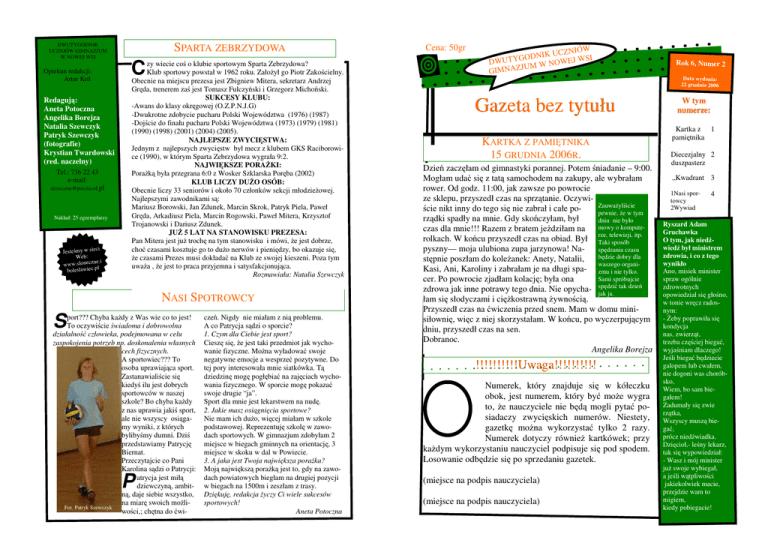 DWUTYGODNIK UCZNIÓW GIMNAZJUM W NOWEJ WSI Opiekun redakcji: Artur Kril Redaguj : Aneta Potoczna Angelika Borejza Natalia Szewczyk Patryk Szewczyk (fotografie) Krystian Twardowski (red. naczelny) Tel.: 736 22 43 e-mail: [email protected] Nakład: 25 egzemplarzy ci Jeste my w sie Web: e.i www.sloneczn boleslawiec.pl SPARTA ZEBRZYDOWA C zy wiecie co o klubie sportowym Sparta Zebrzydowa? Klub sportowy powstał w 1962 roku. Zało ył go Piotr Zako cielny. Obecnie na miejscu prezesa jest Zbigniew Mitera, sekretarz Andrzej Gr da, trenerem za jest Tomasz Fulczy ski i Grzegorz Micho ski. SUKCESY KLUBU: -Awans do klasy okr gowej (O.Z.P.N.J.G) -Dwukrotne zdobycie pucharu Polski Województwa (1976) (1987) -Doj cie do finału pucharu Polski Województwa (1973) (1979) (1981) (1990) (1998) (2001) (2004) (2005). NAJLEPSZE ZWYCI STWA: Jednym z najlepszych zwyci stw był mecz z klubem GKS Raciborowice (1990), w którym Sparta Zebrzydowa wygrała 9:2. NAJWI KSZE PORA KI: Pora k była przegrana 6:0 z Wosker Szklarska Por ba (2002) KLUB LICZY DU O OSÓB: Obecnie liczy 33 seniorów i około 70 członków sekcji młodzie owej. Najlepszymi zawodnikami s : Mariusz Borowski, Jan Zdunek, Marcin Skrok, Patryk Piela, Paweł Gr da, Arkadiusz Piela, Marcin Rogowski, PawełMitera, Krzysztof Trojanowski i Dariusz Zdunek. JU 5 LAT NA STANOWISKU PREZESA: Pan Mitera jest ju troch na tym stanowisku i mówi, e jest dobrze, cho czasami kosztuje go to du o nerwów i pieni dzy, bo okazuje si , e czasami Prezes musi dokłada na Klub ze swojej kieszeni. Poza tym uwa a , e jest to praca przyjemna i satysfakcjonuj ca. Rozmawiała: Natalia Szewczyk NASI SPOTROWCY S port??? Chyba ka dy z Was wie co to jest! To oczywi cie wiadoma i dobrowolna działalno człowieka, podejmowana w celu zaspokojenia potrzeb np. doskonalenia własnych cech fizycznych. A sportowiec??? To osoba uprawiaj ca sport. Zastanawiali cie si kiedy ilu jest dobrych sportowców w naszej szkole? Bo chyba ka dy z nas uprawia jaki sport, ale nie wszyscy osi gamy wyniki, z których byliby my dumni. Dzi przedstawiamy Patrycj Biernat. Przeczytajcie co Pani Karolina s dzi o Patrycji: atrycja jest mił dziewczyn , ambitn , daje siebie wszystko, na miar swoich mo liFot. Patryk Szewczyk wo ci,; ch tna do wi- P cze . Nigdy nie miałam z ni problemu. A co Patrycja s dzi o sporcie? 1. Czym dla Ciebie jest sport? Ciesz si , e jest taki przedmiot jak wychowanie fizyczne. Mo na wyładowa swoje negatywne emocje a wesprze pozytywne. Do tej pory interesowała mnie siatkówka. T dziedzin mog pogł bia na zaj ciach wychowania fizycznego. W sporcie mog pokaza swoje drugie “ja”. Sport dla mnie jest lekarstwem na nud . 2. Jakie masz osi gni cia sportowe? Nie mam ich du o, wi cej miałam w szkole podstawowej. Reprezentuj szkol w zawodach sportowych. W gimnazjum zdobyłam 2 miejsce w biegach gminnych na orientacj , 3 miejsce w skoku w dal w Powiecie. 3. A jaka jest Twoja najwi ksza pora ka? Moj najwi ksz pora k jest to, gdy na zawodach powiatowych biegłam na drugiej pozycji w biegach na 1500m i zeszłam z trasy. Dzi kuj , redakcja yczy Ci wiele sukcesów sportowych! Aneta Potoczna Cena: 50gr W UCZNIÓ I GODNIK DWUTY M W NOWEJ WS JU Z A N GIM Gazeta bez tytułu KARTKA Z PAMI TNIKA 15 GRUDNIA 2006R. Dzie zacz łam od gimnastyki porannej. Potem niadanie – 9:00. Mogłam uda si z tat samochodem na zakupy, ale wybrałam rower. Od godz. 11:00, jak zawsze po powrocie ze sklepu, przyszedłczas na sprz tanie. OczywiZauwa yli cie cie nikt inny do tego si nie zabrałi całe popewnie, e w tym rz dki spadły na mnie. Gdy sko czyłam, był dniu nie było czas dla mnie!!! Razem z bratem je dziłam na mowy o komputetelewizji, itp. rolkach. W ko cu przyszedłczas na obiad. Był rze, Taki sposób pyszny— moja ulubiona zupa jarzynowa! Nasp dzania czasu b dzie dobry dla st pnie poszłam do kole anek: Anety, Natalii, waszego organiKasi, Ani, Karoliny i zabrałam je na długi spa- zmu i nie tylko. Sami spróbujcie cer. Po powrocie zjadłam kolacj ; była ona dzi tak dzie zdrowa jak inne potrawy tego dnia. Nie opycha- sp jak ja. łam si słodyczami i ci kostrawn ywno ci . Przyszedłczas na wiczenia przed snem. Mam w domu minisiłowni , wi c z niej skorzystałam. W ko cu, po wyczerpuj cym dniu, przyszedłczas na sen. Dobranoc. Angelika Borejza !!!!!!!!!!Uwaga!!!!!!!!!! Numerek, który znajduje si w kółeczku obok, jest numerem, który by mo e wygra to, e nauczyciele nie b d mogli pyta posiadaczy zwyci skich numerów. Niestety, gazetk mo na wykorzysta tylko 2 razy. Numerek dotyczy równie kartkówek; przy ka dym wykorzystaniu nauczyciel podpisuje si pod spodem. Losowanie odb dzie si po sprzedaniu gazetek. (miejsce na podpis nauczyciela) (miejsce na podpis nauczyciela) Rok 6, Numer 2 Data wydania: 22 grudnia 2006 W tym numerze: Kartka z 1 pami tnika Diecezjalny 2 duszpasterz „Kwadrant 3 1Nasi sportowcy 2Wywiad 4 Ryszard Adam Gruchawka O tym, jak nied wied był ministrem zdrowia, i co z tego wynikło Ano, misiek minister spraw ogólnie zdrowotnych opowiedziałsi gło no, w tonie wr cz radosnym: - eby poprawiła si kondycja nas, zwierz t, trzeba cz ciej biega , wyja niam dlaczego! Je li biega b dziecie galopem lub cwałem, nie dogoni was choróbsko, Wiem, bo sam biegałem! Zadumały si zwie rz tka, Wszyscy musz biega , prócz nied wiadka. Dzi cioł,- le ny lekarz, tak si wypowiedział: - Wasz i mój minister ju swoje wybiegał, a je li w tpliwo ci jakiekolwiek macie, przejdzie wam to migiem, kiedy pobiegacie! DIECEZJALNY DUSZPASTERZ SPORTOWCÓW port- to dziedzina, która jest rozpowszechniona na całym wiecie. Uprawiaj go ludzie, niezale nie od wieku, płci a nawet wagi. Mo na powiedzie , e sportem zajmuj si prawie wszyscy. Nawet duchowni. Doskonałym przykładem jest nasz szkolny duszpasterz - Ks. Remigiusz Tobera, który niedawno zostałdiecezjalnym duszpasterzem sportowców. Zapewne zastanawiacie si , co to oznacza? Czym taka osoba si zajmuje? O to samo zapytałam ks. Remigiusza. Posłuchajcie! 1. Co to zn