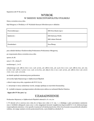 Sygnatura akt IV Ka 520/14 WYROK W IMIENIU RZECZYPOSPOLITEJ POLSKIEJ Dnia 5 września 2014 roku. Sąd Okręgowy w Świdnicy w IV Wydziale Karnym Odwoławczym w składzie: Przewodniczący : SSO Ewa Rusin (spr.) Sędziowie : SSO Sylwana Wirth SSO Adam Pietrzak Protokolant : Ewa Ślemp przy udziale Barbary Chodorowskiej Prokuratora Prokuratury Okręgowej, po rozpoznaniu dnia 5 września 2014 roku sprawy A. S. syna J. i H. z domu P. urodzonego (...) w Z. oskarżonego z art. 286 § 1 k.k. w zw. z art. 12 k.k., art. 286 § 1 k.k., art. 13 § 1 k.k. w zw. z art. 286 § 1 k.k., art. 275 § 1 k.k. i art. 278 § 1 i 5 k.k. w zw. z art. 11 § 2 k.k., art. 284 § 1 k.k. w zw. z art. 12 k.k., art. 286 § 1 k.k. i art. 270 § 1 k.k. w zw. z art. 11 § 2 k.k. na skutek apelacji wniesionej przez prokuratora od wyroku Sądu Rejonowego w Ząbkowicach Śląskich z dnia 6 maja 2014 roku, sygnatura akt II K 772/13 I. utrzymuje w mocy zaskarżony wyrok, uznając apelację za oczywiście bezzasadną; II. wydatki związane z postępowaniem odwoławczym zalicza na rachunek Skarbu Państwa. Sygn.akt IV Ka 520/ 14 UZASADNIENIE Prokurator Rejonowy w Ząbkowicach Śląskich oskarżył A. S. o to, że: I. W okresie od 21 czerwca 2011 roku do 10 lipca 2011 roku w Z. woj. (...) działając z góry powziętym zamiarem oraz w krótkich odstępach czasu oraz w celu osiągnięcia korzyści majątkowej doprowadził K. S. do niekorzystnego rozporządzenia mieniem, w ten sposób, iż pożyczył od niej łączną kwotę 1.800 zł na leczenie oraz pochówek członków rodziny, nie mając zamiaru zwrotu pożyczonej kwoty, czym działał na szkodę K. S. tj. o czyn z art. 286 § 1 kk w zw. z art. 12 kk II. W dniu 12 kwietnia 2012 roku w B. woj. (...), działając w celu osiągnięcia korzyści majątkowej doprowadził firmę (...) K. A. do niekorzystnego rozporządzenia mieniem, w ten sposób, iż pobrał w tej firmie meble balkonowe i przedpokojowe o łącznej wartości 1.950 zł, nie mając zamiaru zapłaty za pobrane meble ani zwrotu tych mebli, czym działał na szkodę K. A. tj. o czyn z art. 286 § 1 kk III. Wiosną 2011 roku w Z. woj. (...), działając w celu osiągnięcia korzyści majątkowej, doprowadził Zgromadzenie Sióstr (...)do niekorzystnego rozporządzenia mieniem, w ten sposób, iż pożyczył od siostry T. Ż. kwotę 500 zł na leczenie swojej chorej mamy, nie mając zamiaru zwrotu tej kwoty, czym działał na szkodę Zgromadzenia Sióstr (...) w Z. tj. o czyn z art. 286 § 1 kk IV. Wiosną 2011 roku w Z. woj. (...), działając w celu osiągnięcia korzyści majątkowej doprowadził Rektora (...)ks. K. K. do niekorzystnego rozporządzenia mieniem, w ten sposób, iż pożyczył od niego kwotę 1.000 zł na leczenie swojej chorej mamy, nie mając zamiaru zwrotu tych pieniędzy, czym działał na szkodę K. K.. tj. o czyn z art. 286 § 1 kk V. We wrześniu 2011 roku w H. woj. (...) działając w celu osiągnięcia korzyści majątkowej, doprowadził L. C. do niekorzystnego rozporządzenia mieniem, w ten sposób, iż pożyczył od niego kwotę 1.000 zł na operację jego chorej matki, nie mając zamiaru zwrotu tych pieniędzy, czym działał na szkodę L. C. tj. o czyn z art. 286 § 1 kk VI. We wrześniu 2011 roku w Z. woj. (...) działając w celu osiągnięcia korzyści majątkowej doprowadził A. F. do niekorzystnego rozporządzenia mieniem, w ten sposób, iż pożyczył od niego kwotę 500,- złotych na leczenie chorej mamy, nie mając zamiaru zwrotu tych pieniędzy, czym działał na szkodę A. F. tj. o czyn z art. 286 § 1 kk VII. W lutym 2011 roku w H. woj. (...) działając w celu osiągnięcia korzyści majątkowej doprowadził E. R. do niekorzystnego rozporządzenia mieniem, w ten sposób, że pożyczył od niego kwotę 500 zł na leczenie swojej chorej mamy, nie mając zamiaru zwrotu tych pieniędzy, czym działał na szkodę E. R.. tj. o czyn z art. 286 § 1 kk VIII. W kwietniu 2013 roku w Z. woj. (...) działając w celu osiągnięcia korzyści majątkowej doprowadził właścicielki sklepu z firankami przy ul. (...) do niekorzystnego rozporządzenia mieniem, że pożyczył od K. M. i J. K. łączną kwotę 100 zł na leki dla siebie, nie mając zamiaru zwrotu tych pieniędzy, czym działał na szkodę K. M. i J. K. tj. o czyn z art. 286 § 1 kk IX. Na przełomie 2012/2013 roku w Z. woj. (...) działając w celu osiągnięcia korzyści majątkowej doprowadził M. B. do niekorzystnego rozporządzenia mieniem, w ten sposób, iż pożyczył od niej pieniądze w kwocie 1000,- złotych na leczenie chorej mamy, nie mając zamiaru zwrotu tych pieniędzy, czym działał na szkodę M. B. tj. o czyn z art. 286 § 1 kk X. Na przełomie 2012/2013 roku w Z. woj. (...) działając w celu osiągnięcia korzyści majątkowej doprowadził M. B. do niekorzystnego rozporządzenia mieniem, w ten sposób, iż wynajął on mieszkanie od pokrzywdzonej, położone w (...) nr (...) w Z.. nie mając zamiaru regulowania czynszu na łączną kwotę 1000,- złotych, czym działał na szkodę M. B. tj. o czyn z art. 286 § 1 kk XI. W marcu 2013 roku w Z. woj. (...) działając w celu osiągnięcia korzyści majątkowej doprowadził M. P. do niekorzystnego rozporządzenia mieniem, w ten sposób, że pożyczył od niego pieniądze w kwocie 300,- złotych na leczenie chorej mamy, nie mając zamiaru zwrotu tych pieniędzy, czym działał na szkodę M. P.. tj. o czyn z art. 286 § 1 kk XII. Jesienią 2012 roku w Z. woj. (...) działając w celu osiągnięcia korzyści majątkowej usiłował doprowadzić E. C. do niekorzystnego rozporządzenia mieniem, w ten sposób, iż chciał pożyczyć od niej kwotę 2.000 zł na leczenie swojej chorej mamy, nie mając zamiaru zwrotu tych pieniędzy, lecz zamierzonego celu nie osiągnął, z przyczyn od siebie niezależnych. tj. o czyn z art. 13 § 1 kk w zw. z art. 286 § 1 kk XIII. We wrześniu 2011 roku w Z. woj. (...) zabrał w celu przywłaszczenia portfel z zawartością dowodu osobistego wy