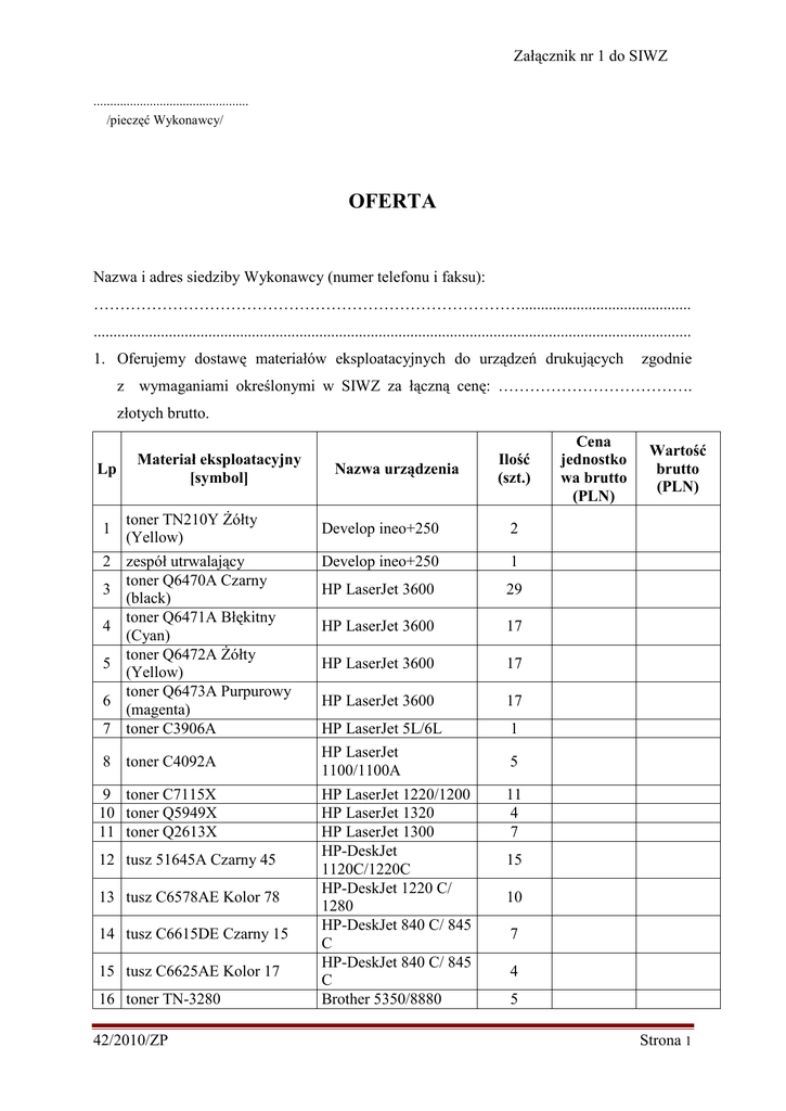Załącznik nr 1 do SIWZ ............................................... /pieczęć Wykonawcy/ OFERTA Nazwa i adres siedziby Wykonawcy (numer telefonu i faksu): ………………………………………………………………………........................................... ....................................................................................................................................................... 1. Oferujemy dostawę materiałów eksploatacyjnych do urządzeń drukujących zgodnie z wymaganiami określonymi w SIWZ za łączną cenę: ………………………………. złotych brutto. Lp 1 2 3 4 5 6 7 Materiał eksploatacyjny [symbol] toner TN210Y śółty (Yellow) zespół utrwalający toner Q6470A Czarny (black) toner Q6471A Błękitny (Cyan) toner Q6472A śółty (Yellow) toner Q6473A Purpurowy (magenta) toner C3906A 8 toner C4092A 9 toner C7115X 10 toner Q5949X 11 toner Q2613X 12 tusz 51645A Czarny 45 13 tusz C6578AE Kolor 78 14 tusz C6615DE Czarny 15 15 tusz C6625AE Kolor 17 16 toner TN-3280 42/2010/ZP Nazwa urządzenia Ilość (szt.) Develop ineo+250 2 Develop ineo+250 1 HP LaserJet 3600 29 HP LaserJet 3600 17 HP LaserJet 3600 17 HP LaserJet 3600 17 HP LaserJet 5L/6L 1 HP LaserJet 1100/1100A HP LaserJet 1220/1200 HP LaserJet 1320 HP LaserJet 1300 HP-DeskJet 1120C/1220C HP-DeskJet 1220 C/ 1280 HP-DeskJet 840 C/ 845 C HP-DeskJet 840 C/ 845 C Brother 5350/8880 Cena jednostko wa brutto (PLN) Wartość brutto (PLN) 5 11 4 7 15 10 7 4 5 Strona 1 Załącznik nr 1 do SIWZ 17 18 19 20 21 22 23 24 25 26 27 28 29 30 bęben DR-3200 toner TN-3170 taśma DK-22212 taśma TZ-SE Security 8 mm taśma TZ-231 zółta 12 mm taśma TZ-231 biała 12 mm PGI-5BK Tusz Czarny CLI-8C Tusz Błękitny CLI-8Y Tusz śółty CLI-8M Tusz Purpurowy taśma winylowa 9mm x 5,5 biała bęben światłoczuły KXFA78 kaseta z tonerem KX-FA83 bęben światłoczuły KXFA84 31 toner Canon FX-10 Brother 5350/8880 Brother 5250 Brother QL-580N Brother P-Touch Brother P-Touch Brother P-Touch Canon PIXMA iX4000 Canon PIXMA iX4000 Canon PIXMA iX4000 Canon PIXMA iX4000 5 5 2 2 2 2 4 4 4 4 Rhino 6000 10 Panasonic KX-FL 503 5 Panasonic KX-FL 513 Panasonic KX-FL 513, 613 telefax Canon L-120, L-160 30 10 100 2. Cena zaoferowana w ofercie jest ceną ostateczną i nie podlega negocjacjom w trakcie trwania niniejszej procedury o udzielenie zamówienia publicznego. 3. Oświadczamy, Ŝe zapoznaliśmy się ze SIWZ i nie wnosimy do niej zastrzeŜeń oraz zdobyliśmy konieczne informacje do przygotowania oferty. 4. Potwierdzamy, Ŝe oferowany przedmiot zamówienia jest technicznie sprawny i fabrycznie nowy. 5. Na dostarczone materiały eksploatacyjne udzielimy …….. miesięcznej gwarancji (min. 12 miesiące). 6. Oświadczamy, Ŝe uwaŜamy się za związanych niniejszą ofertą przez czas wskazany w SIWZ. 7. Deklarujemy wniesienie zabezpieczenia naleŜytego wykonania umowy przed podpisaniem umowy w wysokości 10% wartości brutto oferty. 8. Oświadczamy, Ŝe zobowiązujemy się do podpisania umowy na warunkach zawartych w SIWZ w miejscu i terminie wskazanym przez Zamawiającego. 9. Podwykonawcom powierzamy wykonanie następujących czynności (wypełnić w przypadku zaistnienia takiej okoliczności): ....................................................................................................................................................... ....................................................................................................................................................... 42/2010/ZP Strona 2 Załącznik nr 1 do SIWZ Załącznikami do niniejszej oferty są: 1 ………………………………………………………………………………………………… ………………………………………………………………………………………………….. ………………………………………………………………………………………………….. ………………………………………………………………………………………………… …………………………………………………………………………………………………. ……………………………… /podpis uprawnionego przedstawiciela Wykonawcy/ 42/2010/ZP Strona 3