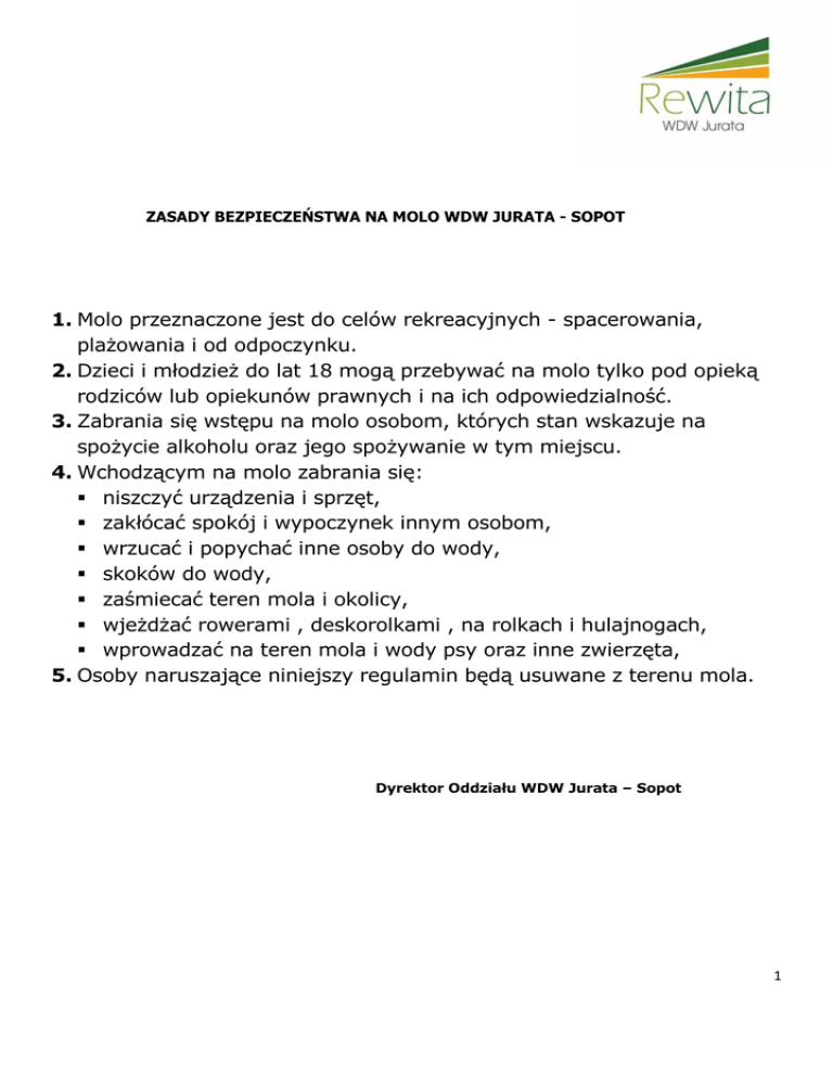 ZASADY BEZPIECZEŃSTWA NA MOLO WDW JURATA - SOPOT 1. Molo przeznaczone jest do celów rekreacyjnych - spacerowania, plażowania i od odpoczynku. 2. Dzieci i młodzież do lat 18 mogą przebywać na molo tylko pod opieką rodziców lub opiekunów prawnych i na ich odpowiedzialność. 3. Zabrania się wstępu na molo osobom, których stan wskazuje na spożycie alkoholu oraz jego spożywanie w tym miejscu. 4. Wchodzącym na molo zabrania się: niszczyć urządzenia i sprzęt, zakłócać spokój i wypoczynek innym osobom, wrzucać i popychać inne osoby do wody, skoków do wody, zaśmiecać teren mola i okolicy, wjeżdżać rowerami , deskorolkami , na rolkach i hulajnogach, wprowadzać na teren mola i wody psy oraz inne zwierzęta, 5. Osoby naruszające niniejszy regulamin będą usuwane z terenu mola. Dyrektor Oddziału WDW Jurata – Sopot 1