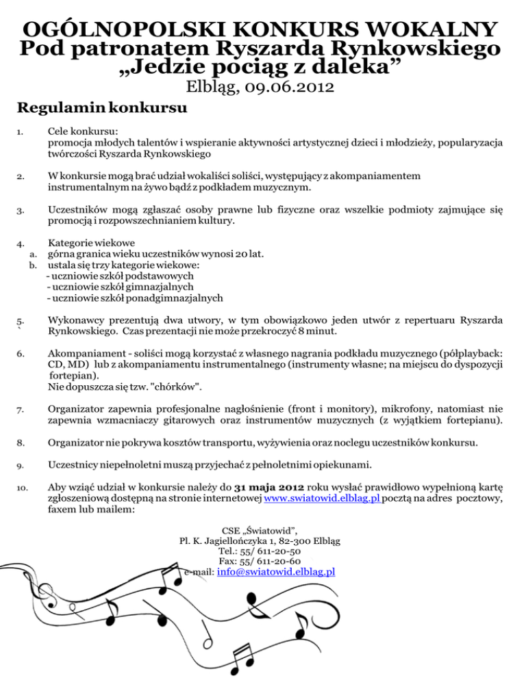 OGÓLNOPOLSKI KONKURS WOKALNY Pod patronatem Ryszarda Rynkowskiego „Jedzie pociąg z daleka” Elbląg, 09.06.2012 Regulamin konkursu 1. Cele konkursu: promocja młodych talentów i wspieranie aktywności artystycznej dzieci i młodzieży, popularyzacja twórczości Ryszarda Rynkowskiego 2. W konkursie mogą brać udział wokaliści soliści, występujący z akompaniamentem instrumentalnym na żywo bądź z podkładem muzycznym. 3. Uczestników mogą zgłaszać osoby prawne lub fizyczne oraz wszelkie podmioty zajmujące się promocją i rozpowszechnianiem kultury. 4. a. b. 5. ` Kategorie wiekowe górna granica wieku uczestników wynosi 20 lat. ustala się trzy kategorie wiekowe: - uczniowie szkół podstawowych - uczniowie szkół gimnazjalnych - uczniowie szkół ponadgimnazjalnych Wykonawcy prezentują dwa utwory, w tym obowiązkowo jeden utwór z repertuaru Ryszarda Rynkowskiego. Czas prezentacji nie może przekroczyć 8 minut. 6. Akompaniament - soliści mogą korzystać z własnego nagrania podkładu muzycznego (półplayback: CD, MD) lub z akompaniamentu instrumentalnego (instrumenty własne; na miejscu do dyspozycji fortepian). Nie dopuszcza się tzw. "chórków". 7. Organizator zapewnia profesjonalne nagłośnienie (front i monitory), mikrofony, natomiast nie zapewnia wzmacniaczy gitarowych oraz instrumentów muzycznych (z wyjątkiem fortepianu). 8. Organizator nie pokrywa kosztów transportu, wyżywienia oraz noclegu uczestników konkursu. 9. Uczestnicy niepełnoletni muszą przyjechać z pełnoletnimi opiekunami. 10. Aby wziąć udział w konkursie należy do 31 maja 2012 roku wysłać prawidłowo wypełnioną kartę zgłoszeniową dostępną na stronie internetowej www.swiatowid.elblag.pl pocztą na adres pocztowy, faxem lub mailem: CSE „Światowid”, Pl. K. Jagiellończyka 1, 82-300 Elbląg Tel.: 55/ 611-20-50 Fax: 55/ 611-20-60 e-mail: [email protected] 11. O godzinie rozpoczęcia i zakończenia konkursu uczestnicy zostaną powiadomieni najpóźniej do dn. 06.06.2012 r. 12. Konkurs odbędzie się w dn. 09.06.2012 r. w Sali kina „Światowid” w CSE „Światowid” (scena przystosowana do występów artystycznych), pl. K. Jagiellończyka 1, Elbląg. 13. Ocena i nagrody Jury będzie brało pod uwagę kryteria: - intonacja, emisja głosu, dykcja - umiejętności wokalne - indywidualność, wyraz artystyczny Jury przyzna nagrody rzeczowe i wyróżnienia w poszczególnych kategoriach. Nagrodą dodatkową do nagrody głównej w każdej kategorii wiekowej będzie możliwość nagrania jednego wybranego przez uczestnika utworu w studio nagraniowym CSE „Światowid” w uzgodnionym terminie. Werdykty wydane na podstawie ocen jury są ostateczne i nie przysługuje od nich odwołanie. Wszyscy uczestnicy konkursu otrzymują dyplomy za udział. W konkursie nie mogą brać udziału uczniowie członków jury. a. b. c. d. e. 14. Postanowienia końcowe: Organizatorzy zastrzegają sobie prawo do publikacji zdjęć i materiałów filmowych zarejestrowanych podczas Konkursu w celach promujących Konkurs. Informacje: Magdalena Czarnocka - CSE „Światowid” tel. 55/ 611-20-55,50 fax: 55/ 611-20-60, e-mail: [email protected] Organizator: Centrum Spotkań Europejskich „Światowid” Plac K. Jagiellończyka 1 82-300 Elbląg Tel.: 55/ 611-20-50 Fax: 55/ 611-20-60 e-mail: [email protected]