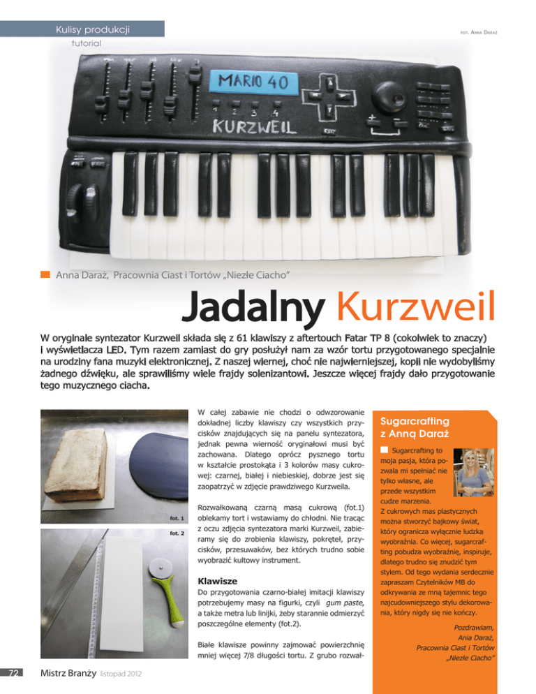 Kulisy produkcji fot. A nna Daraż tutorial Anna Daraż, Pracownia Ciast i Tortów „Niezłe Ciacho” Jadalny Kurzweil W oryginale syntezator Kurzweil składa się z 61 klawiszy z aftertouch Fatar TP 8 (cokolwiek to znaczy) i wyświetlacza LED. Tym razem zamiast do gry posłużył nam za wzór tortu przygotowanego specjalnie na urodziny fana muzyki elektronicznej. Z naszej wiernej, choć nie najwierniejszej, kopii nie wydobyliśmy żadnego dźwięku, ale sprawiliśmy wiele frajdy solenizantowi. Jeszcze więcej frajdy dało przygotowanie tego muzycznego ciacha. W całej zabawie nie chodzi o odwzorowanie dokładnej liczby klawiszy czy wszystkich przycisków znajdujących się na panelu syntezatora, jednak pewna wierność oryginałowi musi być zachowana. Dlatego oprócz pysznego tortu w kształcie prostokąta i 3 kolorów masy cukrowej: czarnej, białej i niebieskiej, dobrze jest się zaopatrzyć w zdjęcie prawdziwego Kurzweila. fot. 1 fot. 2 Rozwałkowaną czarną masą cukrową (fot.1) oblekamy tort i wstawiamy do chłodni. Nie tracąc z oczu zdjęcia syntezatora marki Kurzweil, zabieramy się do zrobienia klawiszy, pokręteł, przycisków, przesuwaków, bez których trudno sobie wyobrazić kultowy instrument. Klawisze Do przygotowania czarno-białej imitacji klawiszy potrzebujemy masy na figurki, czyli gum paste, a także metra lub linijki, żeby starannie odmierzyć poszczególne elementy (fot.2). Białe klawisze powinny zajmować powierzchnię mniej więcej 7/8 długości tortu. Z grubo rozwał- 72 Mistrz Branży listopad 2012 Sugarcrafting z Anną Daraż Sugarcrafting to moja pasja, która pozwala mi spełniać nie tylko własne, ale przede wszystkim cudze marzenia. Z cukrowych mas plastycznych można stworzyć bajkowy świat, który ogranicza wyłącznie ludzka wyobraźnia. Co więcej, sugarcrafting pobudza wyobraźnię, inspiruje, dlatego trudno się znudzić tym stylem. Od tego wydania serdecznie zapraszam Czytelników MB do odkrywania ze mną tajemnic tego najcudowniejszego stylu dekorowania, który nigdy się nie kończy. Pozdrawiam, Ania Daraż, Pracownia Ciast i Tortów „Niezłe Ciacho” Kulisy produkcji tutorial fot. 3 Na tym etapie również naklejamy pozostałe elementy uzupełniające. Paski po boku oraz duży kawałek rozwałkowanej masy cukrowej, której miejsce znajduje się powyżej klawiszy. Robimy również rulonik z czarnej masy i przyklejamy go nad klawiszami. Przesuwaki, przyciski, wyświetlacz kowanej białej masy, przy użyciu kółka do pizzy, wycinamy prostokąt. Następnie zaznaczamy na nim klawisze i lekko nacinamy powierzchnię masy (fot.3), pamiętając, żeby jej nie przeciąć. Tort ponownie wkładamy do chłodni i przygotowujemy drobne elementy, które złożą się na wierną kopię syntezatora. Dzięki szablonowi szybciej dopa- fot. 9 Pozostałe elementy rozmieszczamy w odpowiedniej odległości (fot. 10). fot. 10 Czarne klawisze powinny mieć 3/5 długości białych. W tym przypadku klawisze fot. 7 sujemy odpowiednie proporcje uformowanych elementów; łatwiej nam będzie też rozplanować ich umiejscowienie na wyznaczonej powierzchni (fot. 7). fot. 4 dokładnie wycinamy (fot.4). Tak przygotowane elementy warto odstawić do obeschnięcia i tym samym do fot. 5 Niektóre z nich będą miały pod sobą napisy – warto to wziąć pod uwagę podczas rozkładania poszczególnych przycisków. Za pomocą cienkiego pędzelka nanosimy biały barwnik (fot. 11). Można użyć gotowego barwnika w żelu lub zastosować Prostokątne kawałki masy gum paste mocniej nacinamy w połowie, natomiast delikatnie zaznaczamy kreski po obu stronach, by całość przypominała orygifot. 8 fot. 11 barwnik w proszku. Według mnie barwniki w proszku są lepsze do pisania po torcie; poza tym kolor biały uzyskuje dużo lepszy efekt. usztywnienia – takie klawisze łatwiej się nakleja (fot.5). Wyciągamy nasz tort z chłodni i przyklejamy klawisze na jego powierzchnię (fot.6). nalne przesuwaki (fot.8). Wzorując się na rzeczywistości, formujemy kolejne przyciski czy pokrętło. Jeszcze tylko wypisujemy imię naszego solenizanta na niebieskim „wyświetlaczu” i nanosimy płyn spożywczy nabłyszczający na powierzchnię klawiszy. Specjalnym dłutkiem robimy nacięcia na lewej części naszego syntezatora fot.9). fot. 6 Więcej inspirujących pomysłów szukaj na www.niezleciacho.com MistrzBranzy.pl 73