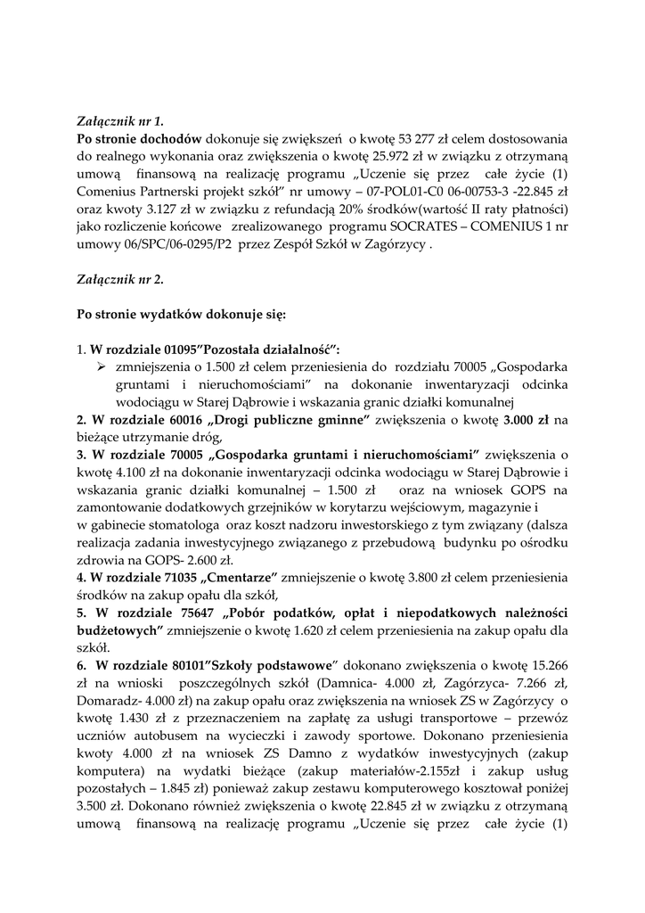 Załącznik nr 1. Po stronie dochodów dokonuje się zwiększeń o kwotę 53 277 zł celem dostosowania do realnego wykonania oraz zwiększenia o kwotę 25.972 zł w związku z otrzymaną umową finansową na realizację programu „Uczenie się przez całe życie (1) Comenius Partnerski projekt szkół” nr umowy – 07-POL01-C0 06-00753-3 -22.845 zł oraz kwoty 3.127 zł w związku z refundacją 20% środków(wartość II raty płatności) jako rozliczenie końcowe zrealizowanego programu SOCRATES – COMENIUS 1 nr umowy 06/SPC/06-0295/P2 przez Zespół Szkół w Zagórzycy . Załącznik nr 2. Po stronie wydatków dokonuje się: 1. W rozdziale 01095”Pozostała działalność”: zmniejszenia o 1.500 zł celem przeniesienia do rozdziału 70005 „Gospodarka gruntami i nieruchomościami” na dokonanie inwentaryzacji odcinka wodociągu w Starej Dąbrowie i wskazania granic działki komunalnej 2. W rozdziale 60016 „Drogi publiczne gminne” zwiększenia o kwotę 3.000 zł na bieżące utrzymanie dróg, 3. W rozdziale 70005 „Gospodarka gruntami i nieruchomościami” zwiększenia o kwotę 4.100 zł na dokonanie inwentaryzacji odcinka wodociągu w Starej Dąbrowie i wskazania granic działki komunalnej – 1.500 zł oraz na wniosek GOPS na zamontowanie dodatkowych grzejników w korytarzu wejściowym, magazynie i w gabinecie stomatologa oraz koszt nadzoru inwestorskiego z tym związany (dalsza realizacja zadania inwestycyjnego związanego z przebudową budynku po ośrodku zdrowia na GOPS- 2.600 zł. 4. W rozdziale 71035 „Cmentarze” zmniejszenie o kwotę 3.800 zł celem przeniesienia środków na zakup opału dla szkół, 5. W rozdziale 75647 „Pobór podatków, opłat i niepodatkowych należności budżetowych” zmniejszenie o kwotę 1.620 zł celem przeniesienia na zakup opału dla szkół. 6. W rozdziale 80101”Szkoły podstawowe” dokonano zwiększenia o kwotę 15.266 zł na wnioski poszczególnych szkół (Damnica- 4.000 zł, Zagórzyca- 7.266 zł, Domaradz- 4.000 zł) na zakup opału oraz zwiększenia na wniosek ZS w Zagórzycy o kwotę 1.430 zł z przeznaczeniem na zapłatę za usługi transportowe – przewóz uczniów autobusem na wycieczki i zawody sportowe. Dokonano przeniesienia kwoty 4.000 zł na wniosek ZS Damno z wydatków inwestycyjnych (zakup komputera) na wydatki bieżące (zakup materiałów-2.155zł i zakup usług pozostałych – 1.845 zł) ponieważ zakup zestawu komputerowego kosztował poniżej 3.500 zł. Dokonano również zwiększenia o kwotę 22.845 zł w związku z otrzymaną umową finansową na realizację programu „Uczenie się przez całe życie (1) Comenius Partnerski projekt szkół” nr umowy – 07-POL01-C0 06-00753-3 realizowaną przez Zespół Szkół w Zagórzycy oraz o kwotę 3.127 zł w związku z refundacją 20% środków(wartość II raty płatności) jako rozliczenie końcowe zrealizowanego programu SOCRATES – COMENIUS 1 nr umowy 06/SPC/06-0295/P2 przez Zespół Szkół w Zagórzycy . 7. W rozdziale 80104”Przedszkola” dokonano zwiększenia o kwotę 6.500 zł na wniosek ZS Damnica na zakup opału do przedszkola, żywności oraz naczyń kuchennych; 8. W rozdziale 80110”Gimnazja” dokonano zwiększenia planu o kwotę 7.774 zł w związku z wnioskiem ZS Damnica na zakup opału -4.100 i wynajmu autobusu – 900 zł, razem 5.000 zł oraz na przekazanie subwencji w wysokości 2.734 zł na wnioski Urzędu Gminy Kępice i Potęgowo w związku z uczęszczaniem do tych jednostek uczniów z terenu gminy Damnica. 9. W rozdziale 85154” o kwotę 627 zł w związku ze zwiększeniem po stronie dochodów o wpływy z tytułu zezwoleń na sprzedaż napojów alkoholowych” 10. w rozdziale 85219 „Ośrodki pomocy społecznej” dokonano zwiększenia o kwotę 30.000 zł na wniosek GOPS z przeznaczeniem na wykonanie remontu istniejącego parkingu przed GOPS (wymiana zniszczonej powierzchni na polbruk z podjazdem dla osób poruszających się na wózku inwalidzkim z uchwytem mocowanym w ścianie oraz zadaszeniem i ścianki ochraniającej wejście), 11. W rozdziale 85295 „Pozostała działalność” zmniejszenia o kwotę 6.588 zł w § 3110 celem przeniesienia środków do § 6060 na wniosek GOPS na zakup wyparzacza do naczyń w Szkole Podstawowej w Domaradzu do punktu wydawania posiłków i zwiększenia w tymże § 3110 o kwotę 1.500 zł na wypłatę z tytułu prac społecznie użytecznych w związku z możliwością nie otrzymania w m-u grudniu refundacjiz Powiatowego Urzędu Pracy w Słupsku. 12. W rozdziale 90015 „Oświetlenie ulic, placów i dróg” zmniejszenie o 10.360 zł celem przeniesienia do rozdziału 85219 „Ośrodki pomocy społecznej” kwoty 10.000 zł na wykonanie remontu parkingu i z tym związanych prac dodatkowych oraz kwoty 360 zł na zakup pucharów na zawody sportowe w rozdziale 92605 „Zadania w zakresie kultury fizycznej i sportu” 13. W rozdziale 92605 „Zadania w zakresie kultury fizycznej i sportu” zwiększenie o kwotę 360 zł celem zakupu pucharów na zawody sportowe. W załączniku nr 3 pn. „Limity wydatków na wieloletnie plany inwestycyjne” dokonano zwiększenia w pozycji „łączne koszty finansowe” w zadaniu inwestycyjnym dotyczącym budowy kanalizacji dla m. Bięcino, Budy, Dębniczka 2006-2008 celem dostosowania do kwoty ujętej w tejże pozycji w załączniku pn. „zadania inwestycyjne w 2007 r.”. W załączniku nr 3a pn. „Zadania inwestycyjne w 2007 r” dokonano zmian, które przedstawiono w opisie załącznika nr 2 pkt. 3, 6 i 11.