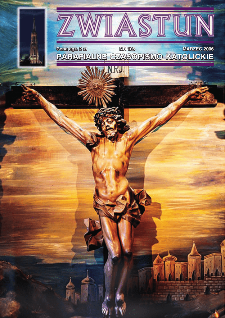 Cena egz. 2 zł NR 105 MARZEC 2006 PARAFIALNE CZASOPISMO KATOLICKIE ZWIASTUN NR 3 (105)/2006 2 Umiłujmy Go do końca Wielki Post to czas, kiedy powinniśmy wpatrywać się w Tego, który umiłował nas do końca i samego siebie wydał za nas (por. Ga 2,20). Sam Jezus mówił: „ Nikt nie ma większej miłości, gdy ktoś życie swoje oddaje za przyjaciół swoich” (J 15,13). Krzyż, przebite włócznią żołnierza Serce to dowód Jego największej miłości do człowieka - miłości, która wyrwała nas z grzechu. Cała liturgia Wielkiego Postu, czytania mszalne, nabożeństwa drogi krzyżowej i Gorzkich żali, odprawiane misteria męki Pańskiej - mówią nam o miłości Jezusowego Serca. W naszej zabieganej i zapracowanej codzienności tak mało mamy jednak czasu, aby o niej pomyśleć i ją rozważyć. W czasie ziemskiego życia Jezus pochylał się nad biednymi fizycznie i moralnie. Uzdrawiał, przebaczał i usprawiedliwiał tych, którzy zwracali się do Niego o pomoc. Czynił to, bo bezinteresownie kochał człowieka, stworzonego na obraz i podobieństwo Boże. Jego miłość osiągnęła najwyższy wymiar w godzinie męki i śmierci. Wyrazem tej miłości był krwawy pot w Ogrodzie Oliwnym, biczowanie i cierniem koronowanie, droga krzyżowa, wreszcie śmierć i przebicie włócznią Jego boskiego Serca. Można powiedzieć, że był to szczyt miłości Boga do człowieka. Serce Jezusa, które do tego stopnia umiłowało człowieka, że - otwarte na krzyżu - dało człowiekowi życie. Za papieżem Benedyktem XVI możemy powiedzieć, że „godzina” Jezusa była godziną, w której zwyciężyła miłość. Tę wielką tajemnicę miłości pragniemy zgłębiać w czasie Wielkiego Postu. Jako czciciele Serca nie możemy za żadną cenę być obojętni na to, co przeżyło Jezusowe Serce, zbawiając nas z miłości za cenę życia. Serce człowieka, dotknięte miłością Serca Jezusa, powinno odpowiedzieć także miłością. Towarzysząc Jezusowi w Jego drodze krzyżowej, widzimy wiele ludzkich serc wrażliwych, dobrych i współczujących. Osobą zauważającą cierpienia Jezusowego Serca w czasie drogi krzyżowej jest między innymi Weronika. Jej postawa wobec Jezusa powinna zachęcać nas do czynów miłości bliźniego. Ten, kto przeżywa ból serca Jezusowego jak Weronika, powinien ulżyć niedoli niejednego człowieka, którego spotyka na swojej Ks. Proboszcz Prałat dr Stanisław Chomiak drodze. Tak jak Weronika powinniśmy ocierać twarze pokrzywdzonych, smutnych, osamotnionych, cierpiących i płaczących. Okazji ku temu mamy tak wiele każdego dnia! Patrząc na Jezusa, którego Serce „tak bardzo ludzi ukochało”, postanówmy, że naszą odpowiedzią na Jego miłość będzie odtąd dar naszej miłości, ofiarowywany drugiemu człowiekowi. Wyrazem naszej miłości do Jezusa niech się stanie również żal za własne grzechy, świadomie podjęty czyn umartwienia czy wyrzeczenia. Ofiarujmy Sercu Jezusa naszą cierpliwość w życiowych doświadczeniach i wszelkich cierpieniach. Ks. Stanisław CHOMIAK Rok temu, 2 kwietnia o godzinie 21.37 odszedł papież-Polak - człowiek, który poruszył serca i dał nadzieje milionom ludzi na całym świecie. Śmierć Jana Pawła II była dla nas wstrząsem. Umilkł codzienny zgiełk. W oknach domów zapłonęły świece, do kościołów i miejsc związanych z Papieżem ciągnęły tłumy, by się wspólnie modlić i czuwać. Szczególnie dla ludzi młodych, którzy nazywają siebie „pokoleniem JP2”, był to czas doświadczenia wspólnoty i solidarności. Po 27-letnim pontyfikacie na placu św. Piotra w Watykanie papieża żegnały miliony wiernych. Ojcze Święty, jeszcze raz dziękujemy Ci za piękne świadectwo życia - całkowicie rozmiłowanego w Bogu i oddanego drugiemu człowiekowi. Prosimy, błogosław nam z domu Ojca Niebieskiego. ks. Paweł Zieliński - redaktor wydania ZWIASTUN NR 3 (105)/2006 DEKALOG CZŁONKA PARAFIALNEGO ODDZIAŁU AKCJI KATOLICKIEJ Członek Parafialnego Oddziału Akcji Katolickiej wypełniający obowiązki Statutowe powinien: 1. Uczestniczyć w spotkaniach informacyjno – organizacyjnych z Zarządem POAK 2. Aktywnie włączać się we wszystkie działania wynikające z rocznego planu pracy POAK. 3. Uczestniczyć w spotkaniach i nabożeństwach modlitewnych (droga krzyżowa, majówka, różaniec itp.). Rekolekcje Wielkopostne dla dzieci i młodzieży. (26; 27; 28. 03. 2006 r.) (prowadzi Ks. Krzysztof Ora) NIEDZIELA (26.03.2006 R.) godz. 11.00 - dzieci szkół podstawowych godz. 16.00 - młodzież szkół gimnazjalnych Poniedziałek, wtorek (27, 28.03.2006 r.) godz. 8.30 - dzieci kl. I - III (SP nr 7; nr 10 - kościół) godz. 9.30 - dzieci kl. I - III ( SP nr 1; Szk. Społ. - kaplica sióstr) godz. 10.30 - dzieci kl. IV - VI (wszystkie szkoły - kościół) godz. 11.30 - gimnazjum nr 1 godz. 12.30 - gimnazjum nr 2 spowiedź św. - poniedziałek od godz. 16.00 do 17.00. Msza św. - wtorek, godz. 16.00. 4. Brać udział w uroczystościach religijno - patriotycznych (3 maja, 15 sierpnia, 1 września, 11 listopada). Rekolekcje Wielkopostne 02 - 05. 04. 2006 r. 5. Uczestniczyć w Parafialnym Dniu Skupienia Akcji Katolickiej. 7.00 - Msza św. i konferencja dla dorosłych; 8.30 - Msza św. i konferencja dla dorosłych; 9.45 - Msza św. i konferencja dla dorosłych; 11.00 - Msza św. i konferencja dla dzieci; 12.15 - Msza św. i konferencja dla dorosłych; 16.00 - Msza św. i konferencja dla rodziców i dzieci I Komunijnych 18.00 - Msza ś. i konferencja dla dorosłych. 6. Brać udział w obchodach patronalnego święta Akcji Katolickiej w niedzielę Chrystusa Króla Wszechświata. 7. Brać udział w Walnych Zebraniach członków POAK. 8. Uczestniczyć w wielkopostnych i adwentowych dniach skupienia Akcji Katolickiej Diecezji Świdnickiej. 9. Brać udział w ogólnopolskich diecezjalnych pielgrzymkach Akcji Katolickiej (Jasna Góra, Wambierzyce) 10. Płacić składki członkowskie w ustalonych terminach