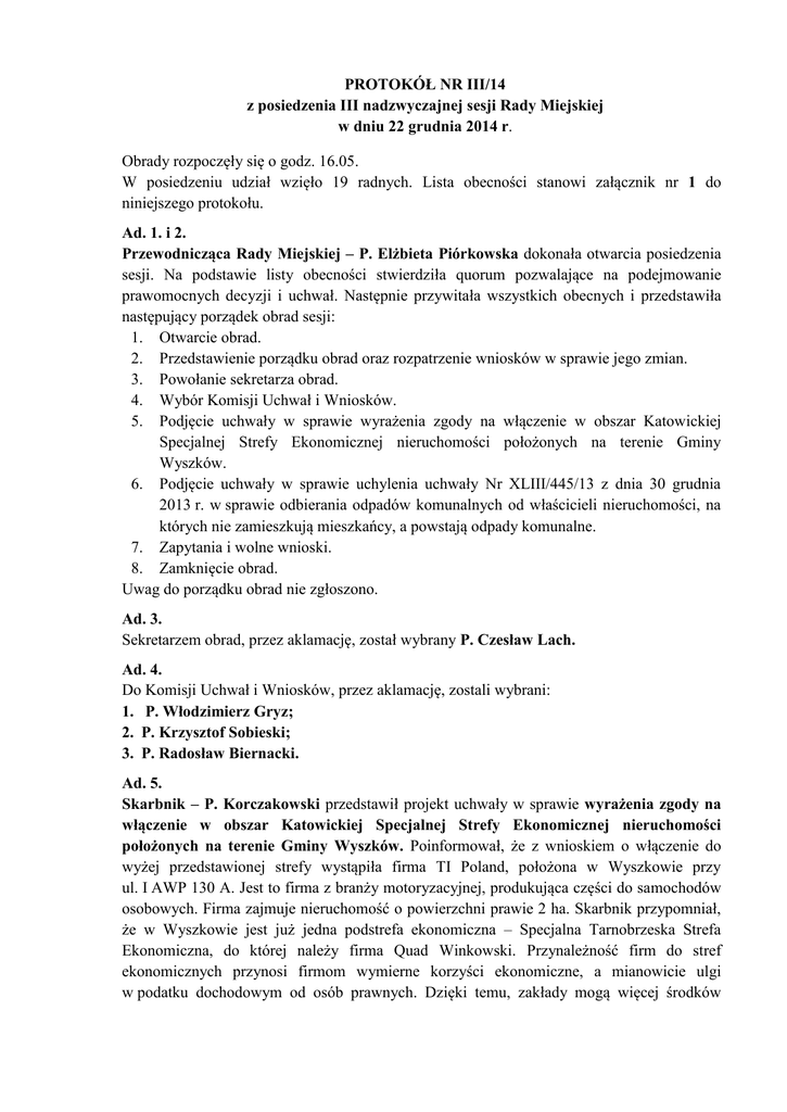 PROTOKÓŁ NR III/14 z posiedzenia III nadzwyczajnej sesji Rady Miejskiej w dniu 22 grudnia 2014 r. Obrady rozpoczęły się o godz. 16.05. W posiedzeniu udział wzięło 19 radnych. Lista obecności stanowi załącznik nr 1 do niniejszego protokołu. Ad. 1. i 2. Przewodnicząca Rady Miejskiej – P. Elżbieta Piórkowska dokonała otwarcia posiedzenia sesji. Na podstawie listy obecności stwierdziła quorum pozwalające na podejmowanie prawomocnych decyzji i uchwał. Następnie przywitała wszystkich obecnych i przedstawiła następujący porządek obrad sesji: 1. Otwarcie obrad. 2. Przedstawienie porządku obrad oraz rozpatrzenie wniosków w sprawie jego zmian. 3. Powołanie sekretarza obrad. 4. Wybór Komisji Uchwał i Wniosków. 5. Podjęcie uchwały w sprawie wyrażenia zgody na włączenie w obszar Katowickiej Specjalnej Strefy Ekonomicznej nieruchomości położonych na terenie Gminy Wyszków. 6. Podjęcie uchwały w sprawie uchylenia uchwały Nr XLIII/445/13 z dnia 30 grudnia 2013 r. w sprawie odbierania odpadów komunalnych od właścicieli nieruchomości, na których nie zamieszkują mieszkańcy, a powstają odpady komunalne. 7. Zapytania i wolne wnioski. 8. Zamknięcie obrad. Uwag do porządku obrad nie zgłoszono. Ad. 3. Sekretarzem obrad, przez aklamację, został wybrany P. Czesław Lach. Ad. 4. Do Komisji Uchwał i Wniosków, przez aklamację, zostali wybrani: 1. P. Włodzimierz Gryz; 2. P. Krzysztof Sobieski; 3. P. Radosław Biernacki. Ad. 5. Skarbnik – P. Korczakowski przedstawił projekt uchwały w sprawie wyrażenia zgody na włączenie w obszar Katowickiej Specjalnej Strefy Ekonomicznej nieruchomości położonych na terenie Gminy Wyszków. Poinformował, że z wnioskiem o włączenie do wyżej przedstawionej strefy wystąpiła firma TI Poland, położona w Wyszkowie przy ul. I AWP 130 A. Jest to firma z branży motoryzacyjnej, produkująca części do samochodów osobowych. Firma zajmuje nieruchomość o powierzchni prawie 2 ha. Skarbnik przypomniał, że w Wyszkowie jest już jedna podstrefa ekonomiczna – Specjalna Tarnobrzeska Strefa Ekonomiczna, do której należy firma Quad Winkowski. Przynależność firm do stref ekonomicznych przynosi firmom wymierne korzyści ekonomiczne, a mianowicie ulgi w podatku dochodowym od osób prawnych. Dzięki temu, zakłady mogą więcej środków 2 przeznaczyć na inwestycje i rozwój swoich zakładów. Skarbnik zauważył, że podejmując tę uchwałę, trzeba jednak pamiętać o tym, że dana firma zostanie zwolniona od płacenia podatku dochodowego od osób prawnych, co spowoduje, że taki podatek nie wpłynie do gminy. W 2013 roku IT Poland wpłaciła ok. 100.000 zł podatku, natomiast w 2014, jeszcze nie było żadnych wpłat. Wysokość podatku zależy bowiem od koniunktury i od tego co się dzieje w danym czasie na rynku. Oprócz dochodów, które wpływają do gminy, trzeba również mieć na uwadze fakt, że firma w Wyszkowie zatrudnia ponad 500 osób. Zgoda na przynależność do strefy ekonomicznej na pewno zagwarantuje stabilność tego zakładu i dalszy jego rozwój. P. Zbigniew Giełda – Dyrektor TI Poland w Wyszkowie poinformował, że zakład w Wyszkowie jest częścią składową Firmy Polskiej – TI Poland, której główna siedziba znajduje się w Bielsku Białej. Właśnie główny zakład w Bielsku Białej przynależy już do Katowickiej Strefy Ekonomicznej, w związku z tym, zakład wyszkowski może przystąpić do tej właśnie strefy. P. Giełda poinformował, że TI Wyszków funkcjonuje w Wyszkowie od 2001 roku i na dzień dzisiejszy zatrudnia 535 pracowników. Firma produkuje przede wszystkim przewody paliwowe dla światowego przemysłu motoryzacyjnego, które podaje paliwo od baku do silnika. Dyrektywy unijne stawiają wysokie wymagania, w związku z czym, firma cały czas musi się rozwijać i wprowadzać nowe technologie. Aby można było realizować wszystkie te plany, firma poszukuje dodatkowych środków. Przynależność firmy do strefy ekonomicznej da firmie upust w wysokości 35% w płaconym podatku dochodowym. P. Giełda podziękował Burmistrzowi i radnym, za to, że została zwołana specjalnie sesja nadzwyczajna, po to, aby zająć się wnioskiem, złożonym przez TI Wyszków. Przeprosił za późny termin, ale tak długo trwała procedura przygotowawcza, a wniosek o przystąpienie do strefy trzeba złożyć do końca br. P. Paradowski spytał, czy firma nie może przystąpić do strefy np. od 1 lipca, tak aby jedna i druga strona była zadowolona? P. Giełda poinformował, że Rada wyraża opinię czy włączyć czy nie włączyć daną nieruchomość do strefy ekonomicznej, natomiast o tym, od kiedy ona będzie włączona, decyduje odpowiedni wiceminister. Katowicka Strefa Ekonomiczna musi złożyć wszystkie wnioski w styczniu, a przyłączenie do strefy może być nawet w grudniu. Komisja Uchwał i Wniosków przedstawiła projekt uchwały w powyższej sprawie. Radni w wyniku głosowania jawnego (głosów za - 19, przeciw – 0, wstrzym. się – 0), przyjęli do realizacji uchwałę Nr III/7/14 w sprawie wyrażenia zgody na włączenie w obszar Katowickiej Specjalnej Strefy Ekonomicznej nieruchomości położonych na terenie Gminy Wyszków. Ad. 6. P. Ciuraj-Makarewicz– Inspektor w Wydziale Gospodarki Komunalnej, Mieszkalnictwa i Rolnictwa przedstawiła projekt uchwały w sprawie uchylenia uchwały Nr XLIII/445/13 z dnia 30 grudnia 2013 r. w sprawie odbierania odpadów komunalnych od właścicieli nieruchomości, na których nie zamieszkują mieszkańcy, a powstają odpady komunalne. Poinformowała, że Rada Miejska, podęła taką uchwałę w dniu 9 grudnia 2014 r., jednak nadzór prawny Wojewody Mazowieckiego, zarzucił, że przyjęty w tej uchwale zapis: „uchwała wchodzi w życie z dniem podjęcia” jest niedopuszczalny, ponieważ ta uchwała, jako prawo miejscowe, powinna zostać opublikowana w Dzienniku Urzędowym 3 Województwa Mazowieckiego. W związku z powyższym, prz