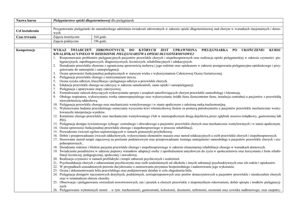 Nazwa kursu Cel kształcenia Czas trwania Kompetencje Pielęgniarstwo opieki długoterminowej dla pielęgniarek Przygotowanie pielęgniarki do samodzielnego udzielania świadczeń zdrowotnych w zakresie opieki długoterminowej nad chorym w warunkach stacjonarnych i domowych Zajęcia teoretyczne 164 godz. Zajęcia praktyczne 196 godz. WYKAZ ŚWIADCZEŃ ZDROWOTNYCH, DO KTÓRYCH JEST UPRAWNIONA PIELĘGNIARKA PO UKOŃCZENIU KURSU KWALIFIKACYJNEGO W DZIEDZINIE PIELĘGNIARSTWA OPIEKI DŁUGOTERMINOWEJ 1. Rozpoznawanie problemów pielęgnacyjnych pacjentów przewlekle chorych i niepełnosprawnych oraz realizacja opieki pielęgniarskiej w zakresie czynności: pielęgnacyjnych, zapobiegawczych, diagnostycznych, leczniczych, rehabilitacyjnych i edukacyjnych. 2. Doradzanie przewlekle choremu z ograniczoną sprawnością ruchową i jego rodzinie oraz opiekunom w zakresie postępowania pielęgnacyjno-opiekuńczego i przygotowanie do samoopieki i samopielęgnacji. 3. Ocena sprawności funkcjonalnej podopiecznych w starszym wieku z wykorzystaniem Całościowej Oceny Geriatrycznej. 4. Pielęgnacja przewlekle chorego z nietrzymaniem moczu. 5. Ocena ryzyka odleżyn, klasyfikacja i pielęgnacja odleżyn u przewlekle chorych. 6. Edukacja przewlekle chorego na cukrzycę w zakresie samokontroli, samo opieki i samopielęgnacji. 7. Pielęgnacja i opatrywanie stopy cukrzycowej. 8. Formułowanie zaleceń dotyczących wykorzystania sprzętu i urządzeń umożliwiających chorym przewlekle samoobsługę i lokomocję. 9. Obsługa respiratora, wykorzystanie worka samorozprężalnego oraz wykorzystanie źródła tlenu (koncentrator tlenu, instalacja centralna) u pacjentów z przewlekłą niewydolnością oddechową. 10. Pielęgnacja przewlekle chorego oraz mechanicznie wentylowanego i w stanie apalicznym z założoną rurką tracheotomijną. 11. Wykonywanie badania przezskórnego oznaczania wysycenia krwi włośniczkowej tlenem za pomocą pulsoksymetru u pacjentów przewlekle mechanicznie wentylowanychi interpretacja wyników. 12. Karmienie chorego przewlekle oraz mechanicznie wentylowanego i/lub w stanieapalicznym drogą dojelitową przez zgłębnik nosowo-żołądkowy, gastrostomię lub PEG. 13. Pielęgnacja dostępu żywieniowego żylnego: centralnego i obwodowego u pacjentów przewlekle chorych oraz mechanicznie wentylowanych i w stanie apalicznym. 14. Ocena sprawności funkcjonalnej przewlekle chorego i niepełnosprawnego w procesie rehabilitacji. 15. Prowadzenie ćwiczeń ogólno-usprawniających w ramach gimnastyki przyłóżkowej. 16. Dobór i przeprowadzanie ćwiczeń oddechowych, wykorzystanie elementów masażu oraz metod relaksacyjnych u osób przewlekle chorych i niepełnosprawnych. 17. Stosowanie metod terapii zajęciowej na poziomie podstawowym oraz przeprowadzanie treningu umiejętności samoobsługi u pacjentów przewlekle chorych i niepełnosprawnych., 18. Doradzanie rodzinie i bliskim pacjenta przewlekle chorego i niepełnosprawnego w zakresie elementarnej rehabilitacji chorego w warunkach domowych. 19. Świadczenie poradnictwa w zakresie poprawy warunków adaptacji osoby z upośledzeniem umysłowym do życia w społeczeństwie oraz korzystania z form rehabilitacji leczniczej, pedagogicznej, społecznej i zawodowej. 20. Realizacja czynności w ramach profilaktyki i terapii zaburzeń psychicznych i uzależnień. 21. Psychoedukacja chorych z zaburzeniami psychicznymi oraz osób uzależnionych od alkoholu i innych substancji psychoaktywnych oraz ich rodzin i opiekunów. 22. W przypadkach uzasadnionych prawnie decydowanie o zastosowaniu przymusu bezpośredniego i nadzorowanie jego wykonania. 23. Ocena i dokumentowanie bólu przewlekłego oraz podejmowanie działań w celu złagodzenia bólu. 24. Pielęgnacja dostępów naczyniowych dożylnych, podskórnych, zewnątrzoponowych oraz portów donaczyniowych u pacjentów przewlekle i nieuleczalnie chorych oraz w terminalnym okresie choroby. 25. Obserwacja i pielęgnowanie owrzodzeń nowotworowych, ran i przetok u chorych przewlekle z niepomyślnym rokowaniem, dobór sprzętu i środków pielęgnacyjnych. 26. Pielęgnowanie wyłonionych stomii – w tym: tracheostomii, gastrostomii, kolostomii, ileostomii, nefrotomii, urostomii oraz cewnika nadłonowego; oraz zaopatry- wanie przetok u pacjentów nieuleczalnie chorych w terminalnym okresie choroby. 27. Ocena jakości życia przewlekle i nieuleczalnie chorego i podnoszenie skuteczności działań na rzecz poprawy jakości życia pacjentów powierzonych długoterminowej opiece pielęgniarskiej. Plan nauczania Lp. Nazwa modułu Liczba godz. Miejsce realizacji stażu Liczba godzin stażu Liczba godz. kontaktowych I. Organizacyjno-społeczne i prawne aspekty opieki nad osobami przewlekle chorymi i niepełnosprawnymi 20 - - 20 II. Problemy psychospołeczne osób przewlekle chorych i niepełnosprawnych w różnym wieku 25 - - 25 III. Wybrane problemy pielęgnacyjne chorych przewlekle, o ograniczonej sprawności ruchowej oraz długotrwale unieruchomionych 35 Zakład opiekuńczo-leczniczy albo Zakład pielęgnacyjnoopiekuńczy albo Pielęgniarska opieka długoterminowa domowa Szpitalny oddział/klinika leczenia chorób układu ruchu 14 Szpitalny oddział/klinika neurologii 21 IV. 21 Zakład opiekuńczo-leczniczy opiekuńczy V. Wybrane zagadnienia z rehabilitacji osób niepełnosprawnych 20 Oddział rehabilitacji albo Zakład rehabilitacji leczniczej albo Zakład opiekuńczo-leczniczy albo Zakład pielęgnacyjno-opiekuńczy 23 Dom pomocy społecznej dla dorosłych lub dla dzieci i młodzieży niepełnosprawnych intelektualnie albo Zakład pielęgnacyjnoopiekuńczy albo Zakład opiekuńczo-leczniczy dla osób niepełnosprawnych intelektualnie (pobyt dzienny lub całodobowy) albo Warsztaty terapii zajęciowej Szpitalny oddział psychiatryczny albo Ośrodek terapii uzależnień albo Dom pomocy społecznej dla osób przewlekle psychiatrycznie chorych VI. VII. Łącznie * Zagadnienia opieki paliatywnej 20 164 14 Szpitalny odd