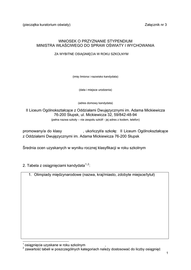 (pieczątka kuratorium oświaty) Załącznik nr 3 WNIOSEK O PRZYZNANIE STYPENDIUM MINISTRA WŁAŚCIWEGO DO SPRAW OŚWIATY I WYCHOWANIA ZA WYBITNE OSIĄGNIĘCIA W ROKU SZKOLNYM (imię /imiona i nazwisko kandydata) (data i miejsce urodzenia) (adres domowy kandydata) II Liceum Ogólnokształcące z Oddziałami Dwujęzycznymi im. Adama Mickiewicza 76-200 Słupsk, ul. Mickiewicza 32, 59/842-48-94 (pełna nazwa szkoły – nie zespołu szkół! - jej adres z kodem, telefon) promowany/a do klasy , ukończył/a szkołę: II Liceum Ogólnokształcące z Oddziałami Dwujęzycznymi im. Adama Mickiewicza 76-200 Słupsk Średnia ocen uzyskanych w wyniku rocznej klasyfikacji w roku szkolnym 2. Tabela z osiągnięciami kandydata 1,2 : 1. Olimpiady międzynarodowe (nazwa, kraj/miasto, zdobyte miejsce/tytuł) 1 2 osiągnięcia uzyskane w roku szkolnym , zawartość tabeli w poszczególnych kategoriach należy dostosować do liczby osiągnięć 1 2. Olimpiady przedmiotowe, zawodowe i interdyscyplinarne o zasięgu ogólnopolskim (nazwa, organizator, zdobyte miejsce/tytuł najwyższego etapu/stopnia) 3. Turnieje o zasięgu ogólnopolskim dla uczniów szkół zawodowych (nazwa, organizator, zdobyte miejsce/tytuł najwyższego etapu/stopnia) 4. Konkursy na pracę naukową organizowane przez instytucje naukowe lub stowarzyszenia naukowe (nazwa konkursu, organizator, tytuł pracy, zdobyte miejsce/tytuł) 5. Wyniki uzyskane w nauce według indywidualnego programu lub toku nauki (nazwa przedmiotu, końcowa ocena klasyfikacyjna w r. szkol. ) 6. Uczestnictwo w zajęciach w uczelni przewidzianych tokiem studiów na podstawie postanowień regulaminu studiów dotyczących warunków uczestniczenia wybitnie uzdolnionych uczniów w zajęciach przewidzianych tokiem studiów (nazwa uczelni, nazwa/charakter zajęć) 7. Wysokie wyniki we współzawodnictwie sportowym na szczeblu krajowym (nazwa zawodów, organizator, zdobyte miejsce/tytuł/medal najwyższego etapu/stopnia, kategoria sportowa) na szczeblu międzynarodowym (nazwa zawodów, organizator, kraj/miasto, zdobyte miejsce/tytuł/medal, kategoria sportowa) 2 8. Inne (nazwa, organizator, najwyższego etapu/stopnia) kraj/miasto, zdobyte miejsce/tytuł/medal 3. Załączniki: 1) opinia kuratora oświaty, KURATOR OŚWIATY ........................................................ (miejscowość, data) …………………………………… ( podpis i pieczątka ) 3