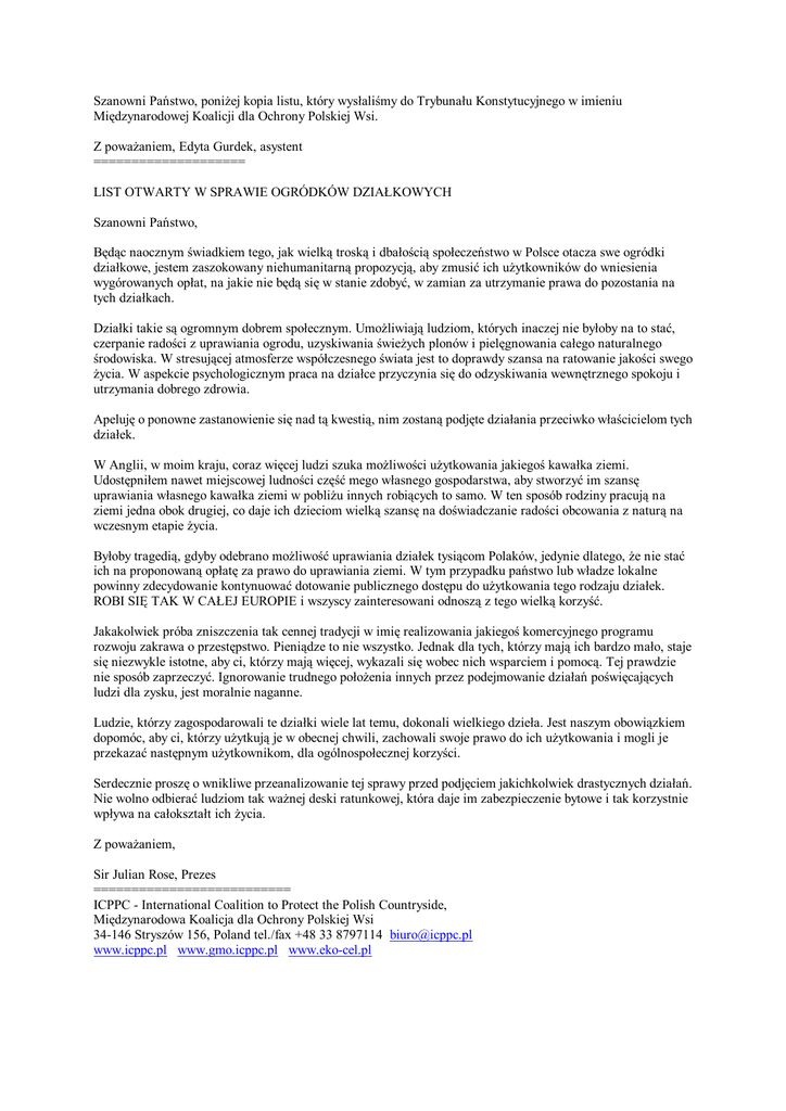 Szanowni Państwo, poniżej kopia listu, który wysłaliśmy do Trybunału Konstytucyjnego w imieniu Międzynarodowej Koalicji dla Ochrony Polskiej Wsi. Z poważaniem, Edyta Gurdek, asystent ==================== LIST OTWARTY W SPRAWIE OGRÓDKÓW DZIAŁKOWYCH Szanowni Państwo, Będąc naocznym świadkiem tego, jak wielką troską i dbałością społeczeństwo w Polsce otacza swe ogródki działkowe, jestem zaszokowany niehumanitarną propozycją, aby zmusić ich użytkowników do wniesienia wygórowanych opłat, na jakie nie będą się w stanie zdobyć, w zamian za utrzymanie prawa do pozostania na tych działkach. Działki takie są ogromnym dobrem społecznym. Umożliwiają ludziom, których inaczej nie byłoby na to stać, czerpanie radości z uprawiania ogrodu, uzyskiwania świeżych plonów i pielęgnowania całego naturalnego środowiska. W stresującej atmosferze współczesnego świata jest to doprawdy szansa na ratowanie jakości swego życia. W aspekcie psychologicznym praca na działce przyczynia się do odzyskiwania wewnętrznego spokoju i utrzymania dobrego zdrowia. Apeluję o ponowne zastanowienie się nad tą kwestią, nim zostaną podjęte działania przeciwko właścicielom tych działek. W Anglii, w moim kraju, coraz więcej ludzi szuka możliwości użytkowania jakiegoś kawałka ziemi. Udostępniłem nawet miejscowej ludności część mego własnego gospodarstwa, aby stworzyć im szansę uprawiania własnego kawałka ziemi w pobliżu innych robiących to samo. W ten sposób rodziny pracują na ziemi jedna obok drugiej, co daje ich dzieciom wielką szansę na doświadczanie radości obcowania z naturą na wczesnym etapie życia. Byłoby tragedią, gdyby odebrano możliwość uprawiania działek tysiącom Polaków, jedynie dlatego, że nie stać ich na proponowaną opłatę za prawo do uprawiania ziemi. W tym przypadku państwo lub władze lokalne powinny zdecydowanie kontynuować dotowanie publicznego dostępu do użytkowania tego rodzaju działek. ROBI SIĘ TAK W CAŁEJ EUROPIE i wszyscy zainteresowani odnoszą z tego wielką korzyść. Jakakolwiek próba zniszczenia tak cennej tradycji w imię realizowania jakiegoś komercyjnego programu rozwoju zakrawa o przestępstwo. Pieniądze to nie wszystko. Jednak dla tych, którzy mają ich bardzo mało, staje się niezwykle istotne, aby ci, którzy mają więcej, wykazali się wobec nich wsparciem i pomocą. Tej prawdzie nie sposób zaprzeczyć. Ignorowanie trudnego położenia innych przez podejmowanie działań poświęcających ludzi dla zysku, jest moralnie naganne. Ludzie, którzy zagospodarowali te działki wiele lat temu, dokonali wielkiego dzieła. Jest naszym obowiązkiem dopomóc, aby ci, którzy użytkują je w obecnej chwili, zachowali swoje prawo do ich użytkowania i mogli je przekazać następnym użytkownikom, dla ogólnospołecznej korzyści. Serdecznie proszę o wnikliwe przeanalizowanie tej sprawy przed podjęciem jakichkolwiek drastycznych działań. Nie wolno odbierać ludziom tak ważnej deski ratunkowej, która daje im zabezpieczenie bytowe i tak korzystnie wpływa na całokształt ich życia. Z poważaniem, Sir Julian Rose, Prezes ========================== ICPPC - International Coalition to Protect the Polish Countryside, Międzynarodowa Koalicja dla Ochrony Polskiej Wsi 34-146 Stryszów 156, Poland tel./fax +48 33 8797114 [email protected] www.icppc.pl www.gmo.icppc.pl www.eko-cel.pl