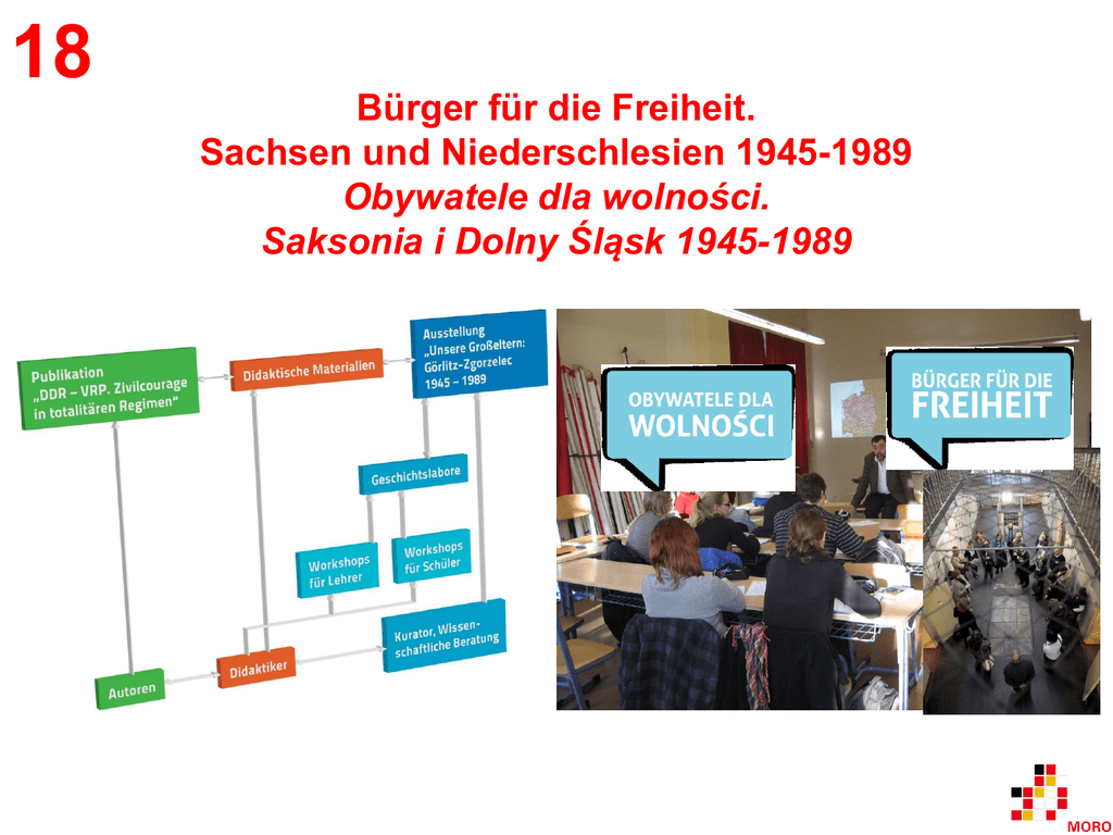 18 Bürger für die Freiheit. Sachsen und Niederschlesien 1945-1989 Obywatele dla wolności. Saksonia i Dolny Śląsk 1945-1989 Modellvorhaben der Raumordnung Wettbewerb für modellhafte deutsch-polnische Kooperationsprojekte Modelowe przedsięwzięcia ładu przestrzennego Konkurs na modelowe projekty współpracy polsko-niemieckiej Bürger für die Freiheit 1945-1989 Zusammenfassung Erarbeitung neuartiger zweisprachiger Lehrmittel und Lernformen am Beispiel der Geschichte der VRP und der DDR zwischen 1945 und 1989 Einreicher EU-Förderung ja Sächsische Bildungsagentur Ort/Region Projektpartner Görlitz; Sächsische Bildungsagentur, Zgorzelec Stadtverwaltung Görlitz , Augustum-Annen-Gymnasium Görlitz, Der Sächsische Landesbeauftragte für die Stasi - Unterlagen; Polnisches Institut Berlin, Filiale Leipzig, Urząd Miasta Zgorzelec, Liceum Ogólnokształcace im. Braci Śniadeckich, Zgorzelec, Gimnazjum nr 1 im. Bolesława Chrobrego, Zgorzelec, Gimnazjum nr 3 im. Armii Krajowej, Zgorzelec, DODN - Dolnośląski Ośrodek Doskonalenia Nauczycieli we Wrocławiu Realisierungszeitraum Aktuelle Projektphase 09/2009-08/2013 Realisierung Kernbotschaft Das Projekt trägt durch neue didaktische Formen im zeitgeschichtlichen Unterricht und die Erstellung deutschpolnischer Lehrmaterialien zur Entwicklung einer gemeinsamen regionalen Identität und des zivilgesellschaftlichen Bewusstseins bei Schülern und Lehrern bei. Działalność obywateli na rzecz wolności 1945-1989 Streszczenie Opracowanie nowatorskich dwujęzycznych materiałów naukowych i nowych form nauczania na przykładzie historii PRL-u i NRD między 1945 i 1989 r. Zgłaszający Współfinansowanie ze środków unijnych tak Sächsische Bildungsagentur Partnerzy projektu Sächsische Bildungsagentur, Stadtverwaltung Görlitz , Augustum-Annen-Gymnasium Görlitz, Der Sächsische Landesbeauftragte für die Stasi - Unterlagen; Polnisches Institut Berlin, Filiale Leipzig, Urząd Miasta Zgorzelec, Liceum Ogólnokształcace im. Braci Śniadeckich, Zgorzelec, Gimnazjum nr 1 im. Bolesława Chrobrego, Zgorzelec, Gimnazjum nr 3 im. Armii Krajowej, Zgorzelec, DODN - Dolnośląski Ośrodek Doskonalenia Nauczycieli we Wrocławiu Okres realizacji 09/2009-08/2013 Miejsce/Region Görlitz; Zgorzelec Aktualny etap rozwoju projektu realizacja Główne przesłanie Projekt poprzez nowe dydaktyczne formy nauczania historii najnowszej jak i opracowania niemiecko-polskich materiałów do nauczania historii służy wspieraniu wspólnej polsko-niemieckiej tożsamości regionalnej i postawy obywatelskiej uczniów i nauczycieli. Modellvorhaben der Raumordnung Wettbewerb für modellhafte deutsch-polnische Kooperationsprojekte Modelowe przedsięwzięcia ładu przestrzennego Konkurs na modelowe projekty współpracy polsko-niemieckiej Abbildungen - ilustracje Modellvorhaben der Raumordnung Wettbewerb für modellhafte deutsch-polnische Kooperationsprojekte Modelowe przedsięwzięcia ładu przestrzennego Konkurs na modelowe projekty współpracy polsko-niemieckiej Beschreibung des Projekts In dem Projekt wird die regionale Geschichte des Raums Görlitz/Zgorzelec zwischen 1945 und 1989 durch 15- bis 17-jährige Schüler aus Sachsen und Niederschlesien gemeinsam erforscht. Dies soll die nachbarschaftliche Verbundenheit der Jugendlichen über die Grenze hinweg stärken und zu einem besseren Verständnis der schwierigen, gemeinsamen Geschichte beitragen. Das Projekt ist Bestandteil der EU-geförderten sächsischen Strategie der grenzüberschreitenden Zusammenarbeit mit Polen im Bildungsbereich. Es knüpft an ein Vorgängerprojekt mit dem Titel „Geschichte verstehen – Zukunft gestalten“ an, in dem ausgewählte Aspekte der deutsch-polnischen Beziehungen in den Jahren 1933-1945 behandelt wurden. Das Projekt trägt durch neue didaktische Formen im zeitgeschichtlichen Unterricht und die Erstellung deutsch-polnischer Lehrmaterialien zur Entwicklung einer gemeinsamen regionalen Identität und des zivilgesellschaftlichen Bewusstseins bei Schülern und Lehrern bei. Im Rahmen des Projekts „Bürger für die Freiheit“ entstehen innovative, ergänzende Unterrichtsmaterialien für den Geschichtsunterricht, die in deutsch-polnischen Tandemteams von profilierten Historikern unter fachdidaktischer Anleitung erstellt werden. Die Publikation erscheint zweisprachig und behandelt Themen, die im deutsch-polnischen Grenzraum auf beiden Seiten gleichermaßen relevant sind. Daneben erarbeiten Schüler in „Geschichtslaboren“ an ihren Schulen in Zusammenarbeit mit Wissenschaftlern und Zeitzeugen Aspekte der Lokalgeschichte, die in eine Ausstellung zum Thema „Unsere Großeltern. Görlitz-Zgorzelec 1945-1989“ einfließen. Die Projektergebnisse werden durch begleitende Konferenzen und Lehrerfortbildungen untermauert. Zielgruppen des Projekts sind insbesondere Schüler im Alter von 15-17 Jahren und Lehrer aus Görlitz und Zgorzelec. Die Umsetzung erfolgt durch das Koordinierungsbüro der Ziel3-Projekte (INTERREG A) der Sächsischen Bildungsagentur in Görlitz. Begründung der Auszeichnung In den Jahren 1945-1989 bestand zwischen der damaligen DDR und der VR Polen keinerlei Auseinandersetzung mit den Themen Aussiedlung und Vertreibung obwohl gerade diese Erfahrungen die Lebensgeschichte der Menschen in der Grenzregion maßgeblich geprägt haben. Das Projekt fördert durch seinen Ansatz, Schüler aus Görlitz und Zgorzelec gemeinsam die Geschichte ihrer Region erforschen zu lassen, das gegenseitige Verständnis und den Zusammenhalt über die Grenze hinweg. Unterstützt werden die Schüler dabei von Lehrern, Historikern und Zeitzeugen. Die beteiligten Schulen, Kommunen und Partnerinstitute demonstrieren anhand eines zeitlichen und räumlichen Beispiels aus der Nachkriegsgeschichte des deutsch-polnischen Grenzraums, wie die gemeinsame Auseinandersetzung mit der Geschichte der eigenen Region gelingen und ein gemeinsamer „Geschichtsraum“ geschaffen werden kann. Das Projekt wird von einer in