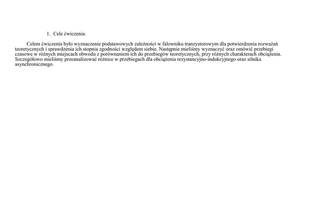 1. Cele ćwiczenia. Celem ćwiczenia było wyznaczenie podstawowych zaleŜności w falowniku tranzystorowym dla potwierdzenia rozwaŜań teoretycznych i sprawdzenia ich stopnia zgodności względem siebie. Następnie mieliśmy wyznaczyć oraz omówić przebiegi czasowe w róŜnych miejscach obwodu z porównaniem ich do przebiegów teoretycznych, przy róŜnych charakterach obciąŜenia. Szczegółowo mieliśmy przeanalizować róŜnice w przebiegach dla obciąŜenia rezystancyjno-indukcyjnego oraz silnika asynchronicznego. 2. Schemat ideowy układu pomiarowego 3. Opis sond pomiarowych. Oznaczenie RP1 RP2 RP3 RP4 RP5 RP6 RP7 RP8 UO IO UCE1 UTR1 UCE2 UTR2 ICC UBE2 Opis Napięcie na odbiorniku Prąd przepływający przez odbiornik Napięcie emiter-kolektor tranzystora pierwszego Napięcie na uzwojeniu pierwotnym transformatora w gałęzi pierwszej Napięcie kolektor-emiter tranzystora drugiego Napięcie na uzwojeniu pierwotnym transformatora w gałęzi drugiej Prąd zasilający falownik Napięcie baza-emiter tranzystora drugiego 4. Oscylogramy do postawionego zadania dla róŜnych charakterów obciąŜenia. ObciąŜenie rezystancyjne R ObciąŜenie rezystancyjno- indukcyjne RL Silnik asynchroniczny jednofazowy 5. Analiza i wnioski do przeprowadzonego ćwiczenia. Głównym naszym zadaniem w tym ćwiczeniu było baczne obserwowanie przebiegów czasowych napięcia i prądu w róŜnych miejscach obwodu złoŜonego z falownika tranzystorowego z obciąŜeniem oraz ich rejestracja. W szczególności mieliśmy zwrócić uwagę na róŜnice wynikające z podłączenia obciąŜenia rezystancyjno- indukcyjnego oraz silnika asynchronicznego. Stwierdziliśmy, iŜ przebiegi czasowe dla obciąŜenia rezystancyjnego oraz indukcyjno- rezystancyjnego, nie róŜnią się od siebie zbytnio pod względem kształtu, jak i równieŜ wartości napięć oraz prądów. Natomiast między silnikiem asynchronicznym a obciąŜeniem RL widać róŜnicę. Dla silnika, przebiegi są w znaczny sposób odkształcone, co wynika z właściwości elektrycznych silnika asynchronicznego.