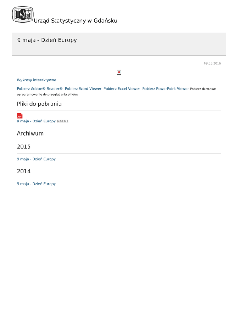 Urząd Statystyczny w Gdańsku 9 maja - Dzień Europy 09.05.2016 Wykresy interaktywne Pobierz Adobe® Reader® Pobierz Word Viewer Pobierz Excel Viewer Pobierz PowerPoint Viewer Pobierz darmowe oprogramowanie do przeglądania plików: Pliki do pobrania 9 maja - Dzień Europy 9.44 MB Archiwum 2015 9 maja - Dzień Europy 2014 9 maja - Dzień Europy
