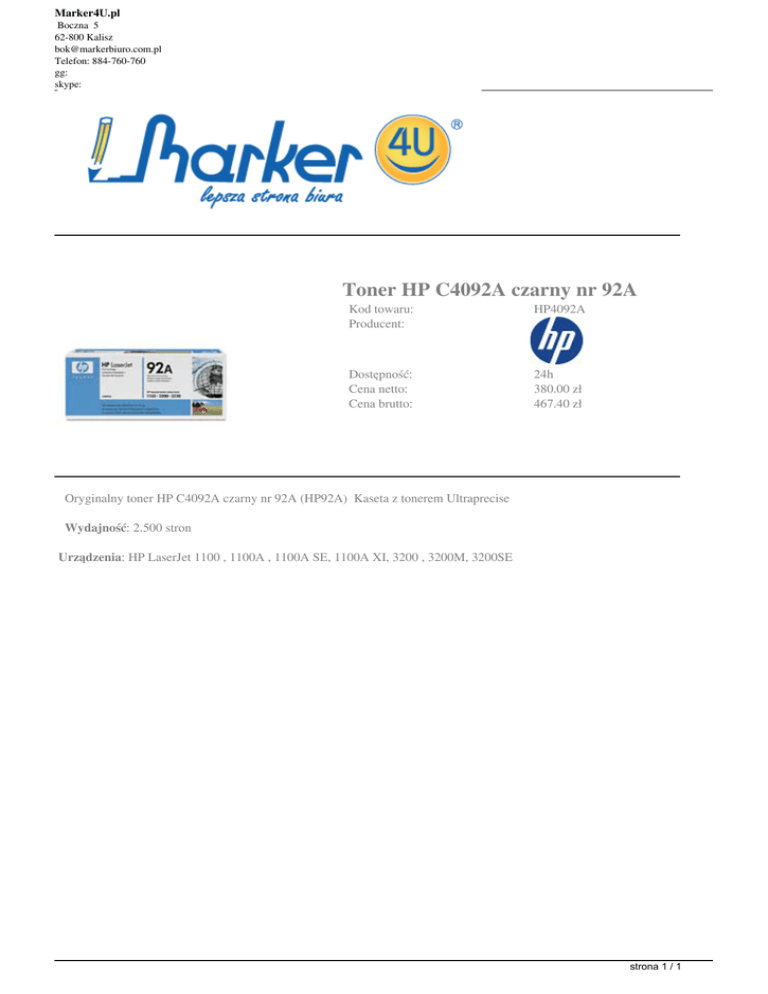 Marker4U.pl Boczna 5 62-800 Kalisz [email protected] Telefon: 884-760-760 gg: skype: Toner HP C4092A czarny nr 92A Kod towaru: Producent: HP4092A Dostępność: Cena netto: Cena brutto: 24h 380.00 zł 467.40 zł Oryginalny toner HP C4092A czarny nr 92A (HP92A) Kaseta z tonerem Ultraprecise Wydajność: 2.500 stron Urządzenia: HP LaserJet 1100 , 1100A , 1100A SE, 1100A XI, 3200 , 3200M, 3200SE strona 1 / 1 Powered by TCPDF (www.tcpdf.org)