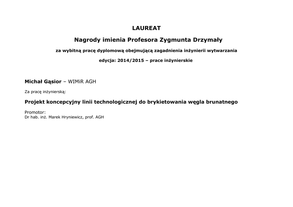 LAUREAT Nagrody imienia Profesora Zygmunta Drzymały za wybitną pracę dyplomową obejmującą zagadnienia inżynierii wytwarzania edycja: 2014/2015 – prace inżynierskie Michał Gąsior – WIMiR AGH Za pracę inżynierską: Projekt koncepcyjny linii technologicznej do brykietowania węgla brunatnego Promotor: Dr hab. inż. Marek Hryniewicz, prof. AGH