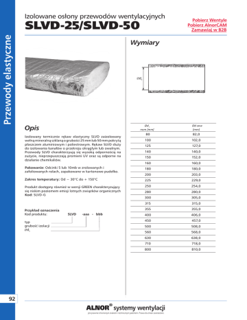 Izolowane osłony przewodów wentylacyjnych Przewody elastyczne SLVD-25/SLVD-50 Wymiary d1 Opis d1 nom [mm] Izolowany termicznie rękaw elastyczny SLVD zaizolowany wełną mineralną szklaną o grubości 25 mm lub 50 mm pokrytą płaszczem aluminiowym i poliestrowym. Rękaw SLVD służy do izolowania kanałów o przekroju okrągłym lub owalnym. Przewody SLVD charakterzyują się wysoką odpornością na zużycie, nieprzepuszczają promieni UV oraz są odporne na działanie chemikaliów. Pakowanie: Odcinki 5 lub 10mb w zrolowanych i zafoliowanych rolach, zapakowane w kartonowe pudełko. d zew [mm] 80 82,0 100 102,0 125 127,0 140 140,0 150 152,0 160 160,0 180 180,0 200 203,0 Zakres temperatury: Od − 30°C do + 150°C 225 229,0 Produkt dostępny również w wersji GREEN charakteryzujący się niskim poziomem emisji lotnych związków organicznych Kod: SLVD-G 250 254,0 280 280,0 300 305,0 315 315,0 355 355,0 400 406,0 450 457,0 500 508,0 560 568,0 630 638,0 Przykład oznaczenia Kod produktu: SLVD -aaa - bbb typ grubość izolacji d1 92 Pobierz Wentyle Pobierz AlnorCAM Zamawiaj w B2B 710 718,0 800 810,0 http://www.alnor.com.pl/produkty_pl/Przewody-elastyczne.html ALNOR® systemy wentylacji jest prawnie chronionym znakiem i technicznym patentem. Prawo do zmian zastrzeżone.