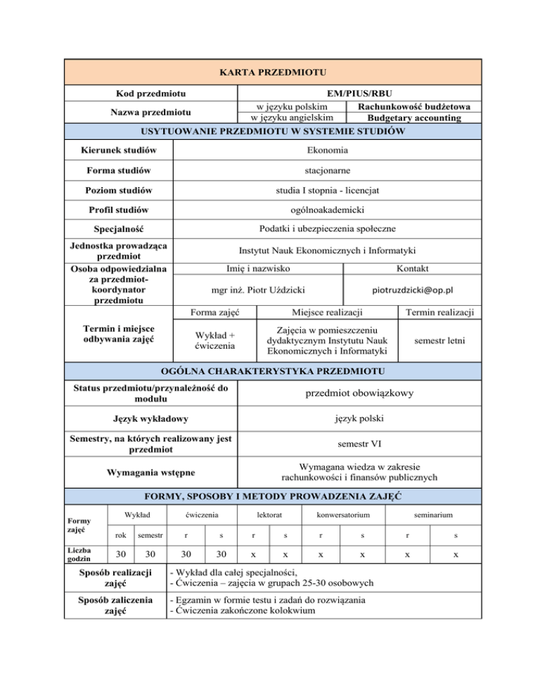 KARTA PRZEDMIOTU Kod przedmiotu EM/PIUS/RBU w języku polskim Rachunkowość budżetowa w języku angielskim Budgetary accounting Nazwa przedmiotu USYTUOWANIE PRZEDMIOTU W SYSTEMIE STUDIÓW Kierunek studiów Ekonomia Forma studiów stacjonarne Poziom studiów studia I stopnia - licencjat Profil studiów ogólnoakademicki Specjalność Podatki i ubezpieczenia społeczne Jednostka prowadząca przedmiot Osoba odpowiedzialna za przedmiotkoordynator przedmiotu Instytut Nauk Ekonomicznych i Informatyki Imię i nazwisko Kontakt mgr inż. Piotr Uździcki [email protected] Forma zajęć Miejsce realizacji Termin realizacji Wykład + ćwiczenia Zajęcia w pomieszczeniu dydaktycznym Instytutu Nauk Ekonomicznych i Informatyki semestr letni Termin i miejsce odbywania zajęć OGÓLNA CHARAKTERYSTYKA PRZEDMIOTU Status przedmiotu/przynależność do modułu przedmiot obowiązkowy Język wykładowy język polski Semestry, na których realizowany jest przedmiot semestr VI Wymagania wstępne Wymagana wiedza w zakresie rachunkowości i finansów publicznych FORMY, SPOSOBY I METODY PROWADZENIA ZAJĘĆ Formy zajęć Liczba godzin Wykład ćwiczenia lektorat konwersatorium seminarium rok semestr r s r s r s r s 30 30 30 30 x x x x x x Sposób realizacji zajęć - Wykład dla całej specjalności, - Ćwiczenia – zajęcia w grupach 25-30 osobowych Sposób zaliczenia zajęć - Egzamin w formie testu i zadań do rozwiązania - Ćwiczenia zakończone kolokwium Metody dydaktyczne - prezentacja i przekazywanie wiedzy z użyciem technik multimedialnych, - rozwiązywanie zadań i przykładów, - analiza przypadków, - dyskusja dydaktyczna, - praca w grupach. Przedmioty powiązane/moduł Wykaz literatury Podstawowa Uzupełnia jąca Rachunkowość, Finanse publiczne, System podatkowy 1. M. Kaczurak-Kozak, K. Winiarska, Rachunkowość budżetowa, Oficyna a Wolters Kluwer business, Warszawa 2013. 2. A. Zysnarska, Rachunkowość budżetu, jednostek budżetowych i samorządowych zakładów budżetowych, ODDK, Gdańsk 2014. 3. K. Gąsiorek, Nowa sprawozdawczość budżetowa z komentarzem do zmian, INFOR, Warszawa 2014. 1. Finanse publiczne z elementami prawa podatkowego, red. W. Grześkiewicz, Difin, Warszawa 2014. 2. Ustawa z 27 sierpnia 2009 o finansach publicznych, Dz. U. z 2009 nr 157 poz. 1240. CELE, TREŚCI I EFEKTY KSZTAŁCENIA Cele przedmiotu (ogólne, szczegółowe) C01. Zapoznanie studentów z podstawowymi pojęciami, aktualnymi przepisami i wymaganiami w zakresie rachunkowości jednostek sektora finansów publicznych. C02. Ukształtowanie u studentów praktycznych umiejętności ewidencjonowania operacji gospodarczych zachodzących w jednostkach sektora finansów publicznych oraz interpretowania sprawozdań budżetowych i finansowych. C03. Ukształtowanie u studentów świadomości ciągłych zmian prawnych zachodzących w rachunkowości jednostek sektora finansów publicznych. Treści programowe Efekty kształcenia (kody) Liczba godzin Forma zajęć Temat Wykład W 1 – Charakterystyka sektora finansów publicznych (istota, podmioty, zadania). Podstawy prawne gospodarki finansowej w sektorze budżetowym. Plan budżetowy, jego opracowanie i zasady budżetu 2 W01 U01 K01 W 2 – Budżet państwa i jednostki samorządu terytorialnego. Dysponenci środków budżetowych. Wykonanie i kontrola budżetu. Klasyfikacja budżetowa.. 2 W01 W02 W 3 – Formy organizacyjno-prawne podmiotów sektora finansów publicznych: jednostka budżetowa, samorządowy zakład budżetowy, agencja wykonawcza, instytucja gospodarki budżetowej, państwowy fundusz celowy. 2 W01, W02 U01 K01, K02 W 4-5 – Zasady gospodarki finansowej jednostek organizacyjnych sektora finansów publicznych. Rachunkowość jako system informacji ekonomicznej. Pojęcie, specyfika i zakres rachunkowości budżetowej. Merytoryczne i prawne ramy rachunkowości budżetowej. Organizacja i zasady rachunkowości budżetowej. Główny księgowy w jednostce sektora finansów publicznych. Międzynarodowe Standardy Rachunkowości Sektora Publicznego. Tendencje rozwojowe rachunkowości sektora publicznego. 4 W01, W02 U01 K01, K02 W 6 – Budowa i funkcjonowanie wzorcowego planu kont w jednostce sektora finansów publicznych. Wycena składników aktywów, rozrachunków i rozliczeń. 2 W01, W02 U01 K01 W 7-8a – Rachunkowość budżetów jednostek samorządu terytorialnego. Ewidencja: środków pieniężnych i kredytów, rozrachunków i rozliczeń, dochodów i wydatków budżetowych, wyniku wykonania budżetu, 3 W01 U01 K01, K02 pozabilansowa. Powiązania jednostki budżetowej z ewidencją budżetu. W01, W02 U01 K01 W 8b-9 - Rachunkowość samorządowych jednostek budżetowych. Ewidencja: dochodów i wydatków, kosztów i przychodów,. Ustalanie i podział wyniku finansowego. Ewidencja rachunku dochodów samorządowych. Ewidencja inwestycji. 3 W01, W02 U01 K01 W 10 – Rachunkowość samorządowych zakładów budżetowych. Ewidencja przychodów. Ustalanie wyniku finansowego. Rozliczenia z budżetem. Ewidencja inwestycji. 2 W01, W02 U01 K01 W 11 – Rachunkowość organów podatkowych jednostek samorządu terytorialnego. Organy podatkowe jednostek samorządu terytorialnego. Plan kont dla organów podatkowych. 2 W01, W02 U01, U02 K01 W 12 – Sprawozdawczość finansowa i budżetowa. Rodzaje sprawozdań budżetowych i jednostki zobowiązane do ich sporządzania. Obieg sprawozdań budżetowych. Zasady sporządzania oraz terminy przekazywania sprawozdań budżetowych. Rodzaje sprawozdań finansowych i proces ich sporządzania. 2 W01, W02 U01, U02 K01, K02 W 13 – Plan finansowy wydatków budżetowych w układzie zadaniowym. Zasady tworzenia budżetu zadaniowego. Zasady i modele ewidencji budżetu zadaniowego w sektorze publicznym. Budżet zadaniowy a sprawozdawczość w różnych formach organizacyjnoprawnych jednostek. 2 W01, W02 U01, U02 K01, K02 W 14 – Płatności z budżetu środków europejskich. Ewidencja funduszy pomocowych Unii Europejskiej. 2 W01, W02 U01, U02 K01, 