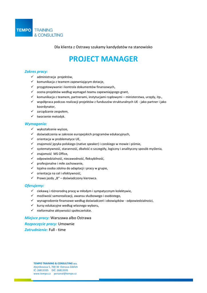 Dla klienta z Ostrawy szukamy kandydatów na stanowisko PROJECT MANAGER Zakres pracy: administracja projektów, komunikacja z teamem zapewniającym dotacje, przygotowywanie i kontrola dokumentów finansowych, ocena projektów według wymagań teamu zapewniającego grant, komunikacja z teamem, partnerami, instytucjami rządowymi – ministerstwa, urzędy, itp., współpraca podczas realizacji projektów z funduszów strukturalnych UE - jako partner i jako koordynator, zarządzanie zespołem, tworzenie metodyk. Wymagania: wykształcenie wyższe, doświadczenia w zakresie europejskich programów edukacyjnych, orientacja w problematyce UE, znajomość języka polskiego (native speaker) i czeskiego w mowie i piśmie, systematywność, staranność, dbałość o szczegóły, logiczny i analityczny sposób myślenia, znajomość MS Office, odpowiedzialność, niezawodność, fleksybilność, profesjonalne i miłe zachowanie, lojalna osoba zdolna do adaptacji i pracy w grupie, orientacja na cel i efektywność, Prawo jazdy „B“ – doświadczony kierowca. Oferujemy: ciekawą i różnorodną pracę w młodym i sympatycznym kolektywie, możliwość samorealizacji, awansu służbowego i osobistego, wynagrodzenie finansowe według doświadczeń i obowiązków - odpowiedzialności, kursy edukacyjne według własnego wyboru, nieformalne aktywności społeczeńskie. Miejsce pracy: Warszawa albo Ostrawa Rozpoczęcie pracy: Umownie Zatrudnienie: Full - time TEMPO TRAINING & CONSULTING a.s. Alejnikovova 5, 700 30 Ostrava-Zábřeh IČ: 26813335 DIČ: 26813335 www.tempo.cz [email protected] Jeżeli jesteś zainteresowany/a tą ofertą, zaznacz „ODPOWIEDŹ“ i wyślij swoje CV wraz z następnym oświadczeniem: "Wyrażam zgodę na przetwarzanie moich danych osobowych zawartych w mojej ofercie pracy dla potrzeb niezbędnych do realizacji procesu rekrutacji przez firmę TEMPO, IČ 26 81 33 35 (zgodnie z ustawą z dn. 29.08.97 roku o Ochronie Danych Osobowych Dz. Ust Nr 133 poz. 883") aż do odwołania pisemnego. Osoba kontaktowa: Mgr. Hana Medunová Tel.: 734 513 727 E-mail: [email protected] TEMPO TRAINING & CONSULTING a.s. Alejnikovova 5, 700 30 Ostrava-Zábřeh IČ: 26813335 DIČ: 26813335 www.tempo.cz [email protected]