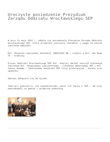 Uroczyste posiedzenie Prezydium Zarządu Oddziału Wrocławskiego SEP W dniu 11 maja 2015 r. odbyło się posiedzenie Prezydium Zarządu Oddziału Wrocławskiego SEP, które przybrało uroczysty charakter z uwagi na udział jubilatów Oddziału: Kol. Zbigniew Lubczyński obchodził JUBILEUSZ 80 – urodzin a Kol. Jan Rudy 75 – urodziny. Prezes Oddziału Wrocławskiego SEP Kol. Andrzej Hachoł wręczył Szanownym Jubilatom Kol. Zbigniewowi Lubczyńskiemu – Członkowi Honorowemu SEP i Kol. Janowi Rudemu – Zasłużonemu Seniorowi SEP listy gratulacyjne , kwiaty oraz upominki. Zebrani dołączyli się do życzeń. Jubilaci podzielili się wspomnieniami jakie ich łączą z SEP – em oraz podziękowali za pamięć i serdeczną atmosferę. inż. Krzysztof Nowicki Wiceprezes Oddziału Wrocławskiego SEP. Inżynier elektryk, specjalista w dziedzinie systemów zasilania oraz utrzymania sieci trakcyjnej transportu kolejowego. Wieloletni członek prezydium Oddz. Wrocławskiego SEP, prezes Oddziału w latach 2006-2010, wybrany ponownie na kadencję 2010-2014. Od 1985r. pełnił funkcję Zastępcy Naczelnika Oddziału Zasilania Elektroenergetycznego PKP, a następnie Zastępcy Głównego Energetyka i Głównego Energetyka Dolnośląskiego Okręgu Kolei Państwowych we Wrocławiu.W czerwcu 1998r. objął stanowisko dyrektora Zakładu Dolnośląskiego we Wrocławiu, w PKP Energetyka spółka z o.o. Krzysztof Nowicki, pracując nieprzerwanie, od 1969r. do przejścia na emeryturę w 20l0r., dla PKP – odznaczał się szczególnym zaangażowaniem i innowacyjnością w pracy. Między innymi jest współautorem nowoczesnych pojazdów do utrzymania sieci trakcyjnej i posiada na nie świadectwo wzoru użytkowego. Za swą pracę zawodową jak i społeczną otrzymał wiele wyróżnień i odznaczeń. Otrzymane przezeń odznaczenia i wyróżnienia charakteryzują dobrze jego zasługi, jako specjalisty w dziedzinach zasilania i utrzymania sieci trakcyjnych w transporcie kolejowym, a równocześnie – w umiejętnym zarządzaniu, co znajduje uznanie w środowisku elektryków. Dr inż. Andrzej Hachoł Prezes Oddziału Wrocławskiego SEP. dr inż. elektronik, autor wielu wdrożeń przemysłowych, specjalista w dziedzinie inżynierii biomedycznej, dydaktyk, działacz SEP. Urodził się 20 lutego 1953 r. w Sosnowcu. W roku 1968 rozpoczął naukę na Wydziale Elektrycznym Śląskich Technicznych Zakładów Naukowych w Katowicach, gdzie otrzymał tytuł technika elektryka w specjalności „Elektryczna i elektroniczna automatyka przemysłowa”. Studia na Wydziale Elektroniki Politechniki Wrocławskiej (1973-1978) ukończył z wyróżnieniem i uzyskał tytuł magistra inżyniera elektronika w specjalności „Metrologia elektryczna”. Równolegle ze studiami magisterskimi (po czwartym roku) podjął studia doktoranckie w ramach programu „Talent”, które ukończył w roku 1981, i po przedstawieniu pracy doktorskiej pt. „Metoda wieloparametrowego pomiaru w niekontrolowanych warunkach” uzyskał stopień naukowy doktora nauk technicznych. W 1981 r. zatrudniony został w Politechnice Wrocławskiej na stanowisku adiunkta naukowo-dydaktycznego. Oprócz pracy na uczelni, odbył staże przemysłowe krajowe i zagraniczne oraz pracował w przemyśle m.in. odbył praktykę zawodową w korporacji Public Power Corporation S.A. (Grecja) oraz staż naukowy w Instytucie Mechaniki Polimerów Łotewskiej Akademii Nauk. Pracował w Instytucie Komputerowych Systemów Automatyki i Pomiarów IKSAiP (w latach 1996-1997 pełnił w IKSAiP obowiązki Zastępcy Dyrektora ds. Rozwoju). Ponadto był współzałożycielem i wiceprezesem ds. naukowych firmy hi-tech Centrum Ophtha-Lab. zajmującej się opracowaniem mikroprocesorowych biomedycznych przyrządów pomiarowych i mikroprocesorowych rozproszonych systemów pomiarowo-rozliczeniowych. Jest współzałożycielem i członkiem Rady Programowej Centrum Inżynierii Biomedycznej Politechniki Wrocławskiej. Od 1979 roku jest członkiem SEP, a od 1987 rzeczoznawcą SEP w specjalności Cybernetyka Techniczna i Technika Pomiarowa. Opracował wiele ekspertyz i opinii technicznych z zakresu poprawności rozwiązań urządzeń i układów pomiarowych wielkości nieelektrycznych, zgodności wyrobów z normami oraz oceny innowacyjności wyrobów. W latach 2002-2006 był członkiem Komisji Rewizyjnej Oddziału Wrocławskiego SEP. Od 2006 roku jest wiceprezesem Oddziału Wrocławskiego SEP i Przewodniczącym Rady Ośrodka Rzeczoznawstwa SEP we Wrocławiu. Od 2012 r. jest członkiem Centralnego Komitetu Inżynierii Biomedycznej SEP. Od 2008 r. jest członkiem Komisji współpracy z Uczelniami Wrocławskiej Rady Federacji Stowarzyszeń Naukowo-Technicznych NOT. Jest członkiem założycielem Polskiego Towarzystwa Techniki Sensorowej oraz Polskiego Towarzystwa Inżynierii Biomedycznej. XXXVI WZD SEP Szanowne Koleżanki i Koledzy Z dużą satysfakcją przekazuję informacje o wynikach odbytego w dniach 5.8. czerwca 2014 r. Walnego Zjazdu Delegatów SEP w Szczecinie. Zjazd wybrał nowe Władze na kadencję 2014-2018 oraz przyjął uchwały programowe. W Zjeździe brali udział wszyscy delegaci Oddziału Wrocławskiego (11 osób) oraz trzech członków honorowych. Jedną z pierwszych decyzji Zjazdu, były głosowania nad nadaniem godności Członka Honorowego SEP. Zaszczytem tym wyróżniono 9 osób. Godność Członka Honorowego nadano m.in. Kol. Janowi Zuzokowi z Oddziału Wrocławskiego. Zjazd przyjął uchwały programowe oraz przyjął uchwałę o powołaniu Komisji Statutowej, której zadaniem jest przygotowanie nowelizacji Statutu. Prezesem SEP na kadencję 2014 – 2018 wybrany został Kol. Piotr Szymczak z Oddziału Szczecińskiego. W wyborach do organów statutowych wybrani zostali wszyscy zgłoszeniu przez nasz Oddział Kandydaci. Do Zarządu Głównego SEP wybrani zostali Kol. Krzysztof Nowicki i Kol. Jan Pytlarz. W nowo ukonstytuowanym Zarządzie Głównym funkcję Wiceprezesa pełnił b