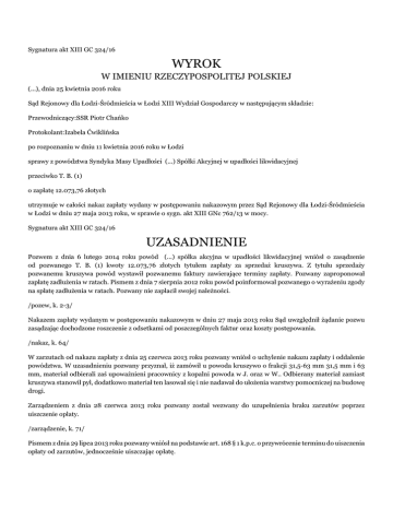 Sygnatura akt XIII GC 324/16 WYROK W IMIENIU RZECZYPOSPOLITEJ POLSKIEJ (...), dnia 25 kwietnia 2016 roku Sąd Rejonowy dla Łodzi-Śródmieścia w Łodzi XIII Wydział Gospodarczy w następującym składzie: Przewodniczący:SSR Piotr Chańko Protokolant:Izabela Ćwiklińska po rozpoznaniu w dniu 11 kwietnia 2016 roku w Łodzi sprawy z powództwa Syndyka Masy Upadłości (...) Spółki Akcyjnej w upadłości likwidacyjnej przeciwko T. B. (1) o zapłatę 12.073,76 złotych utrzymuje w całości nakaz zapłaty wydany w postępowaniu nakazowym przez Sąd Rejonowy dla Łodzi-Śródmieścia w Łodzi w dniu 27 maja 2013 roku, w sprawie o sygn. akt XIII GNc 762/13 w mocy. Sygnatura akt XIII GC 324/16 UZASADNIENIE Pozwem z dnia 6 lutego 2014 roku powód (...) spółka akcyjna w upadłości likwidacyjnej wniósł o zasądzenie od pozwanego T. B. (1) kwoty 12.073,76 złotych tytułem zapłaty za sprzedaż kruszywa. Z tytułu sprzedaży pozwanemu kruszywa powód wystawił pozwanemu faktury zawierające terminy zapłaty. Pozwany zaproponował zapłatę zadłużenia w ratach. Pismem z dnia 7 sierpnia 2012 roku powód poinformował pozwanego o wyrażeniu zgody na spłatę zadłużenia w ratach. Pozwany nie zapłacił swojej należności. /pozew, k. 2-3/ Nakazem zapłaty wydanym w postępowaniu nakazowym w dniu 27 maja 2013 roku Sąd uwzględnił żądanie pozwu zasądzając dochodzone roszczenie z odsetkami od poszczególnych faktur oraz koszty postępowania. /nakaz, k. 64/ W zarzutach od nakazu zapłaty z dnia 25 czerwca 2013 roku pozwany wniósł o uchylenie nakazu zapłaty i oddalenie powództwa. W uzasadnieniu pozwany przyznał, iż zamówił u powoda kruszywo o frakcji 31,5-63 mm 31,5 mm i 63 mm, materiał odbierali zaś upoważnieni pracownicy z kopalni powoda w J. oraz w W.. Odbierany materiał zamiast kruszywa stanowił pył, dodatkowo materiał ten lasował się i nie nadawał do ułożenia warstwy pomocniczej na budowę drogi. Zarządzeniem z dnia 28 czerwca 2013 roku pozwany został wezwany do uzupełnienia braku zarzutów poprzez uiszczenie opłaty. /zarządzenie, k. 71/ Pismem z dnia 29 lipca 2013 roku pozwany wniósł na podstawie art. 168 § 1 k.p.c. o przywrócenie terminu do uiszczenia opłaty od zarzutów, jednocześnie uiszczając opłatę. /wniosek o przywrócenie terminu, k. 74, dowód uiszczenia opłaty, k. 75, pozycja wpłaty, k. 79/ Postanowieniem z dnia 14 sierpnia 2013 roku Sąd oddalił wniosek powoda z dnia 22 lipca 2013 roku o nadanie klauzuli wykonalności nakazowi zapłaty. /postanowienie, k. 80/ Pismem z dnia 9 września 2014 roku pełnomocnik powoda poinformował Sąd iż Sąd Rejonowy w Kielcach postanowieniem z dnia 25 lipca zmienił sposób prowadzenia postępowania upadłościowego strony powodowej na upadłość likwidacyjną. /pismo syndyka, k. 102/ Postanowieniem z dnia 2 listopada 2015 roku Sąd zawiesił postępowanie w sprawie na podstawie art. 174 § 1 pkt 4 k.p.c. i wezwał syndyka masy upadłości (...) S.A. w upadłości likwidacyjnej do wzięcia udziału w sprawie. Postanowieniem z dnia 2 listopada 2015 roku Sąd przywrócił termin do uiszczenia opłaty od zarzutów. /protokół rozprawy, k. 114odw./ Pismem z dnia 27 listopada 2015 roku syndyk T. S. złożył oświadczenie o wstąpieniu do postępowania. /pismo syndyka, k. 115/ Postanowieniem z dnia 4 grudnia 2015 roku Sąd podjął zawieszone postępowanie z udziałem syndyka masy upadłości (...) S.A. w upadłości likwidacyjnej. /postanowienie, k. 122/ Na rozprawie w dniu 17 lutego 2016 roku Sąd uznając, że zarzuty zostały wniesione w terminie zaś opłata od zarzutów uzupełniona zakreślił sprawę w repertorium GNc i nakazał wpisanie sprawy pod nowy numer w repertorium GC oraz zarządził doręczenie zarzutów od nakazu zapłaty syndykowi masy upadłości. /protokół rozprawy, k. 129odw./ W piśmie z dnia 7 marca 2016 roku pozwany podniósł kolejne zarzuty: nieudowodnienia przez powoda spełnienia świadczenia wzajemnego, braku wykazania wydania towaru kierowcom, zapłaty przez pozwanego za 79,02 ton kruszywa, braku doręczenia pozwanemu faktur VAT objętych pozwem. Pozwany zakwestionował, iż złożył oświadczenie o rozłożeniu świadczenia na raty. W uzasadnieniu podniósł, iż dokonał zamówienia 200 ton kruszywa za 20 złotych netto za tonę za pośrednictwem e-maila, zaś do odbioru kruszywa upoważnił R. S. (1), który łącznie odebrał 79,02 ton kruszywa za cenę 1.943,89 złotych, za które zapłacił w formie zaliczki wynoszącej 3.800 złotych. Pozostałe osoby wymienione w dokumentach WZ nie odbierały kruszywa dla pozwanego. /pismo, k. 132-137/ Pismem z dnia 14 marca 2015 roku, w odpowiedzi na zarzuty strony pozwanej, powód wniósł o utrzymanie nakazu zapłaty w całości w mocy. W uzasadnieniu powód podniósł, iż pozwany nie reklamował wydanego kruszywa i odbierał je, zatem twierdzenie o wydaniu mu pyłu może budzić jedynie zdziwienie. Powód nie złożył reklamacji odnośnie zakupionego kruszywa, zamówił kruszywo określonej frakcji i je otrzymał. Nie informował także o wymogach projektu budowlanego, zatem jako nie mające znaczenia dla sprawy oraz nieudowodnione należy ocenić zarzut wadliwości kruszywa przy budowie drogi, w tym rzekomo poniesione koszty związane z jego naprawą. Pozostałe twierdzenia i zarzuty były zaś w ocenie powoda spóźnione. Do pisma załączono pismo pozwanego, wskazujące na problemy z płynnością finansową i zawierające propozycję wypracowania wspólnej strategii spłaty zadłużenia. /pismo, k. 139-145/ Sąd ustalił następujący stan faktyczny: Powód i pozwany wykonują działalność gospodarczą. Powód zajmuje się wydobyciem kruszywa, pozwany prowadzi działalność budowlaną. Strony łączyła umowa sprzedaży kruszywa mocą której pozwany nabywał od powoda kruszywo budowlane. /okoliczność przyzna w zarzutach od nakazu zapłaty oraz w piśmie z dnia 7 marca 2016 roku/ W dniu 10 października 2011 roku