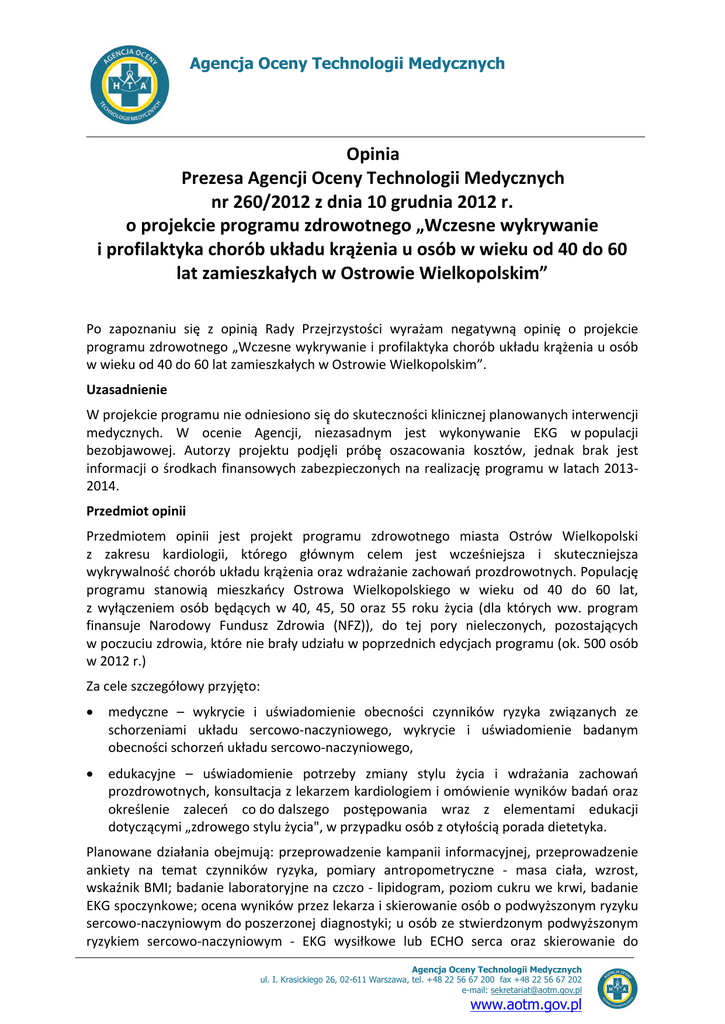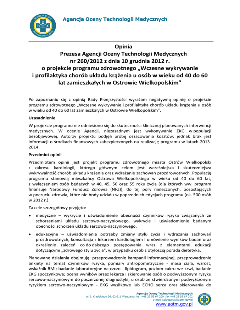 Agencja Oceny Technologii Medycznych Opinia Prezesa Agencji Oceny Technologii Medycznych nr 260/2012 z dnia 10 grudnia 2012 r. o projekcie programu zdrowotnego „Wczesne wykrywanie i profilaktyka chorób układu krążenia u osób w wieku od 40 do 60 lat zamieszkałych w Ostrowie Wielkopolskim” Po zapoznaniu się z opinią Rady Przejrzystości wyrażam negatywną opinię o projekcie programu zdrowotnego „Wczesne wykrywanie i profilaktyka chorób układu krążenia u osób w wieku od 40 do 60 lat zamieszkałych w Ostrowie Wielkopolskim”. Uzasadnienie W projekcie programu nie odniesiono się ̨ do skuteczności klinicznej planowanych interwencji medycznych. W ocenie Agencji, niezasadnym jest wykonywanie EKG w populacji bezobjawowej. Autorzy projektu podjęli próbę ̨ oszacowania kosztów, jednak brak jest informacji o środkach finansowych zabezpieczonych na realizację programu w latach 20132014. Przedmiot opinii Przedmiotem opinii jest projekt programu zdrowotnego miasta Ostrów Wielkopolski z zakresu kardiologii, którego głównym celem jest wcześniejsza i skuteczniejsza wykrywalność chorób układu krążenia oraz wdrażanie zachowań prozdrowotnych. Populację programu stanowią mieszkańcy Ostrowa Wielkopolskiego w wieku od 40 do 60 lat, z wyłączeniem osób będących w 40, 45, 50 oraz 55 roku życia (dla których ww. program finansuje Narodowy Fundusz Zdrowia (NFZ)), do tej pory nieleczonych, pozostających w poczuciu zdrowia, które nie brały udziału w poprzednich edycjach programu (ok. 500 osób w 2012 r.) Za cele szczegółowy przyjęto: • medyczne – wykrycie i uświadomienie obecności czynników ryzyka związanych ze schorzeniami układu sercowo-naczyniowego, wykrycie i uświadomienie badanym obecności schorzeń układu sercowo-naczyniowego, • edukacyjne – uświadomienie potrzeby zmiany stylu życia i wdrażania zachowań prozdrowotnych, konsultacja z lekarzem kardiologiem i omówienie wyników badań oraz określenie zaleceń co do dalszego postępowania wraz z elementami edukacji dotyczącymi „zdrowego stylu życia", w przypadku osób z otyłością porada dietetyka. Planowane działania obejmują: przeprowadzenie kampanii informacyjnej, przeprowadzenie ankiety na temat czynników ryzyka, pomiary antropometryczne - masa ciała, wzrost, wskaźnik BMI; badanie laboratoryjne na czczo - lipidogram, poziom cukru we krwi, badanie EKG spoczynkowe; ocena wyników przez lekarza i skierowanie osób o podwyższonym ryzyku sercowo-naczyniowym do poszerzonej diagnostyki; u osób ze stwierdzonym podwyższonym ryzykiem sercowo-naczyniowym - EKG wysiłkowe lub ECHO serca oraz skierowanie do Agencja Oceny Technologii Medycznych ul. I. Krasickiego 26, 02-611 Warszawa, tel. +48 22 56 67 200 fax +48 22 56 67 202 e-mail: [email protected] www.aotm.gov.pl Opinia Prezesa AOTM nr 260/2012 z dnia 10 grudnia 2012 r. kardiologa i wykonanie badań specjalistycznych w ramach poradni kardiologicznej. Program ma być zrealizowany w latach 2012-2014. Program ma być finansowany z budżetu miasta Ostrów Wielkopolski. Przewidywany koszt jednostkowy to około 100 zł na osobę. Planowany całkowity koszt przeznaczony na realizację programu w 2012 roku wyniesie 50 000 zł. Problem zdrowotny Choroby układu sercowo-naczyniowego obejmują chorobę niedokrwienną serca, chorobę naczyniowo-mózgową, nadciśnienie tętnicze, chorobę naczyń obwodowych, chorobę reumatyczną serca, wrodzone wady serca, zakrzepicę żył głębokich i zatorowość płucną. Choroby te stanowią jeden głównych problemów zdrowotnych współczesnego społeczeństwa. Choroby sercowo-naczyniowe są najczęstszą przyczyną zgonów zarówno wśród mężczyzn, jak i kobiet, stanowią główną przyczynę hospitalizacji, prowadząc do inwalidztwa. Realizacja przez jst badań przesiewowych w kierunku chorób układu sercowo-naczyniowego, a także promocja zdrowego stylu życia oraz edukacja zdrowotna pacjentów wpisują się w cele Narodowego Programu Zdrowia na lata 2007-2015 dotyczące ograniczenia czynników ryzyka i działania w zakresie promocji zdrowia, jak również w cel operacyjny dotyczący usprawnienia wczesnej diagnostyki i czynnej opieki nad osobami zagrożonymi m.in. chorobami układu krążenia. Alternatywne świadczenia „Narodowy Fundusz Zdrowia gwarantuje badania profilaktyczne w zakresie chorób układu sercowo-naczyniowego dla osób będących w 35, 40, 45, 50, 55 roku życia. W związku z powyższym, miasto zdecydowało się uzupełnić program NFZ i zaoferować badania profilaktyczne dodatkowej populacji będącej w wieku od 40 do 60 lat, z wyłączeniem osób będących w 40, 45, 50, 55 roku życia”. W związku z tym można uznać, że dla zaproponowanej przez autorów projektu populacji docelowej brak jest alternatywnych świadczeń. Wnioski z oceny przeprowadzonej przez Agencję Wnioski z oceny problemu zdrowotnego Choroby sercowo-naczyniowe stanowią istotny problem terapeutyczny oraz społecznoekonomiczny. Do czynników ryzyka sercowo-naczyniowego podlegających modyfikacji należą: nieprawidłowe żywienie, palenie tytoniu, mała aktywność fizyczna, podwyższone ciśnienie tętnicze, zaburzenia gospodarki lipidowej (podwyższone stężenie w osoczu cholesterolu LDL, triglicerydów i niskie stężenie HDL-cholesterolu), upośledzona tolerancja glukozy lub cukrzyca, nadwaga otyłość. Badania epidemiologiczne i socjomedyczne pokazują, że ważną rolę w rozwoju chorób układu krążenia odgrywają niewłaściwe wzorce zachowań składające się na współczesny styl życia. Są to: niewłaściwe odżywianie się, mała aktywność ruchowa, palenie papierosów, picie alkoholu, stres. Realizacja przez jst badań przesiewowych w kierunku chorób sercowo naczyniowych (oraz cukrzycy) , jak również promocja zdrowego stylu życia i edukacja pacjentów, wpisują się w cele Narodowego Programu Zdrowotnego na lata 2007-2015 dotyczące ograniczenia czynników ryzyka i działania