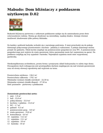 Mabudo: Dom bliźniaczy z poddaszem użytkowym D.02 Budynek bliniaczy parterowy z użtkowym poddaszem nadaje się do zamieszkania przez dwie czteroosobowe rodziny. Można go zbudować na niewielkiej, wąskiej działce. Istnieje również możliwość zbudowania tylko połowy bliźniaka. Do każdej z połówek budynku wchodzi się z narożnego podcienia. Z sieni przechodzi się do pokoju dziennego połączonego przestrzennie z kuchnio - jadalnią (z wykuszem). Z pokoju dziennego można przejść do gabinetu. Obok kuchni znajduje się pomieszczenie gospodarcze oraz WC. Z pomieszczenia gospodarczego jest wyjście do wiaty garażowej, która opcjonalnie może być zamieniona na garaż. Na poddaszu znajdują się trzy sypialnie i łazienka. Największa sypialnia może mieć wygrodzoną garderobę. Nieskomplikowana architektura, prosta forma i przejrzysty układ funkcjonalny to zalety tego domu. Dwuspadowy dach wzbogacony jest prostopadłym dachem znajdującym się nad wiatami garażowymi oraz od strony elewacji ogrodowej nad wyjściem na taras. Powierzchnia użytkowa - 136,3 m2 Powierzchnia całkowita - 178,1 m2 Minimalne wymiary działki szerokość - 22,50 m Minimalne wymiary działki długość - 27,50 m Ilość poziomów - parterowy z poddaszem Zestawienie powierzchni netto: 1 sień - 1,9 m2 2 hall - 15,8 m2 3 pokój dzienny - 25,9 m2 4 kuchnia + jadalnia - 13,6 m2 5 WC - 1,7 m2 6 gabinet - 9,3 m2 7 pomieszczenie gosp. - 8,9 m2 8 wiata garażowa - 19,8 m2 9 komunikacja - 4,6 m2 10 sypialnia - 13,5 m2 11 sypialnia - 13,1 m2 12 sypialnia - 18 m2 13 łazienka - 10 m2 KONTAKT Mabudo E-mail: [email protected] WWW: www.mabudo.pl Tel: +48 43 823 41 41 Fax: +48 43 823 41 42 Adres: Ceramiczna 8 98-220 Zduńska Wola