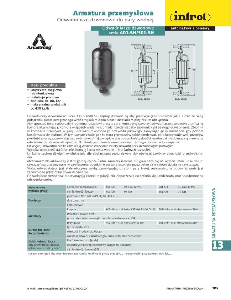Armatura przemysłowa Odwadniacze dzwonowe do pary wodnej Odwadniacze dzwonowe seria 401-SH/501-SH B B BB BB A A Opis produktu • korpus stal węglowa lub nierdzewna • instalacja pionowa • cisnienie do 106 bar • maksymalna wydajność do 430 kg/h Model 501-SH Model 401-SH Maksymalne warunki pracy ciśnienie/temperatura: 401-SH 69 bar/427°C 501-SH 105 bar/454°C ciśnienie różnicowe: 401-SH 69 bar 401-SH 105 bar gwintowe NPT lub BSPT (tylko 401-SH) Przyłącza do spawania kołnierzowe korpus: Materiały Dobór odwadniacza Aby prawidłowo dobrać odwadniacz należy znać: 501-SH – stal nierdzewna 316L pozostałe części wewnętrzne: stal nierdzewna – 304 przyłącza: Niezbędne dane do zamówienia 401-SH – stal kuta ASTMA A 106 Gr. B gniazdo i zawór: stelit 401-SH – stal nierdzewna 304 501-SH – stal nierdzewna 316 typ odwadniacza wielkość i rodzaj przyłącza wielkość otworu zaworowego / max. ciśnienie różnicowe ARMATURA PRZEMYSŁOWA Odwadniaczy dzwonowych serii 401-SH/501-SH zaprojektowane są aby przezwyciężać trudności jakie niesie ze sobą połączenie ciepła przegrzanego wraz z wysokim ciśnieniem / działaniem przy niskim obciążeniu. Aby sprostać temu najbardziej trudnemu rodzajowi pracy z parą, Armstrong stworzył odwadniacze dzwonowe z unikalną komorą akumulującą. Komora w sposób wydajny gromadzi kondensat aby zapewnić cykl pełnego odwadniania. Zbiornik w komnacie przepływa w górę i dół wzdłuż wlotowego przewodu parowego, zamykając go w momencie gdy poziom kondensatu się podnosi. W tym samym czasie gdy komora gromadzi w sobie kondensat, para kontynuuje swój przepływ poniżej dzwonu, zapewniając że zawór odwadniający będzie ciasno zamknięty dopóki kondensat nie zbierze się wewnątrz odwadniacza i dzwon nie opadnie. Działanie jest dwustawowe: zał/wył, żadnego dławienia lub kapania. Co więcej, odwadniacze te zawierają w sobie wszystkie zalety odwadniaczy dzwonowych parowych: Wysoka odporność na ścieranie, korozję i uderzenia wodne – bez żadnych uszczelek. Unikalny system dźwigni zwielokrotnia siłę dostarczaną przez dzwon, aby otwierać zawór w obecności przeciwciśnienia. Mechanizm zlokalizowany jest w górnej części. Żadne zanieczyszczenia nie gromadzą się na wylocie. Małe ilości zanieczyszczeń są utrzymywane w zawieszeniu dopóki nie zostaną usunięte przez pełne ciśnieniowe działanie czyszczące. Wylot odwadniający jest stale otoczony wodą, zapobiegając utratom pary żywej. Automatyczne odpowietrzanie jest zapewnione przez mały otwór w dzwonie. Odwadniacze dzwonowe nie wymagają żadnej regulacji. Nie dopuszczają do cofania się kondensatu oraz są odporne na uderzenia wodne. 13 ilość kondensatu [kg/h] współczynnik bezpieczeństwa (zapas na rozruch) ciśnienie różnicowe [ǻP] Należy pamiętać aby przy doborze zapewnić: możliwość pracy przy ǻPmax. i odpowiednią wydajność przy ǻPmin. e-mail: [email protected], tel. 032/7890103 ARMATURA PRZEMYSŁOWA 105 Armatura przemysłowa Odwadniacze dzwonowe do pary wodnej WYMIARY I WAGA Seria 401-SH i Seria 501-SH, przepływ poziomy Model Przyłącze kołnierzowe Przyłącze gwintowane A – średnica kołnierza B – (gwint i spaw) BB (kołnierz 401-SH PN100 & 501-SH PN250*) Waga (gwint i spaw) Waga (kołnierz 401-SH PN100 & 501-SH PN250*) 401-SH 501-SH 15 – 20 15 – 20 ½” – ¾” ½” – ¾” 100 260 – 253 100 350 353 – 363 476 – 480 5,5 7 6,7 – 7,3 13 – 13,5 *Inne rozmiary, średnice i typy kołnierzy są dostępne na zamówienie. Wszystkie modele są zgodne z artykułem 3.3 dyrektywy PED (97/23/EC). Zalecenia przy instalacji Model 401/501 PEQPXJFEOJ SP[NJBS OJFPEPQPXJFEOJ SP[NJBS Wymiary odstonika ARMATURA PRZEMYSŁOWA Odstojnik o odpowiednim rozmiarze będzie łapać kondensat. Zbyt małe o dstojnik może spowodować efekt kanału „piccolo” polegający na tym, że ciśnienie spycha kodensat poza kolanko i odwadniacz. 13 . % 8ZEBKOPw¿<LHI> Małe ilości kondensatu występują w instalacjach z ciepłem przegrzanym oraz wysokim ciśnieniem/ działaniem przy niskim obciążeniu gromadząc się w odstojnikach i odwadniaczach. Jednakże odpowiednie orurowanie i odstojniki o odpowiednich rozmiarach i średnicy są niezwykle istotne dla sprawnie działającego systemu odwadniaczy Armstronga zaprojektowanych dla ciepła przegrzanego. WYKRES WYDAJNOŚCI KONDENSATU W TEMPERATURZE PARY ) 3ÌOJDBDJwOJFÊ<CBS> LPNPSBHÌXOB QZXBL ,PNPSB BLVNVMVKBDB SVSB QBSPXB SVSB LPOEFOTBUV $ZLMr;BXÌSPEXBEOJBKDZT[FSPLP PUXBSUZ1BSBOBQFOJBLBOB XPEXBEOJBD[VVT[D[FMOJBKDLPNPSÃ LPOEFOTBUQS[FQZXBQS[F[LBOB [LPOEFOTBUFN[LPNPSZBLVNVMVKDFK EPLPNPSZPEXBEOJBD[B5P[BUBQJB E[XPOLUÌSZPUXJFSB[BXÌSPEXBEOJBKDZ DZLMXPEXBEOJBD[V ,PÊD[FOJFDZLMV8NPNFODJFHEZQP[JPN LPOEFOTBUVXLPNPS[FBLVNVMVKDFK PQBEBNJTFD[LB[BNZLBLBOBQBSPXZ QPSVT[BKDTJÃXEÌPUXJFSBKDQS[FKwDJF EMBQBSZLUÌSBXQZXBEPLPNPSZ PEXBEOJBD[B 0EXBEOJBD[[BNLOJÃUZ,JFEZQBSB [BD[ZOBQS[FQZXB¿QS[F[LPNPSÃ BLVNVMVKDJXHÌSÃEPLBOBVQBSPXFHP QPOJFKE[XPOVXLPNPS[FPEXBEOJBD[B [BXÌSPEXBEOJBKDZKFTUDJBTOP[BNLOJÃUZ 1PXJFUS[F $ZLMQS[FEQPXUÌS[FOJFNTJÃ 8NPNFODJFHEZQP[JPNLPOEFOTBUV QPEOPTJTJÃXLPNPS[FBLVNVMVKDFK NJTFD[LBVOPTJTJÃEPQÌLJQPOPXOJF OJF[BQJFD[ÃUVKFLBOBVQBSPXFHP JDZLMQPXUBS[BTJÃ 1BSB ,POEFOTBU Powietrze 106 ARMATURA PRZEMYSŁOWA tel. 032/7890103, e-mail: [email protected] Armatura przemysłowa Odwadniacze dzwonowe do pary wodnej ZALECANE WYMIARY ODNÓG ODWADNIAJĄCYCH DLA MAGISTRALI GŁÓWNYCH M in. ½” ¾” 1” 2” 3” 4” 6” 8” 10” 12” 14” 16” 18” 20” 24” H Długość odnogi odwadniającej w mm mm 250 250 250 250 250 250 250 300 380 450 530 600 685 760 910 in. 10” 10” 10” 10” 10” 10” 10” 12” 15” 18” 21” 24” 27” 30” 36” mm 710 710 710 710 710 710 710 710 710 710 710 710 710 760 910 in. 28” 28” 28” 28” 28” 28” 28” 28” 28” 28” 28” 28” 28” 30” 36” ARMATURA PRZEMYSŁOWA mm 15 20 25 50 75 100 150 200 250 300 350 400