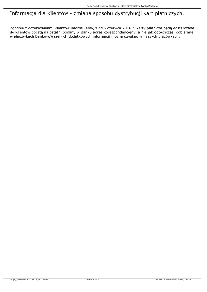 Bank Spółdzielczy w Raciborzu - Bank Spółdzielczy Twoim Bankiem Informacja dla Klientów - zmiana sposobu dystrybucji kart płatniczych. Zgodnie z oczekiwaniami Klientów informujemy,iż od 6 czerwca 2016 r. karty płatnicze będą dostarczane do Klientów pocztą na ostatni podany w Banku adres korespondencyjny, a nie jak dotychczas, odbierane w placówkach Banków.Wszelkich dodatkowych informacji można uzyskać w naszych placówkach. http://www.bsraciborz.pl/joom1011 Kreator PDF Utworzono 8 March, 2017, 04:29