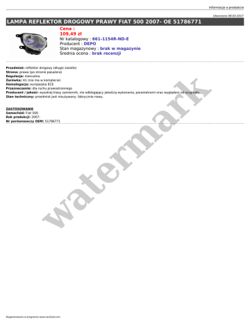 Informacje o produkcie Utworzono 08-03-2017 LAMPA REFLEKTOR DROGOWY PRAWY FIAT 500 2007- OE 51786771 Cena : 109,49 zł Nr katalogowy : 661-1154R-ND-E Producent : DEPO Stan magazynowy : brak w magazynie Średnia ocena : brak recenzji w at ZASTOSOWANIE Samochód: Fiat 500 Rok produkcji: 2007Nr porównawczy OEM: 51786771 er m ar k Przedmiot: reflektor drogowy (długie światło) Strona: prawa (po stronie pasażera) Regulacja: manualna Żarówka: H1 (nie ma w komplecie) Homologacja: europejska ECE Przeznaczenie: dla ruchu prawostronnego Producent / jakość: wysokiej klasy zamiennik, nie odbiegający jakością wykonania, parametrami oraz wyglądem od oryginału Stan techniczny: przedmiot jest nieużywany, fabrycznie nowy. Wygenerowano w programie www.oscGold.com