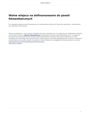 Gmina Dobrcz Wolne miejsca na dofinansowanie do paneli fotowoltaicznych Czy rozważasz założenie ogniw fotowoltaicznych lub kolektorów słonecznych? Jeżeli tak zapraszamy do zapoznania się z poniższymi informacjami. Można się zastanowić o czym mówimy. Wszędzie się słyszy o panelach ale co to właściwie jest. Wyjaśnienia pochodzą ze strony Eko Fachowcy. Ogniwa fotowoltaiczne to najmniejsze elementy paneli fotowoltaicznych. Ich zadaniem jest produkcja energii elektrycznej. Kupując panele fotowoltaiczne kupujemy zbiór ogniw połączonych ze sobą szeregowo i/lub równolegle, które tworzą moduły. Dzięki ogniwom nasz prąd produkowany jest za darmo, a produkcja energii elektrycznej w żaden sposób nie wpływa na nasze środowisko. Do pogłębienia wiedzy zapraszam na stronę http://ekofachowcy.pl/fotowoltaika/ogniwa-fotowoltaiczne. Informacja o naborze. 1