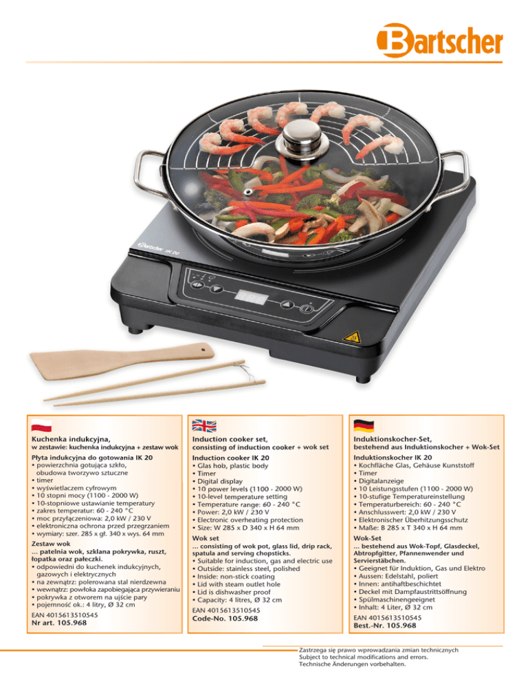 Kuchenka indukcyjna, Induction cooker set, Induktionskocher-Set, w zestawie: kuchenka indukcyjna + zestaw wok consisting of induction cooker + wok set bestehend aus Induktionskocher + Wok-Set Płyta indukcyjna do gotowania IK 20 • powierzchnia gotująca szkło, obudowa tworzywo sztuczne • timer • wyświetlaczem cyfrowym • 10 stopni mocy (1100 - 2000 W) • 10-stopniowe ustawianie temperatury • zakres temperatur: 60 - 240 °C • moc przyłączeniowa: 2,0 kW / 230 V • elektroniczna ochrona przed przegrzaniem • wymiary: szer. 285 x gł. 340 x wys. 64 mm Induction cooker IK 20 • Glas hob, plastic body • Timer • Digital display • 10 power levels (1100 - 2000 W) • 10-level temperature setting • Temperature range: 60 - 240 °C • Power: 2,0 kW / 230 V • Electronic overheating protection • Size: W 285 x D 340 x H 64 mm Induktionskocher IK 20 • Kochfläche Glas, Gehäuse Kunststoff • Timer • Digitalanzeige • 10 Leistungsstufen (1100 - 2000 W) • 10-stufige Temperatureinstellung • Temperaturbereich: 60 - 240 °C • Anschlusswert: 2,0 kW / 230 V • Elektronischer Überhitzungsschutz • Maße: B 285 x T 340 x H 64 mm Zestaw wok ... patelnia wok, szklana pokrywka, ruszt, łopatka oraz pałeczki. • odpowiedni do kuchenek indukcyjnych, gazowych i elektrycznych • na zewnątrz: polerowana stal nierdzewna • wewnątrz: powłoka zapobiegająca przywieraniu • pokrywka z otworem na ujście pary • pojemność ok.: 4 litry, Ø 32 cm Wok set Wok-Set ... consisting of wok pot, glass lid, drip rack, spatula and serving chopsticks. ... bestehend aus Wok-Topf, Glasdeckel, Abtropfgitter, Pfannenwender und Servierstäbchen. EAN 4015613510545 Nr art. 105.968 • Suitable for induction, gas and electric use • Outside: stainless steel, polished • Inside: non-stick coating • Lid with steam outlet hole • Lid is dishwasher proof • Capacity: 4 litres, Ø 32 cm EAN 4015613510545 • Geeignet für Induktion, Gas und Elektro • Aussen: Edelstahl, poliert • Innen: antihaftbeschichtet • Deckel mit Dampfaustrittsöffnung • Spülmaschinengeeignet • Inhalt: 4 Liter, Ø 32 cm Code-No. 105.968 EAN 4015613510545 Best.-Nr. 105.968 Zastrzega się prawo wprowadzania zmian technicznych Subject to technical modifications and errors. Technische Änderungen vorbehalten.