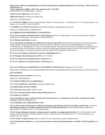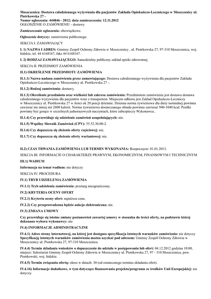 Moszczenica: Dostawa całodziennego wyżywienia dla pacjentów Zakładu Opiekuńczo-Leczniczego w Moszczenicy ul. Piotrkowska 27 Numer ogłoszenia: 444846 - 2012; data zamieszczenia: 12.11.2012 OGŁOSZENIE O ZAMÓWIENIU - dostawy Zamieszczanie ogłoszenia: obowiązkowe. Ogłoszenie dotyczy: zamówienia publicznego. SEKCJA I: ZAMAWIAJĄCY I. 1) NAZWA I ADRES: Gminny Zespół Ochrony Zdrowia w Moszczenicy , ul. Piotrkowska 27, 97-310 Moszczenica, woj. łódzkie, tel. 44 6168167, faks 44 6168167. I. 2) RODZAJ ZAMAWIAJĄCEGO: Samodzielny publiczny zakład opieki zdrowotnej. SEKCJA II: PRZEDMIOT ZAMÓWIENIA II.1) OKREŚLENIE PRZEDMIOTU ZAMÓWIENIA II.1.1) Nazwa nadana zamówieniu przez zamawiającego: Dostawa całodziennego wyżywienia dla pacjentów Zakładu Opiekuńczo-Leczniczego w Moszczenicy ul. Piotrkowska 27 -. II.1.2) Rodzaj zamówienia: dostawy. II.1.3) Określenie przedmiotu oraz wielkości lub zakresu zamówienia: Przedmiotem zamówienia jest dostawa dostawa całodziennego wyżywienia dla pacjentów wraz z transportem. Miejscem odbioru jest Zakład Opiekuńczo-Leczniczy w Moszczenicy ul. Piotrkowska 27 w ilości ok 20 porcji dziennie. Dzienna norma żywieniowa dla diety normalnej powinna zawierać nie mniej niż 2600 kalorii. Norma żywieniowa dostarczanego obiadu powinna zawierać 940-1040 kcal. Posiłki powinny być gorące w szczelnych jednorazowych naczyniach, które zabezpieczy Wykonawca.. II.1.4) Czy przewiduje się udzielenie zamówień uzupełniających: nie. II.1.5) Wspólny Słownik Zamówień (CPV): 55.52.30.00-2. II.1.6) Czy dopuszcza się złożenie oferty częściowej: nie. II.1.7) Czy dopuszcza się złożenie oferty wariantowej: nie. II.2) CZAS TRWANIA ZAMÓWIENIA LUB TERMIN WYKONANIA: Rozpoczęcie: 01.01.2013. SEKCJA III: INFORMACJE O CHARAKTERZE PRAWNYM, EKONOMICZNYM, FINANSOWYM I TECHNICZNYM III.1) WADIUM Informacja na temat wadium: nie dotyczy SEKCJA IV: PROCEDURA IV.1) TRYB UDZIELENIA ZAMÓWIENIA IV.1.1) Tryb udzielenia zamówienia: przetarg nieograniczony. IV.2) KRYTERIA OCENY OFERT IV.2.1) Kryteria oceny ofert: najniższa cena. IV.2.2) Czy przeprowadzona będzie aukcja elektroniczna: nie. IV.3) ZMIANA UMOWY Czy przewiduje się istotne zmiany postanowień zawartej umowy w stosunku do treści oferty, na podstawie której dokonano wyboru wykonawcy: nie IV.4) INFORMACJE ADMINISTRACYJNE IV.4.1) Adres strony internetowej, na której jest dostępna specyfikacja istotnych warunków zamówienia: nie dotyczy Specyfikację istotnych warunków zamówienia można uzyskać pod adresem: Gminny Zespół Ochrony Zdrowia w Moszczenicy ul. Piotrkowska 27, 97-310 Moszczenica. IV.4.4) Termin składania wniosków o dopuszczenie do udziału w postępowaniu lub ofert: 04.12.2012 godzina 10:00, miejsce: Sekretariat Gminny Zespół Ochrony Zdrowia w Moszczenicy ul. Piotrkowska 27, 97 - 310 Moszczenica, pow. Piotrkowski, woj. łódzkie. IV.4.5) Termin związania ofertą: okres w dniach: 30 (od ostatecznego terminu składania ofert). IV.4.16) Informacje dodatkowe, w tym dotyczące finansowania projektu/programu ze środków Unii Europejskiej: nie dotyczy.