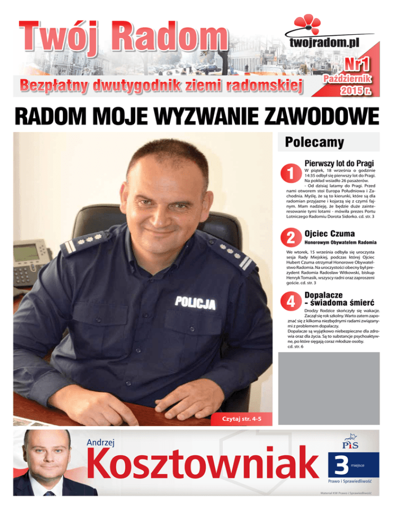 Twój Radom Nr1 Bezpłatny dwutygodnik ziemi radomskiej Październik 2015 r. RADOM MOJE WYZWANIE ZAWODOWE Polecamy 1 Pierwszy lot do Pragi W piątek, 18 września o godzinie 14:35 odbył się pierwszy lot do Pragi. Na pokład wsiadło 26 pasażerów. - Od dzisiaj latamy do Pragi. Przed nami otworem stoi Europa Południowa i Zachodnia. Myślę, że są to kierunki, które są dla radomian przyjazne i kojarzą się z czymś fajnym. Mam nadzieję, że będzie duże zainteresowanie tymi lotami - mówiła prezes Portu Lotniczego Radomiu Dorota Sidorko. cd. str. 3 2 Ojciec Czuma Honorowym Obywatelem Radomia We wtorek, 15 września odbyła się uroczysta sesja Rady Miejskiej, podczas której Ojciec Hubert Czuma otrzymał Honorowe Obywatelstwo Radomia. Na uroczystości obecny był prezydent Radomia Radosław Witkowski, biskup Henryk Tomasik, wszyscy radni oraz zaproszeni goście. cd. str. 3 4 Dopalacze - świadoma śmierć Drodzy Rodzice skończyły się wakacje. Zaczął się rok szkolny. Warto zatem zapoznać się z kilkoma niezbędnymi radami związanymi z problemem dopalaczy. Dopalacze są wyjątkowo niebezpieczne dla zdrowia oraz dla życia. Są to substancje psychoaktywne, po które sięgają coraz młodsze osoby. cd. str. 6 Czytaj str. 4-5 Kosztowniak 3 Andrzej miejsce Materiał KW Prawo i Sprawiedliwość www.twojradom.pl 2 Radom otrzyma 30 mln zł Umowa konsorcjum Z funduszy unijnych trafi do Radomia dodatkowe 30 milionów złotych. Jest to zwrot części kosztów, które miasto poniosło na budowę południowej obwodnicy. Wicemarszałek Województwa Mazowieckiego Leszek Ruszczyk wręczył prezydentowi Radosławowi Witkowskiemu symboliczny banknot o nominale 30 000 000 złotych. – To już drugie dofinansowanie budowy obwodnicy, jakiego samorząd Mazowsza udzielił miastu. Za pierwszym razem także dołożyliśmy 30 milionów złotych. Były pieniądze pochodzące głównie z naszego budżetu. Teraz zwiększamy udział funduszy unijnych w całej inwestycji. Gratuluję mieszkańcom. Jestem przekonany, że prezydent wykorzysta te pieniądze dla dobra mieszkańców Radomia – powiedział marszałek. Do Radomia trafią oszczędności uzyskane przy realizacji niektórych zadań w perspektywie finansowej 2007-2013. – To dla nas miła chwila i finał wielomiesięcznych starań o zwiększenie dofinansowania budowy obwodnicy południowej. Mogę zadeklarować, że te pieniądze zostaną przeznaczone na realizację najważniejszych projektów, jakie stoją przed nami w 2016 roku. Będziemy je chcieli wykorzystać na budowę hali sportowej, stadionu oraz trasy N-S – zapowiedział prezydent Radosław Witkowski. – Od dziś może się pan uważać za współautora tych projektów – dodał i podziękował marszałkowi Ruszczykowi za wsparcie. MA do programu „Gryf” Uczniowie powrócili ze stażu w Niemczech Po dwutygodniowym stażu zawodowym w Niemczech, 18 uczniów technikum żywienia i usług gastronomicznych wróciło do domu. Staż odbył się w ramach unijnego programu Erasmus Plus. Obecnie realizowany projekt nosi tytuł: „Zagraniczny staż zawodowy szansą dla absolwentów szkoły agrotechnicznej na sukces na lokalnym rynku pracy”. Staż odbył się w dniach od 30 sierpnia do 13 września 2015 roku, w niemieckim ośrodku szkolenia zawodowego w miejscowości Paulinenaue - położonej w Branderburgii, niedaleko Berlina. Uczniowie podczas stażu w Niemczech doskonalili swoje umiejętności zawodowe związane z obsługą nowoczesnych maszyn i urządzeń gastronomicznych. Pobyt uczniów był bardzo urozmaicony. BEZPŁATNY DWUTYGODNIK ZIEMI RADOMSKIEJ Radom, ul. Andrzeja Struga 60 lok. 204 48 370 36 74, [email protected] reklama: 795 900 953, 690 477 169 [email protected] Oprócz wykładów i ćwiczeń praktycznych, zostało zorganizowanych wiele wycieczek zawodowych i krajoznawczych. Odbycie stażu umożliwiło uczniom poznanie nowoczesnych technologii stosowanych w gastronomii, przetwórstwie spożywczym i produkcji żywności. Cały projekt w całości został sfinansowany ze środków UE. MA We wtorek, 22 września w siedzibie Polskiej Grupy Zbrojeniowej w Radomiu została podpisana umowa konsorcjum w ramach systemu bezzałogowych statków powietrznych średniego zasięgu o kryptonimie „Gryf”. W skład konsorcjum weszło 5 firm: lider - PGZ S.A., Wojskowe Zakłady Lotnicze Nr 2 S.A., PIT-Radwar S.A., MESKO S.A. oraz Wojskowe Zakłady Elektroniczne S.A. W ramach podpisanego porozumienia, spółki pod przewodnictwem PGZ złożą wspólną ofertę w zakresie produkcji, rozwoju, modernizacji oraz utrzymania systemu bezzałogowych statków powietrznych. Podstawą do jego opracowania będzie system Hermes 450, produkowany przez firmę Elbit Systems Ltd. – jednego z wiodących producentów SBSP na świecie. - Jest to bardzo ważny program dla naszych spółek. Umożliwia on transfer technologii, pewien skok technologiczny. Systemy bezzałogowe to jedna z domen, na które postawiliśmy - mówił prezes zarządu Polskiej Grupy Zbrojeniowej Wojciech Dąbrowski. W ubiegłym tygodniu PGZ S.A. podpisała z izraelską firmą umowę o współpracy, której celem jest dostarczenie polskiej armii Systemu Bezzałogowych Statków Powietrznych (SBSP) kategorii Taktyczne Średniego Zasięgu. - Dzisiejsze podpisanie umowy jest konsekwencją tego wydarzenia. W ramach tego porozumienia Polska Grupa Zbrojeniowa i spółki, które do niego należą pozyskają pełny transfer technologii, który zabezpieczy zarówno integracje polskich systemów, integracje uzbrojenia oraz zbudowanie labolatorium - przekonuje Dariusz Sokólski, członek Zarządu PGZ S.A. Program „Gryf” zakłada dostarczenie dronów taktycznych średniego zasięgu dla polskiego wojska. Zgodnie z wymogami MON, system ten ma posiadać możliwości w zakresie wykorzystania uzbrojenia. Przypominamy, że 23 lipca 2015 roku Polska Grupa Zbrojeniowa podpisała z amerykańską firmą Raytheon list intencyjny o współpracy w zakresie reali