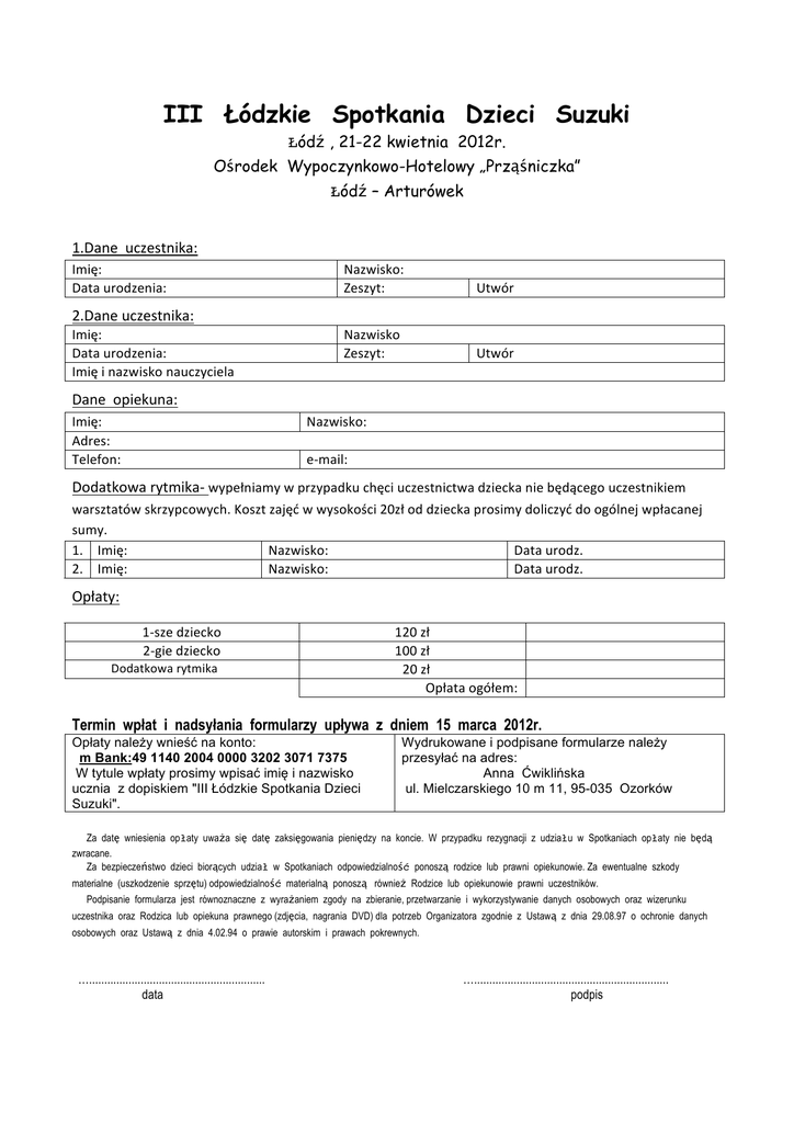 III Łódzkie Spotkania Dzieci Suzuki !ódź , 21-22 kwietnia 2012r. Ośrodek Wypoczynkowo-Hotelowy „Prząśniczka” !ódź – Arturówek 1.Dane uczestnika: Imię: Data urodzenia: Nazwisko: Zeszyt: Utwór 2.Dane uczestnika: Imię: Data urodzenia: Imię i nazwisko nauczyciela Nazwisko Zeszyt: Utwór Dane opiekuna: Imię: Adres: Telefon: Nazwisko: e-‐mail: Dodatkowa rytmika-‐ wypełniamy w przypadku chęci uczestnictwa dziecka nie będącego uczestnikiem warsztatów skrzypcowych. Koszt zajęć w wysokości 20zł od dziecka prosimy doliczyć do ogólnej wpłacanej sumy. 1. Imię: Nazwisko: Data urodz. 2. Imię: Nazwisko: Data urodz. Opłaty: 1-‐sze dziecko 2-‐gie dziecko Dodatkowa rytmika 120 zł 100 zł 20 zł Opłata ogółem: Termin wpłat i nadsyłania formularzy upływa z dniem 15 marca 2012r. Opłaty należy wnieść na konto: m Bank:49 1140 2004 0000 3202 3071 7375 W tytule wpłaty prosimy wpisać imię i nazwisko ucznia z dopiskiem "III Łódzkie Spotkania Dzieci Suzuki". Wydrukowane i podpisane formularze należy przesyłać na adres: Anna Ćwiklińska ul. Mielczarskiego 10 m 11, 95-035 Ozorków Za datę wniesienia op"aty uważa się datę zaksięgowania pieniędzy na koncie. W przypadku rezygnacji z udzia"u w Spotkaniach op"aty nie będą zwracane. Za bezpieczeństwo dzieci biorących udzia" w Spotkaniach odpowiedzialnoś# ponoszą rodzice lub prawni opiekunowie. Za ewentualne szkody materialne (uszkodzenie sprzętu) odpowiedzialnoś# materialną ponoszą również Rodzice lub opiekunowie prawni uczestników. Podpisanie formularza jest równoznaczne z wyrażaniem zgody na zbieranie, przetwarzanie i wykorzystywanie danych osobowych oraz wizerunku uczestnika oraz Rodzica lub opiekuna prawnego (zdjęcia, nagrania DVD) dla potrzeb Organizatora zgodnie z Ustawą z dnia 29.08.97 o ochronie danych osobowych oraz Ustawą z dnia 4.02.94 o prawie autorskim i prawach pokrewnych. ….......................................................... data …................................................................ podpis
