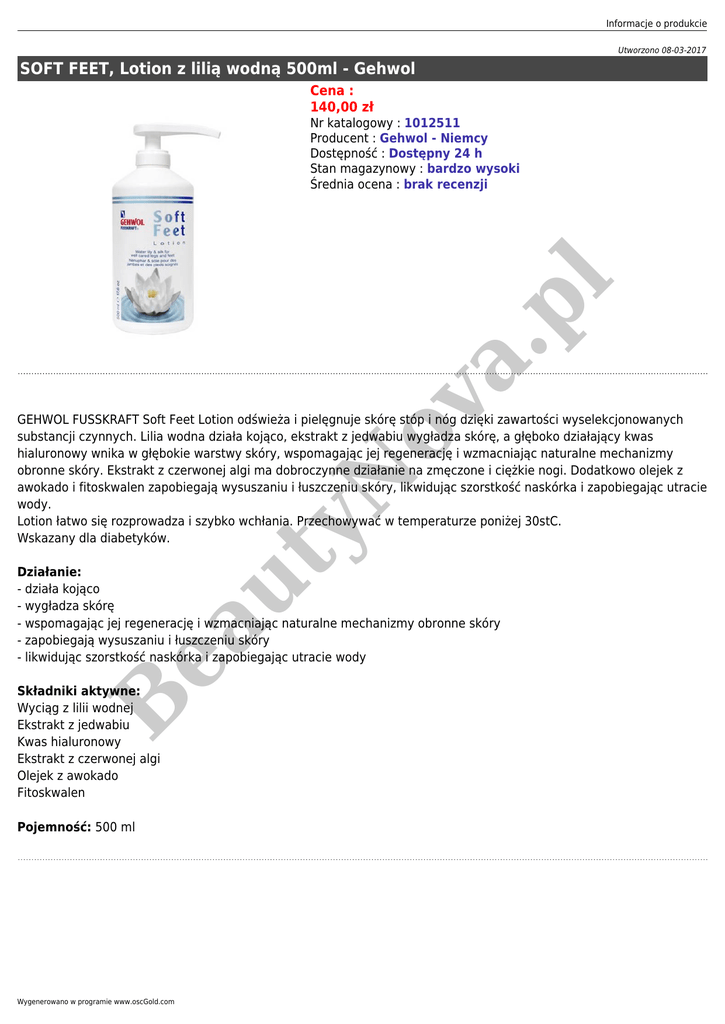 Informacje o produkcie Utworzono 08-03-2017 SOFT FEET, Lotion z lilią wodną 500ml - Gehwol Cena : 140,00 zł ov a. pl Nr katalogowy : 1012511 Producent : Gehwol - Niemcy Dostępność : Dostępny 24 h Stan magazynowy : bardzo wysoki Średnia ocena : brak recenzji ut yN GEHWOL FUSSKRAFT Soft Feet Lotion odświeża i pielęgnuje skórę stóp i nóg dzięki zawartości wyselekcjonowanych substancji czynnych. Lilia wodna działa kojąco, ekstrakt z jedwabiu wygładza skórę, a głęboko działający kwas hialuronowy wnika w głębokie warstwy skóry, wspomagając jej regenerację i wzmacniając naturalne mechanizmy obronne skóry. Ekstrakt z czerwonej algi ma dobroczynne działanie na zmęczone i ciężkie nogi. Dodatkowo olejek z awokado i fitoskwalen zapobiegają wysuszaniu i łuszczeniu skóry, likwidując szorstkość naskórka i zapobiegając utracie wody. Lotion łatwo się rozprowadza i szybko wchłania. Przechowywać w temperaturze poniżej 30stC. Wskazany dla diabetyków. ea Działanie: - działa kojąco - wygładza skórę - wspomagając jej regenerację i wzmacniając naturalne mechanizmy obronne skóry - zapobiegają wysuszaniu i łuszczeniu skóry - likwidując szorstkość naskórka i zapobiegając utracie wody B Składniki aktywne: Wyciąg z lilii wodnej Ekstrakt z jedwabiu Kwas hialuronowy Ekstrakt z czerwonej algi Olejek z awokado Fitoskwalen Pojemność: 500 ml Wygenerowano w programie www.oscGold.com
