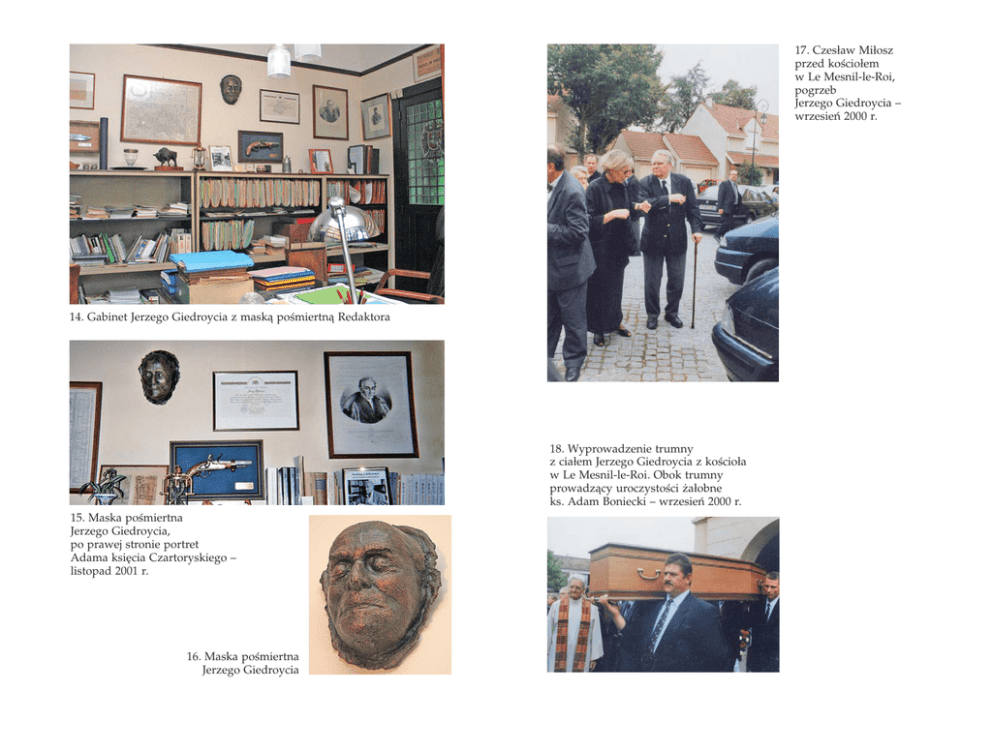 17. Czesław Miłosz przed kościołem w Le Mesnil−le−Roi, pogrzeb Jerzego Giedroycia – wrzesień 2000 r. 14. Gabinet Jerzego Giedroycia z maską pośmiertną Redaktora 18. Wyprowadzenie trumny z ciałem Jerzego Giedroycia z kościoła w Le Mesnil−le−Roi. Obok trumny prowadzący uroczystości żałobne ks. Adam Boniecki – wrzesień 2000 r. 15. Maska pośmiertna Jerzego Giedroycia, po prawej stronie portret Adama księcia Czartoryskiego – listopad 2001 r. 16. Maska pośmiertna Jerzego Giedroycia 19. Alejka cmentarna, przy której znajduje się grób Jerzego Giedroycia w Le Mesnil−le−Roi – listopad 2001 r. 20. Grób Jerzego Giedroycia na cmentarzu w Le Mesnil−le−Roi – listopad 2001 r.