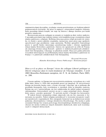 356 RECENZJE znajomościa˛ danej dyscypliny, ryzykujac ˛ czasem powtórzeniem czy brakiem jedności proponowanych rozwiazań. ˛ Ale przez to napie˛cie i różnorodność punktów widzenia, które prezentuje lektura ksiażki, ˛ nie staje sie˛ liniowa i dlatego możliwe jest każde przejście tematyczne. Recenzowana pozycja zasługuje na uznanie ze wzgle˛du na duże walory naukowe. U poczatku ˛ powstania tego traktatu istnieje wola kompleksowego zrozumienia relacji mie˛dzy państwem a religiami. Refleksja dotyczaca ˛ prawa religii prowadzi do wniosku, że chodzi o prawo głe˛boko oryginalne, naznaczone naraz przez jego zgodność, specyficzność jego przedmiotu i jego autonomie˛. Wybitni specjaliści francuskiego prawa w sposób bardzo interesujacy ˛ przedstawiaja˛ trudne i złożone zagadnienie relacji mie˛dzy Kościołem a państwem. Autorzy nie ograniczyli sie˛ tylko do Francji, ale omawiaja˛ również relacje Kościół – państwo w niektórych państwach członkowskich Unii Europejskiej, wskazujac ˛ na pluralizm modeli. Praca jest godna polecenia wszystkim interesujacym ˛ sie˛ problematyka˛ relacji mie˛dzy Kościołem a państwem we Francji i w państwach członkowskich Unii Europejskiej. Krzysztof Orzeszyna (Katedra Kościelnego Prawa Publicznego i Konstytucyjnego) Dieu a-t-il sa place en Europe? Actes du colloque Liberté politique et liberté religieuse dans le traité fondateur de l’Europe réunifiée. 3 avril 2003 Bruxelles-Parlement européen, éd. F. X. de Guibert, Paris 2003, ss. 288. Czasem sadzimy, ˛ że Europa jest rzeczywistościa˛ niedawna, ˛ wywodzac ˛ a˛ sie˛ z woli kilku ludzi, którzy w 1950 roku uruchomili proces jej integracji. W rzeczywistości Europa ma korzenie bardzo stare, a liczne zwyczaje i obyczaje, jak to pokazuje dla przykładu ikonografia, były wcześniejsze w narodach, które ja˛ aktualnie stanowia. ˛ Europa ma coś z uniwersalizmu, nie jest redukowalna do jakiejś jednej tożsamości substancjalnej. Uniwersalność zawiera sie˛ już w samej etymologii słowa „Europa”, które znaczy „szerokie spojrzenie”. To pozwala myśleć o Europie bez horyzontów. W trakcie historii europejskiej religie odgrywały role˛ nie bez znaczenia w formowaniu sie˛ narodów. Faktor religijny pośredniczył w tworzeniu tożsamości wspólnot narodowych i regionalnych. Etos europejski formował sie˛ na kulturowym terenie judaizmu, chrześcijaństwa i różnego dziedzictwa filozoficznego. Nie można w pełni zrozumieć Europy bez wzie˛cia pod uwage˛ chrześcijańskiego dziedzictwa religijnego, chociaż nie można wykluczyć innych elementów duchowych, także tych wcześniejszych w religiach deistycznych. ROCZNIKI NAUK PRAWNYCH 15:2005 NR 2 RECENZJE 357 Jednak mówić o tożsamości cywilizacyjnej Europy nie jest łatwo, ponieważ każda definicja tożsamości europejskich nie odda w pełni obfitości różnorodnych tożsamości narodowych i regionalnych, religijnych i filozoficznych, je˛zykowych i kulturowych, które stanowiły w przeszłości i dzisiaj wciaż ˛ jeszcze stanowia˛ bogactwo Europy. Ta wielość i różnorodność kultur jest w sercu tożsamości cywilizacyjnej Europy. Stanowi ja˛ wielość i różnorodność kultur w ciagłych ˛ napie˛ciach i dialogu, przechodzaca ˛ przez twierdzenia i pytania, w ciagłym ˛ rozpadzie i składaniu. Europa tworzy sie˛ z syntezy filozofii greckiej, prawa rzymskiego, kultury germańskiej, celtyckiej i słowiańskiej oraz dzie˛ki przylgnie˛ciu narodów do Ewangelii Chrystusa. W ostatnich latach historie˛ Europy naznaczyły dwa wielkie wydarzenia geopolityczne: utworzenie Unii Europejskiej wzmacniajacej ˛ integracje˛ Europy Zachodniej i upadek muru berlińskiego, kończacy ˛ podział Europy na dwa przeciwstawne ideologicznie obozy. Wydarzenia te nie moga˛ pozostawać bez wpływów religijnych. Wyobrażenia europejskie maja˛ wymiary religijne i sa˛ obecne w zagospodarowywaniu przestrzeni suwerenności europejskiej, gdzie jednostki sa˛ zapraszane do identyfikowania sie˛ szerzej w europejskiej przestrzeni geopolitycznej, poprzez sie˛ganie do tożsamości wspólnotowych podtrzymywanych przez różnice je˛zykowe, religijne czy kulturowe. Dzisiaj Unia Europejska pyta o swój kształt instytucjonalny: jak zapewnić swoja˛ legitymizacje˛ demokratyczna? ˛ Jak organizować podział kompetencji mie˛dzy Unie˛ a państwa członkowskie? Wykłady wygłoszone podczas Konferencji: Bóg i Europa, dnia 3 kwietnia 2003 roku, przypominaja˛ idee założycieli odnotowane przez historie˛ i prawo. Publikacja składa sie˛, oprócz wprowadzenia, manifestu brukselskiego i aneksów, z pie˛ciu cze˛ści. W cze˛ści 1: Europa trzeciego tysiaclecia, ˛ mie˛dzy wolnościa˛ i tożsamościa, ˛ wystapienia ˛ koncentruja˛ sie˛ wokół zagadnień: czy możliwa jest ignorancja świeckiego dziedzictwa Europejczyków, tożsamości europejskiej, wymiaru społecznego i instytucjonalnego wolności religijnych? W cze˛ści 2: Europa i współczesność: wspólnota wartości – prelegenci rozważaja˛ tematy: Młodzi Europejczycy i wartości Unii Europejskiej; rodzina i państwo; prawa rodziny w Europie; miejsce kobiety; moralność i polityka w Europie. Cze˛ść 3: Europa rzeczywista, Europa historyczna: wspólnota kultur, obejmuje naste˛pujace ˛ grupy tematyczne: region w Europie, wspólnota ludzka i historyczna, wolność i chrześcijaństwo, dziedzictwo chrześcijańskie Europy, fundament kultury wolności, solidarności i pokoju. W cze˛ści 4: Europa praw człowieka, wspólnota polityczna, podje˛to naste˛pujace ˛ zagadnienia: osoba i instytucje: zasada pomocniczości; prawo i polityka w Europie; historia, która tworzy przyszłość. W ostatniej cze˛ści 5: Europa i Bóg: wolność religijna i wolność polityczna w traktacie założycielskim – rozważania dotycza˛ naste˛pujacych ˛ kwestii: Bóg w konstytucjach europejskich; status uznania kościołów; status konsultacyjny ko