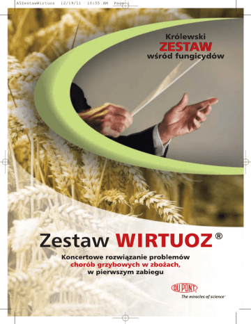 A5ZestawWirtuoz 12/19/11 10:55 AM Page 1 1 A5ZestawWirtuoz 12/19/11 10:55 AM Page 2 Niezwykle skuteczna kompozycja substancji aktywnych Oddajemy w Paƒstwa r´ce jedyny, niepowtarzalny zestaw do zwalczania chorób grzybowych w zbo˝ach. Zestaw WIRTUOZ® to kompozycja dwóch Êrodków (Talius® 200 EC i Zamir® 400 EW) w jednym opakowaniu zbiorczym. Razem zawierajà one trzy najbardziej po˝àdane substancje aktywne w pierwszym zabiegu: prochloraz, tebukonazol i proquinazid. Ka˝da z nich nale˝y do ró˝nych grup chemicznych (prochloraz – imidazole, tebukonazol – triazole, proquinazid – quinozoliny). Dzi´ki zastosowaniu Êrodków z zestawu w odpowiednich proporcjach dawek nast´puje po∏àczenie w∏aÊciwoÊci zapobiegawczych proquinazidu z dzia∏aniem wyniszczajàcym prochlorazu i tebukonazolu. Dodatkowo taka mieszanina oznacza wielokierunkowy sposób dzia∏ania (proquinazid – kontaktowy, prochloraz i tebukonazol – wg∏´bny i systemiczny). Zestaw WIRTUOZ® to najbardziej kompletne rozwiàzanie pod wzgl´dem sk∏adu, zawartoÊci substancji aktywnych oraz spektrum zwalczanych chorób. Zestaw jest dost´pny w dwóch rodzajach opakowaƒ zbiorczych: na 5 ha, zawierajàce: Talius® 200 EC (1 l) i Zamir® 400 EW (5 l) na 1 ha, zawierajàce: Talius® 200 EC (0,25 l) i Zamir® 400 EW (1 l) 2 A5ZestawWirtuoz 12/19/11 10:55 AM Page 3 Charakterystyka Zakres stosowania, terminy i dawki 1. Pszenica ozima • brunatna plamistoÊç liÊci, fuzaryjna zgorzel podstawy êdêb∏a, ∏amliwoÊç êdêb∏a, màczniak prawdziwy, rdza brunatna, septorioza paskowana liÊci, septorioza plew. W przypadku zastosowania Zestawu WIRTUOZ®, rekomendujemy nast´pujàcà kompozycj´ dawek: Talius® 0,2–0,25 l/ha + Zamir® 400 EW 1 l/ha. Zestaw stosowaç zapobiegawczo lub z chwilà wystàpienia pierwszych objawów chorób: od poczàtku krzewienia do koƒca fazy k∏oszenia. Zalecana iloÊç wody: 200–400 l/ha. Zalecan opryskiwanie: drobnokropliste. 2. Pszen˝yto ozime • brunatna plamistoÊç liÊci, fuzarioza k∏osów, màczniak prawdziwy, rdza brunatna, septorioza paskowana liÊci, septorioza plew. W przypadku zastosowania Zestawu WIRTUOZ®, rekomendujemy nast´pujàcà kompozycj´ dawek: Talius® 0,2–0,25 l/ha + Zamir® 400 EW 1 l/ha. Zestaw stosowaç zapobiegawczo lub z chwilà wystàpienia pierwszych objawów chorób: od poczàtku krzewienia do koƒca fazy k∏oszenia. Zalecana iloÊç wody: 200–400 l/ha. Zalecan opryskiwanie: drobnokropliste. 3. J´czmieƒ jary • màczniak prawdziwy, plamistoÊç siatkowa liÊci, rdza kar∏owa, rynchosporioza. W przypadku zastosowania Zestawu WIRTUOZ®, rekomendujemy nast´pujàcà kompozycj´ dawek: Talius® 0,2–0,25 l/ha + Zamir® 400 EW 1 l/ha. Zestaw stosowaç zapobiegawczo lub z chwilà wystàpienia pierwszych objawów chorób: od poczàtku krzewienia do koƒca fazy k∏oszenia. Zalecana iloÊç wody: 200–400 l/ha. Zalecan opryskiwanie: drobnokropliste. 3 A5ZestawWirtuoz 12/19/11 10:55 AM Page 4 Bardzo szerokie spektrum zwalczanych chorób Zestaw WIRTUOZ® zwalcza wszystkie istotne choroby zbó˝ wyst´pujàce w Polsce. fuza a fuz torioza liÊc i sep go a plamistoÊç atn li un Zestaw WIRTUOZ® chosporioza r yn i Êc br k prawdz znia iw àc y a b∏a liÊciu fla m b∏ ê êd na za podstawy êd oÊç ê liw ym w rio y ∏ am rzel podsta zgo w ry j na ptorioza plew se a rdz brunatna a istoÊç siatko am w pl 4 A5ZestawWirtuoz 12/19/11 10:55 AM Page 5 Umiejscowienie w programach ochrony pszenicy ozimej przed chorobami grzybowymi Pszenica ozima Bardzo istotnym elementem ca∏ej technologii zwalczania chorób jest pierwszy zabieg. Jego niewykonanie albo spóênienie wp∏ywa bardzo niekorzystnie na uzyskiwany póêniej plon. Strat powstajàcych w tym okresie ju˝ nie mo˝na nadrobiç. Rekomendujemy zastosowanie Êrodków z Zestawu WIRTUOZ® do pierwszego zabiegu tzw. T1 (faza rozwojowa BBCH 29–31) w technologiach dwu- lub trzyzabiegowych. Przyk∏adowa technologia zwalczania chorób grzybowych w pszenicy ozimej z udzia∏em Zestawu WIRTUOZ®. Technologia Zestaw WIRTUOZ®–REVELLER® T2: Reveller® 280 SC 1l/ha T1: Zestaw WIRTUOZ® Talius® 200 EC 0,2–0,25 l/ha + Zamir® 400 EW 1 l/ha A5ZestawWirtuoz 12/19/11 10:55 AM Page 6 Wysokie plony i parametry jakoÊciowe pszenicy ozimej Istotà produkcji pszenicy ozimej i innych zbó˝ jest w efekcie finalnym uzyskanie wysokich plonów spe∏niajàcych parametry skupowe. Poni˝ej przedstawiamy przyk∏ady doÊwiadczeƒ produkcyjnych (lata 2009–2010), w których zastosowano program Wirtuoz®–Reveller® i jego wp∏yw na zwy˝k´ plonów, a tak˝e na popraw´ parametrów jakoÊciowych pszenicy ozimej. Wp∏yw zabiegu Êrodkiem Wirtuoz® w terminie T1 na finalny plon Zabieg T1 to podstawa w budowaniu zwy˝ek plonu 14 12 Wirtuoz 10 8 6 standard 4 2 0 KUJAWY WOJ. OPOLESKIE G.ÂLÑSK D.ÂLÑSK Technologia Wirtuoz®–Reveller® Wyrównanie (%) w odmianie Bogatka, lata 2009–2010 100 98 2009 96 94 92 90 88 86 2010 84 82 80 KUJAWY WOJ. OPOLESKIE G.ÂLÑSK D.ÂLÑSK POMORZE Plonowanie ró˝nych odmian pszenicy oz. w ZD Paw∏owice (Wielkopolska) w 2010 r. (q/ha) 100 90 80 70 60 50 40 30 20 6 10 0 Bogatka Ostroga Muszelka Galvano Julius Kris A5ZestawWirtuoz 12/19/11 10:55 AM Page 7 KorzyÊci p∏ynàce z jego zastosowania Najbardziej kompletny zestaw Êrodków pod wzgl´dem sk∏adu oraz koncentracji substancji aktywnych, dzi´ki czemu zwalcza wszystkie najwa˝niejsze choroby w pszenicy ozimej, pszen˝ycie ozimym i j´czmieniu jarym. Doskona∏y w zwalczaniu kompleksu chorób podstawy êdêb∏a, dzi´ki czemu stosowany w pierwszym zabiegu w pszenicy ozimej daje dobre podwaliny do budowania wysokich plonów. Kontrola fuzarioz ju˝ od najwczeÊniejszych faz rozwojowych pszenicy ozimej, dzi´ki czemu po jego zastosowaniu uzyskujemy wysokie parametry jakoÊciowe zbieranego ziarna. Elastyczny w stosowaniu, dzi´ki czemu wyÊmienicie nadaje si´ do pierwszych zabiegów w ka˝dej technologii zwalczania chorób