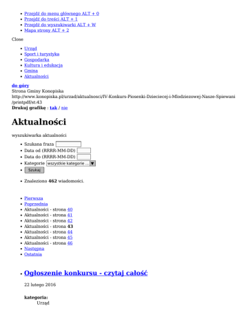 Przejdź do menu głównego ALT + 0 Przejdź do treści ALT + 1 Przejdź do wyszukiwarki ALT + W Mapa strony ALT + 2 Close Urząd Sport i turystyka Gospodarka Kultura i edukacja Gmina Aktualności do góry Strona Gminy Konopiska http://www.konopiska.pl/urzad/aktualnosci/IV-Konkurs-Piosenki-Dzieciecej-i-Mlodziezowej-Nasze-Spiewani /printpdf/st:43 Drukuj grafikę : tak / nie Aktualności wyszukiwarka aktualności Szukana fraza Data od (RRRR-MM-DD) Data do (RRRR-MM-DD) Kategorie wszystkie kategorie ... ▼ Szukaj Znaleziono 462 wiadomości. Pierwsza Poprzednia Aktualności - strona 40 Aktualności - strona 41 Aktualności - strona 42 Aktualności - strona 43 Aktualności - strona 44 Aktualności - strona 45 Aktualności - strona 46 Następna Ostatnia Ogłoszenie konkursu - czytaj całość 22 lutego 2016 kategoria: Urząd Wójt Gminy Konopiska ogłasza otwarty konkurs ofert na realizację zadań w dziedzinie kultury fizycznej i sportu w 2016 roku. Ogłoszenie konkursu Ogłoszenie konkursu - czytaj całość Zmiany w kursach PKS na terenie Gminy Konopiska od dnia 1.04.2016 roku. - czytaj całość 19 lutego 2016 kategoria: Urząd Informujemy,że od dnia 1 kwietnia 2016 r. następują zmiany w kursowaniu autobusów PKS Zmiany w kursach PKS na terenie Gminy Konopiska od Zmiany w kursach PKS na terenie Gminy Konopiska od dnia 1.04.2016 roku. - czytaj całość Konsultacje społeczne na temat powstającej mapy zagrożeń czytaj całość 18 lutego 2016 kategoria: Urząd W związku z prowadzonymi w skali całego kraju konsultacjami społecznymi na temat powstającej mapy zagrożeń, w imieniu Komendanta Komisariatu Policji w Blachowni serdecznie zapraszamy mieszkańców Gminy Konopiska na spotkanie, które odbędzie się 26 lutego 2016 roku w Urzędzie Gminy Konopiska – Sala konferencyjna nr 14 o godzinie 16.00. Konsultacje społeczne na temat powstającej mapy Konsultacje społeczne na temat powstającej mapy zagrożeń - czytaj całość Główny Urząd Statystyczny zwraca się prośbą o udział w badaniach statystyki publicznej - czytaj całość 09 lutego 2016 kategoria: Urząd Przychylność wobec ankieterów statystycznych, czas im poświęcony, zapewnią wysoką jakość uzyskanych danych statystycznych. Ze statystyki publicznej od wielu lat korzystają nie tylko organy państwa, przedsiębiorcy, studenci i uczniowie, ale też ogół społeczeństwa. Każdy z nas poszukuje informacji o swoim kraju, województwie, regionie, czy miejscowości. Główny Urząd Statystyczny zwraca się prośbą Główny Urząd Statystyczny zwraca się prośbą o udział w badaniach statystyki publicznej - czytaj całość Zawiadomienie - czytaj całość 09 lutego 2016 kategoria: Urząd Na podstawie art. 20 ust. 1 ustawy o samorządzie gminnym z dnia 8 marca 1990 r. (Dz. U. z 2015 poz. 1515) zawiadamiam, że dnia: 16 lutego 2016 r. (wtorek) o godz. 12.00 w sali konferencyjnej Urzędu Gminy w Konopiskach odbędzie się: XIX sesja Rady Gminy Konopiska Zawiadomienie Zawiadomienie - czytaj całość Zwrot podatku akcyzowego zawartego w cenie oleju napędowego wykorzystywanego do produkcji rolnej w 2016 roku - czytaj całość 05 lutego 2016 kategoria: Urząd Uprzejmie informujemy, że od 1 lutego 2016r. do 29 lutego 2016 r. w Urzędzie Gminy w Konopiskach przyjmowane będą wnioski o zwrot podatku akcyzowego zawartego w cenie oleju napędowego wykorzystywanego do produkcji rolnej w pierwszym terminie. Zwrot podatku akcyzowego zawartego w cenie oleju n Zwrot podatku akcyzowego zawartego w cenie oleju napędowego wykorzystywanego do produkcji rolnej w 2016 roku - czytaj całość Obwieszczenie - czytaj całość 04 lutego 2016 kategoria: Urząd Obwieszczenie Wójta Gminy Konopiska Obwieszczenie Obwieszczenie - czytaj całość Projekt Strategii Rozwoju Gminy Konopiska 2016-2020 konsultacje - czytaj całość 04 lutego 2016 kategoria: Urząd Przedstawiamy Państwu projekt Strategii Rozwoju Gminy Konopiska na lata 2016-2020 do konsultacji. Projekt Strategii Rozwoju Gminy Konopiska 2016-202 Projekt Strategii Rozwoju Gminy Konopiska 2016-2020 - konsultacje - czytaj całość REKRUTACJA UCZESTNIKÓW PROJEKTU PT. „DRUŻYNA POWIATU” - czytaj całość 03 lutego 2016 kategoria: Urząd Gminny Ośrodek Pomocy Społecznej w Konopiskach, jako Partner Powiatowego Centrum Pomocy Rodzinie w Częstochowie oraz Ośrodków Pomocy Społecznej z terenu powiatu częstochowskiego, prowadzi nabór uczestników do realizowanego w latach 2016-2017 Projektu Partnerskiego „Drużyna Powiatu”. REKRUTACJA UCZESTNIKÓW PROJEKTU PT. „DRUŻYNA P REKRUTACJA UCZESTNIKÓW PROJEKTU PT. „DRUŻYNA POWIATU” - czytaj całość Obwieszczenie - czytaj całość 02 lutego 2016 kategoria: Urząd OBWIESZCZENIE WÓJTA GMINY KONOPISKA Obwieszczenie Obwieszczenie - czytaj całość Pierwsza Poprzednia Aktualności - strona 40 Aktualności - strona 41 Aktualności - strona 42 Aktualności - strona 43 Aktualności - strona 44 Aktualności - strona 45 Aktualności - strona 46 Następna Ostatnia