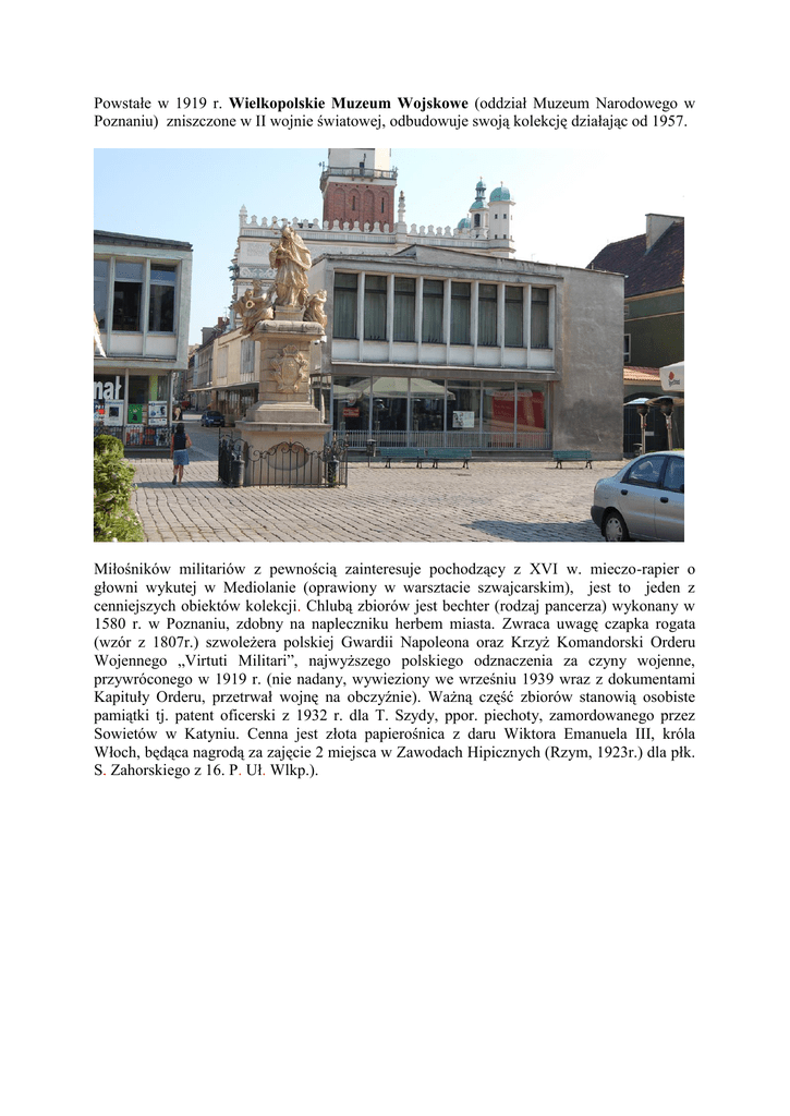 Powstałe w 1919 r. Wielkopolskie Muzeum Wojskowe (oddział Muzeum Narodowego w Poznaniu) zniszczone w II wojnie światowej, odbudowuje swoją kolekcję działając od 1957. Miłośników militariów z pewnością zainteresuje pochodzący z XVI w. mieczo-rapier o głowni wykutej w Mediolanie (oprawiony w warsztacie szwajcarskim), jest to jeden z cenniejszych obiektów kolekcji. Chlubą zbiorów jest bechter (rodzaj pancerza) wykonany w 1580 r. w Poznaniu, zdobny na napleczniku herbem miasta. Zwraca uwagę czapka rogata (wzór z 1807r.) szwoleżera polskiej Gwardii Napoleona oraz Krzyż Komandorski Orderu Wojennego „Virtuti Militari”, najwyższego polskiego odznaczenia za czyny wojenne, przywróconego w 1919 r. (nie nadany, wywieziony we wrześniu 1939 wraz z dokumentami Kapituły Orderu, przetrwał wojnę na obczyźnie). Ważną część zbiorów stanowią osobiste pamiątki tj. patent oficerski z 1932 r. dla T. Szydy, ppor. piechoty, zamordowanego przez Sowietów w Katyniu. Cenna jest złota papierośnica z daru Wiktora Emanuela III, króla Włoch, będąca nagrodą za zajęcie 2 miejsca w Zawodach Hipicznych (Rzym, 1923r.) dla płk. S. Zahorskiego z 16. P. Uł. Wlkp.).
