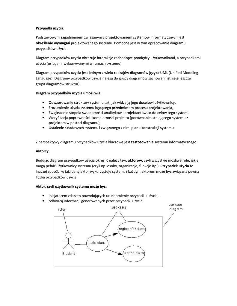 Przypadki użycia. Podstawowym zagadnieniem związanym z projektowaniem systemów informatycznych jest określenie wymagań projektowanego systemu. Pomocne jest w tym opracowanie diagramu przypadków użycia. Diagram przypadków użycia obrazuje interakcje zachodzące pomiędzy użytkownikami, a przypadkami użycia (usługami wykonywanymi w ramach systemu). Diagram przypadków użycia jest jednym z wielu rodzajów diagramów języka UML (Unified Modeling Language). Diagramy przypadków użycia należą do grupy diagramów zachowań (istnieje jeszcze grupa diagramów struktur). Diagram przypadków użycia umożliwia: • • • • • Odwzorowanie struktury systemu tak, jak widzą ją jego docelowi użytkownicy, Zrozumienie użycia systemu będącego przedmiotem procesu projektowania, Zwiększenie stopnia świadomości analityków i projektantów co do celów tego systemu Weryfikacja poprawności i kompletności projektu (porównanie istniejącego systemu z projektem w postaci diagramu), Ustalenie składowych systemu i związanego z nimi planu konstrukcji systemu. Z perspektywy diagramu przypadków użycia kluczowe jest zastosowanie systemu informatycznego. Aktorzy. Budując diagram przypadków użycia określić należy tzw. aktorów, czyli wszystkie możliwe role, jakie mogą pełnić użytkownicy systemu (czyli np. osoby, organizacje, funkcje itp.). Przypadek użycia to inaczej sposób, w jaki dany aktor wykorzystuje system, z każdym aktorem może być związana pewna liczba przypadków użycia. Aktor, czyli użytkownik systemu może być: • • inicjatorem zdarzeń powodujących uruchomienie przypadku użycia, odbiorcą informacji generowanych przez przypadki użycia. Zastosowanie. Przykładowo, diagram przypadków użycia jest odpowiedni dla opisu zbioru zastosowań systemu bazodanowego przez jego użytkowników. Diagram taki nie nadaje się z kolei dla opisu protokołu sieciowego TCP/IP, ze względu na mnogość przypadków, wyjątków i zależności. Przykład. Poniższy przykład przedstawia zastosowanie aparatu fotograficznego. • • Aktorem jest fotograf. Przypadki użycia to wykonywanie zdjęć i zmiana filmu. Wykonanie zdjęcia może się wiązać z włączeniem aparatu i uruchomieniem lampy, ale aktywności te są na zbyt wysokim poziomie szczegółowości, by umieszczać je w diagramie przypadków użycia. Powiązania między przypadkami użycia: • Zwykłe powiązanie aktora z przypadkiem użycia (Association). • Związek zawierania – jeden przypadek użycia zawiera drugi (Dependency: include). • Związek rozszerzania – jeden przypadek użycia w niektórych sytuacjach może być rozszerzony przez inny (Dependency: extend). Konieczne jest określenie warunku, którego spełnienie decyduje o rozszerzeniu przypadku użycia, a także miejsca rozszerzenia w ramach systemu. • Dziedziczenie (uogólnienie): jeden element jest rodzajem drugiego elementu (Generalization). Może zachodzić: o pomiędzy aktorami – jeden aktor odgrywa wszystkie role drugiego aktora, może dodatkowo ogrywać inne role. o Pomiędzy przypadkami użycia – jeden przypadek użycia jest uszczegółowioną wersją drugiego. Pakiety Jeżeli modelowany system składa się z kilku podsystemów, możemy wydzielić z niego tzw. pakiety. W ramach każdego pakietu możliwe jest stworzenie niezależnego diagramu przypadków użycia. Ustalenie aktorów dla diagramu systemu: • Jaka grupa użytkowników potrzebuje wspomagania ze strony systemu? • Jacy użytkownicy są konieczni do tego, aby system działał i wykonywał swoje funkcje? • Z jakiego sprzętu zewnętrznego musi korzystać system, aby zrealizować swoje funkcje? Wyszukanie potencjalnych aktorów musi być powiązane z ustaleniem granic systemu – odrzuceniem obszarów spoza danej dziedziny problemowej. Po ustaleniu aktorów należy określić: • • • • • Czy jest to aktor konkretny (konkretna osoba), czy określenie roli (np. stanowisko), Nazwę roli dla każdego aktora, Zakresy znaczeniowe dla poszczególnych nazw aktorów oraz relacje pomiędzy zakresami (np. sekretarka pracownik administracji pracownik dowolna osoba). Niekiedy warto jest ustalić hierarchię dziedziczenia dla aktorów. Opisać relacje pomiędzy konkretnymi użytkownikami i aktorami Czy użytkownik może łączyć funkcje kilku aktorów – czy możliwa jest minimalizacja liczby aktorów Przykład różnic pomiędzy konkretnymi użytkownikami a aktorami: Ustalenie przypadków użycia: • • • • • Dla każdego aktora znajdź zadania i funkcje, które powinien wykonywać, Powiąż – o ile to możliwe – w jeden przypadek użycia zbiór funkcji realizujących ten sam cel. Nazwy powinny odzwierciedlać czynność z punktu widzenia aktora, nie systemu. Przypadkom można nadać opis w języku naturalnym. Uporządkuj aktorów i przypadki użycia w postaci diagramu. Ćwiczenia. 1. Rozbuduj podany przykład systemu obsługi zamówień jako dwa podsystemy: • • Składanie zamówień (aktorzy: klient, przedstawiciel handlowy), Realizacja zamówień (przygotowanie zamówień, wysyłka, księgowanie, obsługa magazynu…) 2. Zaproponuj diagram przypadków użycia dla prywatnego gabinetu medycznego (rejestracja, wykonywanie zabiegów, dokumentacja)