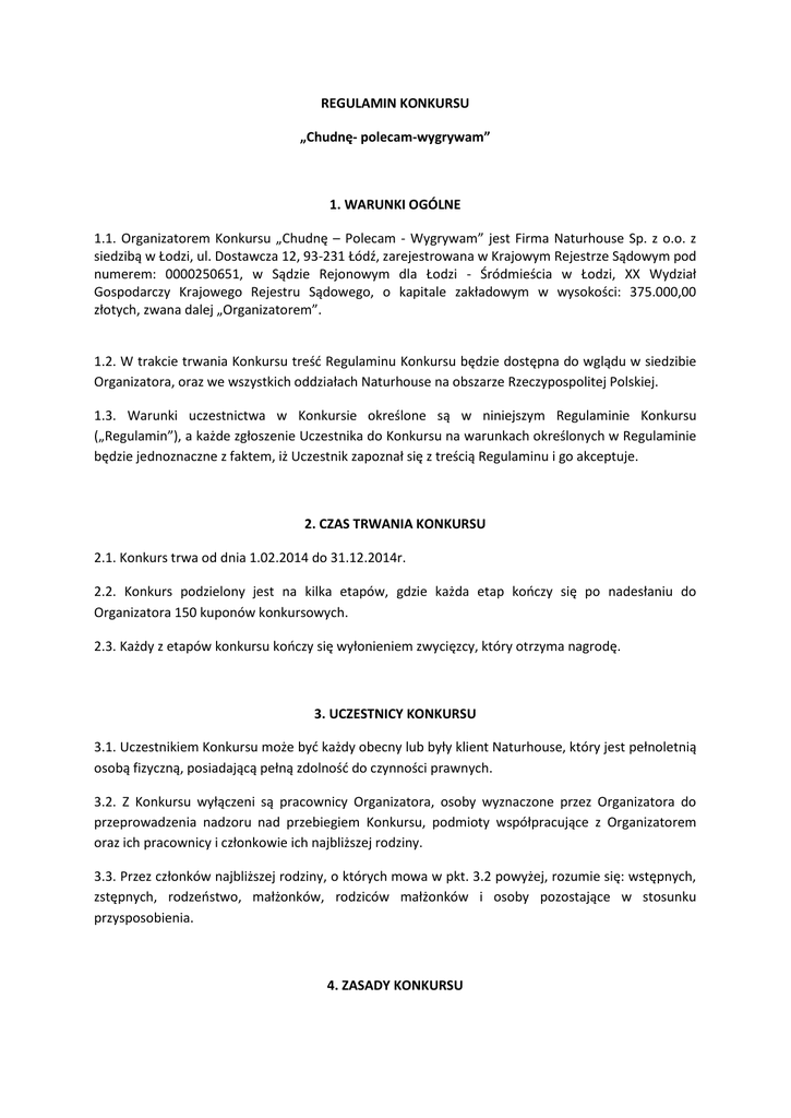 REGULAMIN KONKURSU „Chudnę- polecam-wygrywam” 1. WARUNKI OGÓLNE 1.1. Organizatorem Konkursu „Chudnę – Polecam - Wygrywam” jest Firma Naturhouse Sp. z o.o. z siedzibą w Łodzi, ul. Dostawcza 12, 93-231 Łódź, zarejestrowana w Krajowym Rejestrze Sądowym pod numerem: 0000250651, w Sądzie Rejonowym dla Łodzi - Śródmieścia w Łodzi, XX Wydział Gospodarczy Krajowego Rejestru Sądowego, o kapitale zakładowym w wysokości: 375.000,00 złotych, zwana dalej „Organizatorem”. 1.2. W trakcie trwania Konkursu treść Regulaminu Konkursu będzie dostępna do wglądu w siedzibie Organizatora, oraz we wszystkich oddziałach Naturhouse na obszarze Rzeczypospolitej Polskiej. 1.3. Warunki uczestnictwa w Konkursie określone są w niniejszym Regulaminie Konkursu („Regulamin”), a każde zgłoszenie Uczestnika do Konkursu na warunkach określonych w Regulaminie będzie jednoznaczne z faktem, iż Uczestnik zapoznał się z treścią Regulaminu i go akceptuje. 2. CZAS TRWANIA KONKURSU 2.1. Konkurs trwa od dnia 1.02.2014 do 31.12.2014r. 2.2. Konkurs podzielony jest na kilka etapów, gdzie każda etap kończy się po nadesłaniu do Organizatora 150 kuponów konkursowych. 2.3. Każdy z etapów konkursu kończy się wyłonieniem zwycięzcy, który otrzyma nagrodę. 3. UCZESTNICY KONKURSU 3.1. Uczestnikiem Konkursu może być każdy obecny lub były klient Naturhouse, który jest pełnoletnią osobą fizyczną, posiadającą pełną zdolność do czynności prawnych. 3.2. Z Konkursu wyłączeni są pracownicy Organizatora, osoby wyznaczone przez Organizatora do przeprowadzenia nadzoru nad przebiegiem Konkursu, podmioty współpracujące z Organizatorem oraz ich pracownicy i członkowie ich najbliższej rodziny. 3.3. Przez członków najbliższej rodziny, o których mowa w pkt. 3.2 powyżej, rozumie się: wstępnych, zstępnych, rodzeństwo, małżonków, rodziców małżonków i osoby pozostające w stosunku przysposobienia. 4. ZASADY KONKURSU 4.1. Warunkiem wzięcia udziału w Konkursie jest wypełnienie kuponu konkursowego i przesłanie go na adres: Naturhouse Sp. z o.o. ul. Dostawcza 12, 93-231 Łódź lub przekazanie go do oddziału Naturhouse na terenie Rzeczypospolitej Polskiej, który wykona taką wysyłkę. Organizator zobowiązuje się do zebrania kuponów. 4.2. W konkursie biorą udział tylko prawidłowo i kompletnie wypełnione kupony. 4.3. Poprzez prawidłowe wypełnienie kuponu rozumie się: wpisanie 3 imion i nazwisk oraz numerów telefonu osób, którym zostało polecone konkretne Centrum Dietetyczne Naturhouse; osoby te odbyły minimum jedną wizytę zakończoną zakupem za minimum 100zł. Na kuponie należy również wpisać numer paragonu lub faktury, jako dowodu odbycia wizyty każdej z trzech osób. Na kuponie powinno znaleźć się również imię i nazwisko właściciela kuponu oraz pieczęć placówki Naturhouse do której uczęszcza. Uczestnik powinien również dokończy zdanie (Zdanie Konkursowe): „Polecam wszystkim usługi Naturhouse, ponieważ .............” dowolnie formułując wypowiedź. 4.3 a. Osoba, której zostało zarekomendowane Centrum Naturhouse nie może powtarzać się na kuponach różnych uczestników. 4.3 b. Uczestnik może wielokrotnie brać udział w Konkursie, ale za pomocą nowego kuponu. Na kolejnych kuponach nie mogą sie powtarzać te same nazwiska osób, którym polecone zostało dane Centrum Dietetyczne Naturhouse. 4.4. W każdym etapie konkursu, o którym mowa w pkt. 2.2. Zwycięzcą zostaje autor, który w najciekawszy sposób dokończy Zdanie Konkursowe, o którym mowa w pkt. 4.3. O tym, która odpowiedź jest najciekawsza decyduje Organizator. 4.5. Każdy etap konkursu, o którym mowa w pkt. 2.2 będzie rozstrzygany w ciągu 10 dni roboczych od zakończenia etapu. 4.6. W każdym etapie wygrywa tylko jeden kupon, pozostałe 149 kuponów jest niszczone, czyli jeden kupon bierze udział tylko w jednym etapie konkursu. 4.7. Nad prawidłowym przebiegiem konkursu czuwa 3-osobowa komisja wyłoniona przez Organizatora Konkursu. 4.8. Informację o wygranej Zwycięzca otrzyma listownie lub telefonicznie, a wyniki będą publikowane na stronie www Organizatora. 4.9. Jeżeli nie będą mogli zostać wyłonieni Zwycięzcy – nie będzie ani jednego zgłoszenia, to zgodnie z postanowieniami Regulaminu, nieprzyznana Nagroda pozostaje w dyspozycji Organizatora. 5. PRZETWARZANIE DANYCH OSOBOWYCH 5.1. Organizator oświadcza, iż wszystkie dane na kuponach konkursowych będą wykorzystywane wyłącznie w zakresie niezbędnym do przeprowadzenia Konkursu oraz wyłonienia jego Zwycięzców, a po zakończeniu Konkursu i upływie terminu do rozpatrzenia reklamacji zostaną zniszczone. 5.2. Imię i nazwisko Zwycięzcy/Nick Zwycięzcy zostanie zamieszczony na stronie www.naturhouse.com.pl oraz na http://facebook.com/naturhousepolska Jeżeli Zwycięzca nie zgadza się na opublikowanie jego danych na ww. stronie, powinien wysłać na adres [email protected] sprzeciw wobec zamieszczenia danych na ww. stronie. 5.3. Wysłanie przez Uczestnika zgłoszenia w ramach Konkursu jest jednoznaczne z zaakceptowaniem przez Uczestnika zasad Konkursu opisanych w Regulaminie. 5.4. Aby wziąć udział w konkursie uczestnik oraz osoby przez niego zarekomendowane są zobowiązani do przekazania zgody na przetwarzanie danych osobowych dla celów związanych z przeprowadzeniem Konkursu. Poszczególne oddziały Naturhouse są zobowiązane do zebrania takiej zgody od uczestników i przechowywania ich w bezpiecznym miejscu. 5.5. Uczestnik biorąc udział w Konkursie wyraża zgodę na przesyłanie informacji handlowej za pośrednictwem środków komunikacji elektronicznej, a w szczególności poczty elektronicznej zgodnie ustawą z dnia 18 lipca 2002r. - o świadczeniu usług drogą elektroniczną (Dz. U nr 144 poz.1204 z 2002r. z późn. zm.). 6. NAGRODY 6.1. Nagrodami w Konkursie są tygodniowe 2-osobowe pobyty w ekskluzywnym Hotelu HealtHouse***** w Hiszpanii w mieście Ma