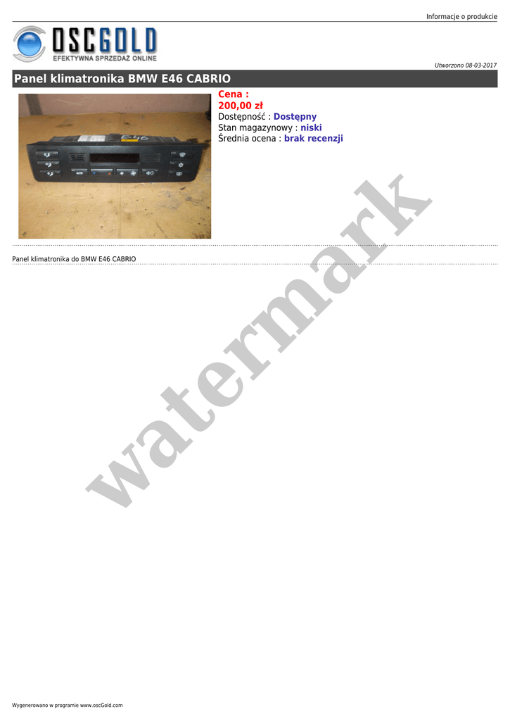 Informacje o produkcie Utworzono 08-03-2017 Panel klimatronika BMW E46 CABRIO Cena : 200,00 zł w at Panel klimatronika do BMW E46 CABRIO er m ar k Dostępność : Dostępny Stan magazynowy : niski Średnia ocena : brak recenzji Wygenerowano w programie www.oscGold.com