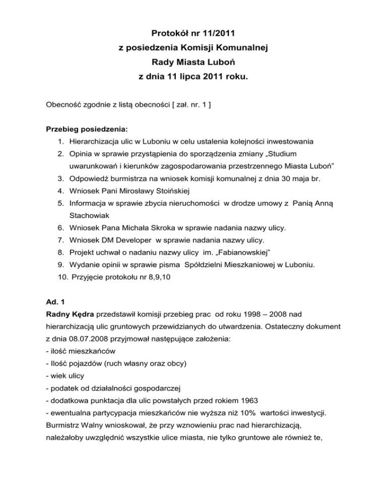 Protokół nr 11/2011 z posiedzenia Komisji Komunalnej Rady Miasta Luboń z dnia 11 lipca 2011 roku. Obecność zgodnie z listą obecności [ zał. nr. 1 ] Przebieg posiedzenia: 1. Hierarchizacja ulic w Luboniu w celu ustalenia kolejności inwestowania 2. Opinia w sprawie przystąpienia do sporządzenia zmiany „Studium uwarunkowań i kierunków zagospodarowania przestrzennego Miasta Luboń” 3. Odpowiedź burmistrza na wniosek komisji komunalnej z dnia 30 maja br. 4. Wniosek Pani Mirosławy Stoińskiej 5. Informacja w sprawie zbycia nieruchomości w drodze umowy z Panią Anną Stachowiak 6. Wniosek Pana Michała Skroka w sprawie nadania nazwy ulicy. 7. Wniosek DM Developer w sprawie nadania nazwy ulicy. 8. Projekt uchwał o nadaniu nazwy ulicy im. „Fabianowskiej” 9. Wydanie opinii w sprawie pisma Spółdzielni Mieszkaniowej w Luboniu. 10. Przyjęcie protokołu nr 8,9,10 Ad. 1 Radny Kędra przedstawił komisji przebieg prac od roku 1998 – 2008 nad hierarchizacją ulic gruntowych przewidzianych do utwardzenia. Ostateczny dokument z dnia 08.07.2008 przyjmował następujące założenia: - ilość mieszkańców - Ilość pojazdów (ruch własny oraz obcy) - wiek ulicy - podatek od działalności gospodarczej - dodatkowa punktacja dla ulic powstałych przed rokiem 1963 - ewentualna partycypacja mieszkańców nie wyższa niż 10% wartości inwestycji. Burmistrz Walny wnioskował, że przy wznowieniu prac nad hierarchizacją, należałoby uwzględnić wszystkie ulice miasta, nie tylko gruntowe ale również te, których nawierzchnia wymaga gruntownego remontu lub przebudowy a są to ulice tranzytowe. Radni zastanawiali się czy jest sens powrotu do prac nad hierarchizacją z powodu braku pieniędzy na realizację. Również nowopowstałe osiedla na Jana Pawła II oraz Wschodniej, z powodu największej ilości mieszkańców, burzą koncepcję poprzedniej hierarchizacji. W związku z wątpliwościami radnych, komisja postanowiła zagłosować nad WNIOSKIEM Czy komisja wyraża wolę przystąpienia do prac nad nowelizacją hierarchizacji ulic ? Przebieg głosowania Za - 4 głosy Przeciw - 3 głosy Wstrzymało się - 2 Komisja uznała za zasadne przystąpienie do praz nad hierarchizacją ulic. Ad. 2 Przystąpiono do głosowania nad przyjęciem zmian „Studium uwarunkowań i kierunków zagospodarowania przestrzennego Miasta Luboń” Przebieg głosowania Za – 9 głosów Przeciw 0 Wstrzymało się 0 Komisja pozytywnie zaopiniowała projekt uchwały Ad.3 Odpowiedź burmistrza dot. sprzedaży przez Miasto Luboń, w trybie bezprzetargowym nieruchomości położonych przy ul. Niepodległości. Burmistrz odrzucił wniosek komisji, podtrzymując swoje poprzednie stanowisko. Uzasadnienie burmistrza, komisja uznała za wystarczające. Ad. 4 Wniosek zawierał prośbę o naprawę chodnika na ul. Wojska Polskiego na wysokości nr 104 oraz obniżenia chodnika na wysokości nr 102 Komisja przekazała wniosek burmistrzowi Ad. 5 Wydział Spraw Komunalnych zaproponował właścicielowi wymianę działki położonej przy ul. Cmentarnej a przeznaczonej na budowę parkingu (inwestycja miejska) na działkę położoną przy ul. Granicznej a przeznaczoną pod zabudowę jednorodzinną. Po dyskusji komisja sformułowała WNIOSEK Komisja komunalna proponuje aby odstąpić od tej umowy a w zamian za to przystąpić do wykupu gruntów, które są niezbędne miastu. Natomiast działki miejskie - sprzedać. Przebieg głosowania Za 8 Przeciw 0 Wstrzymało się 1 Ad.6 Wnioskodawca proponuje nazwanie ślepej ulicy dojazdowej o statucie prywatnym (prostopadła do ul. Nowiny) nazwą „Janowa Dolina”, natomiast propozycja poprzedniej komisji to nadanie ulicy im. Heleny Modrzejewskiej Przebieg głosowania Za nadaniem nazwy ulicy im. „ Heleny Modrzejewskiej” głosowało 2 radnych Za nadaniem nazwy ulicy im. „Janowej Doliny” głosowało 6 radnych Głosów przeciwnych nie było Wstrzymała się 1 osoba Komisja postanowiła przyjąć propozycję mieszkańca i mianować ul. „Janowa Dolina” Ad.7 Wnioskodawca proponuje nadanie nazwy ulicy o statucie wewnętrznym, która powstanie na nowym osiedlu przy ul. Żabikowskiej. Propozycje wnioskodawcy to: Sezamkowa, Zacisze, Jutrzenki, Piękna lub Przyjazna. Po wstępnej weryfikacji komisja przystąpiła do głosowania Przebieg głosowania Za nadaniem nazwy ulicy im. „ Jutrzenki ” głosowało 4 radnych Za nadaniem nazwy ulicy im. „Przyjazna” głosowało 5 radnych Komisja postanowiła przyjąć propozycję wnioskodawcy i mianować ul. „Przyjazną” Ad. 8 Komisja przystąpiła do głosowania nad przyjęciem nazwy ul.”Fabianowskiej” Przebieg głosowania Za 9 Przeciw 0 Wstrzymało się 0 Ad. 9 Komisja poprzez aklamację potrzymała stanowisko burmistrza w sprawie udzielenia bonifikaty od opłaty z tytułu przekształcenia praw użytkowania wieczystego w prawo własności nieruchomości położonej przy ul. Sikorskiego 41/43 w wysokości 60% z rozłożeniem opłaty na okres 10 lat. Ad. 10 Przyjęcie protokołu nr 8 Za 6 Przeciw 0 Wstrzymało się 2 Nie brał udziału w głosowaniu 1 Przyjęcie protokołu nr 9 Za 4 Przeciw 0 Wstrzymało się 4 Nie brał udziału w głosowaniu 1 Przyjęcie protokołu nr 10 Za 6 Przeciw 0 Wstrzymało się 2 Nie brał udziału w głosowaniu 1 Sekretarz Przewodniczący